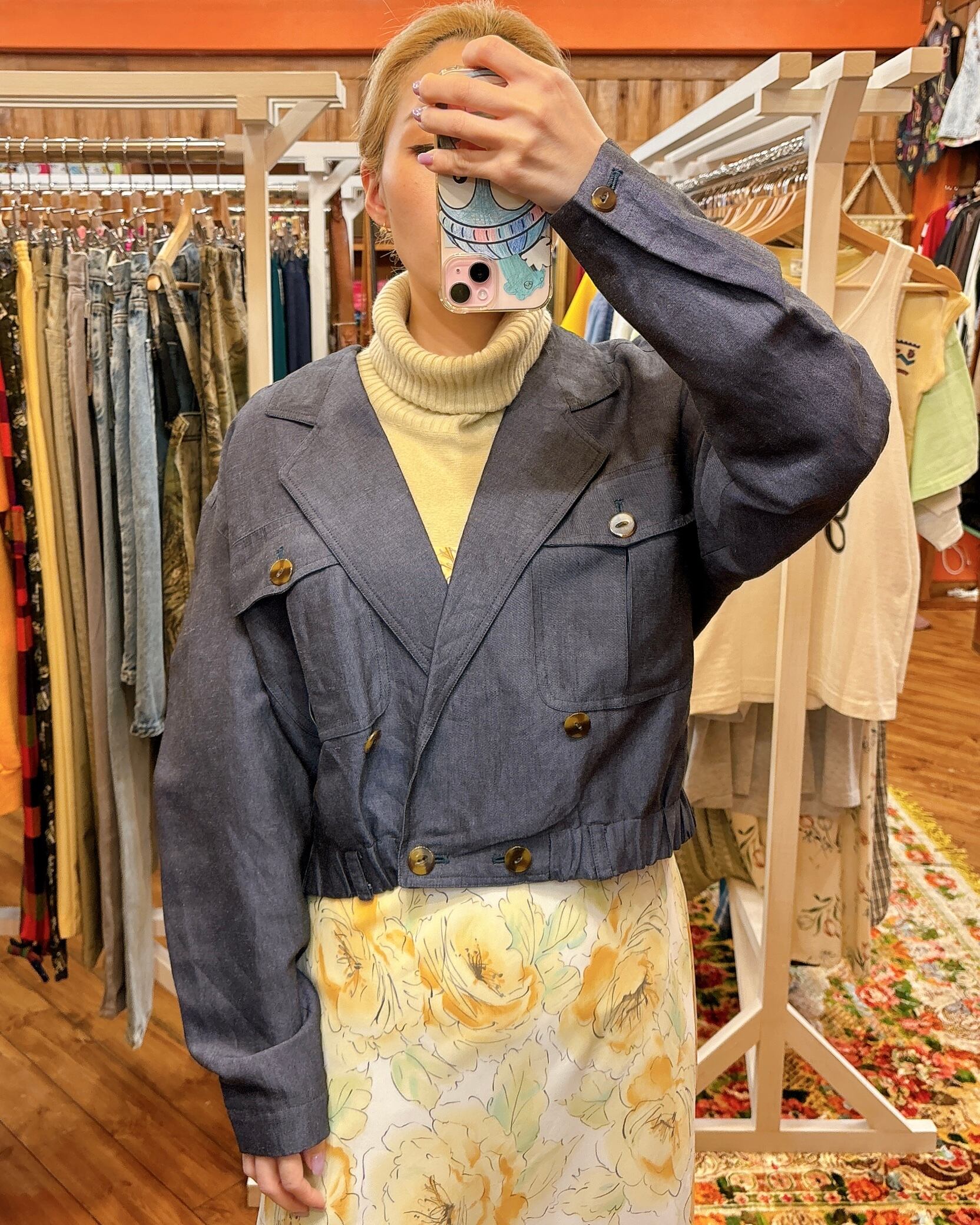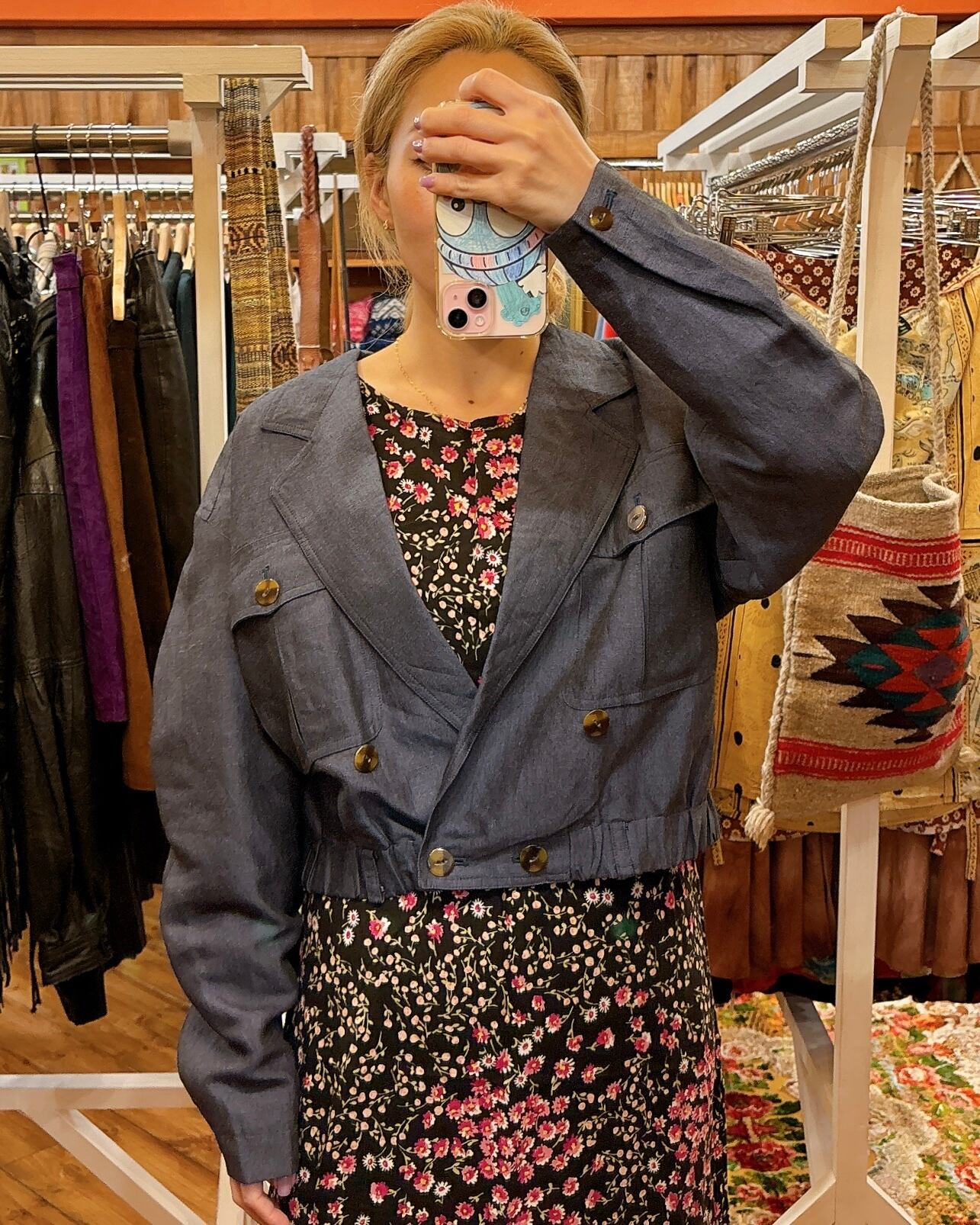 ダブルの合わせのようなショート丈デザインジャケットです。リネンとレーヨンの混紡でなめらかで薄手の生地です。軽い着心地で春夏におすすめです。