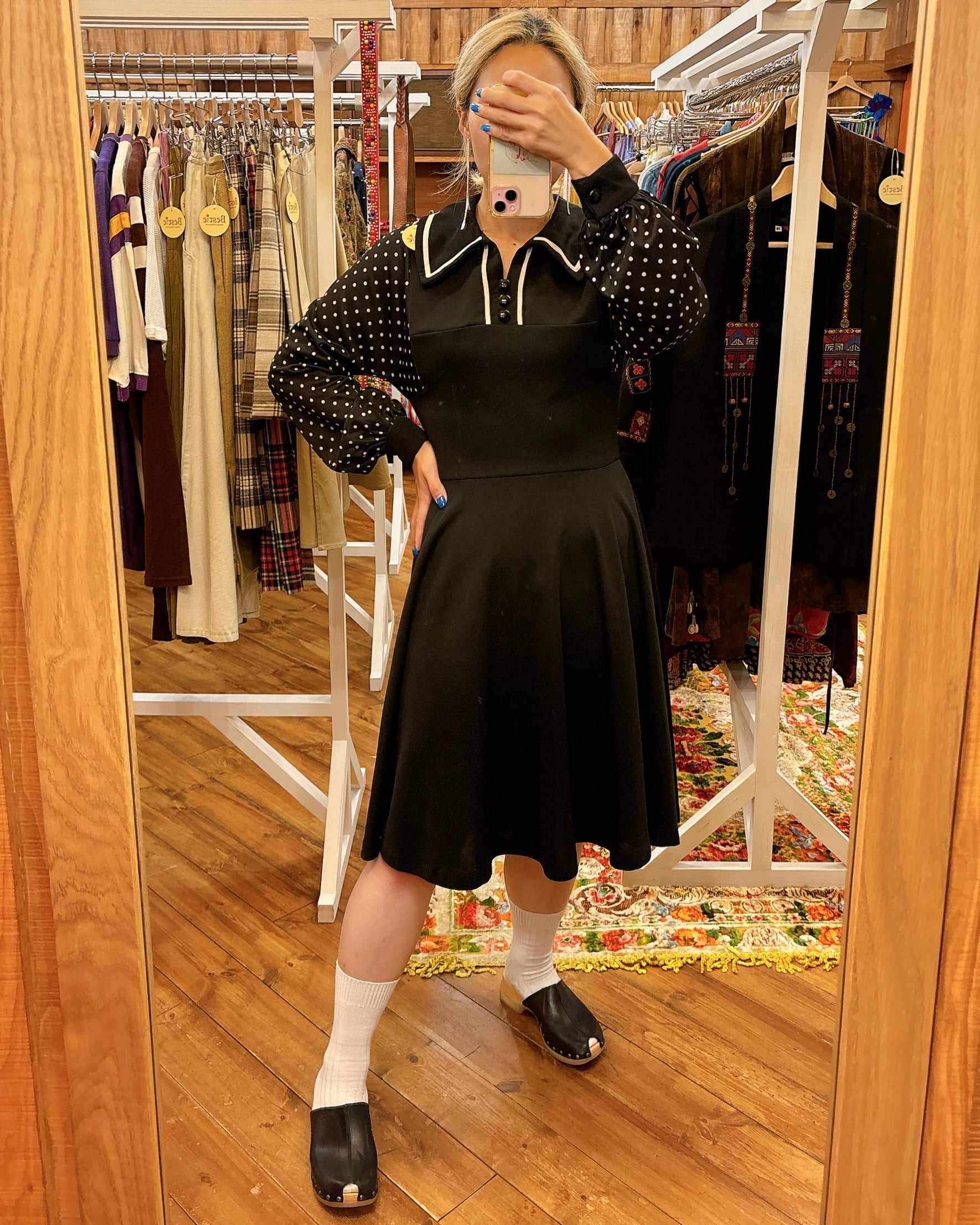 薄手のジャージ素材のような少しハリのあるポリ生地のワンピースです。えりのデザインも、少し膨らむ袖もフレアに広がるスカートもとてもかわいいです◎レトロでスポーティなニュアンスも含まれていてすごくいいと思います。