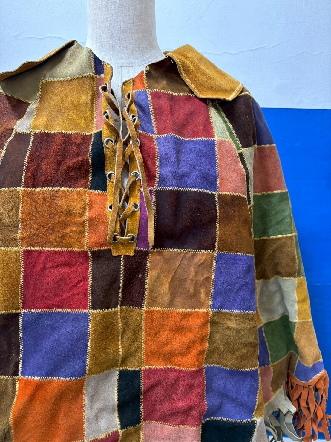 襟元はレースアップ、カラフルなパッチワークレザーのかわいいフリンジポンチョです!!