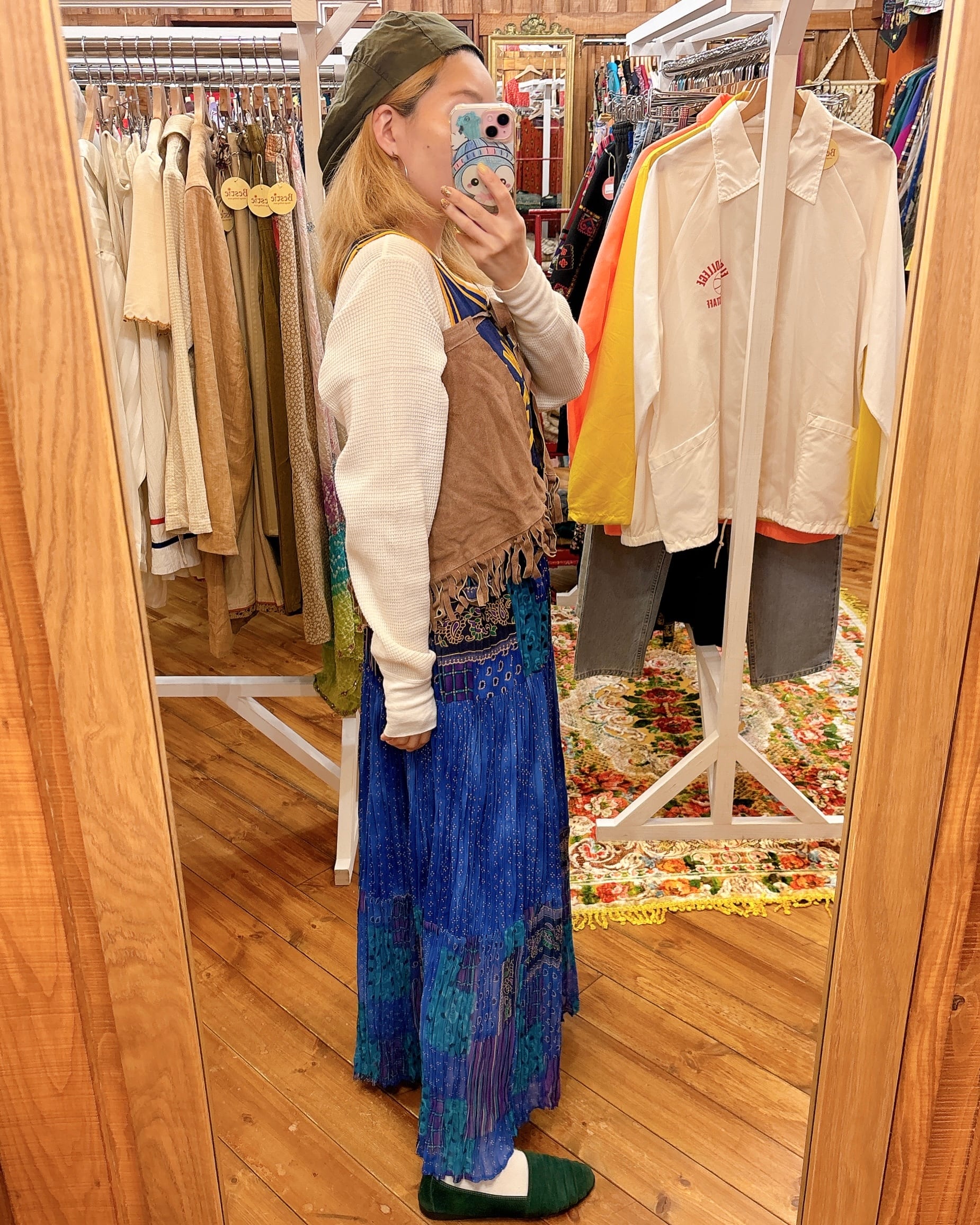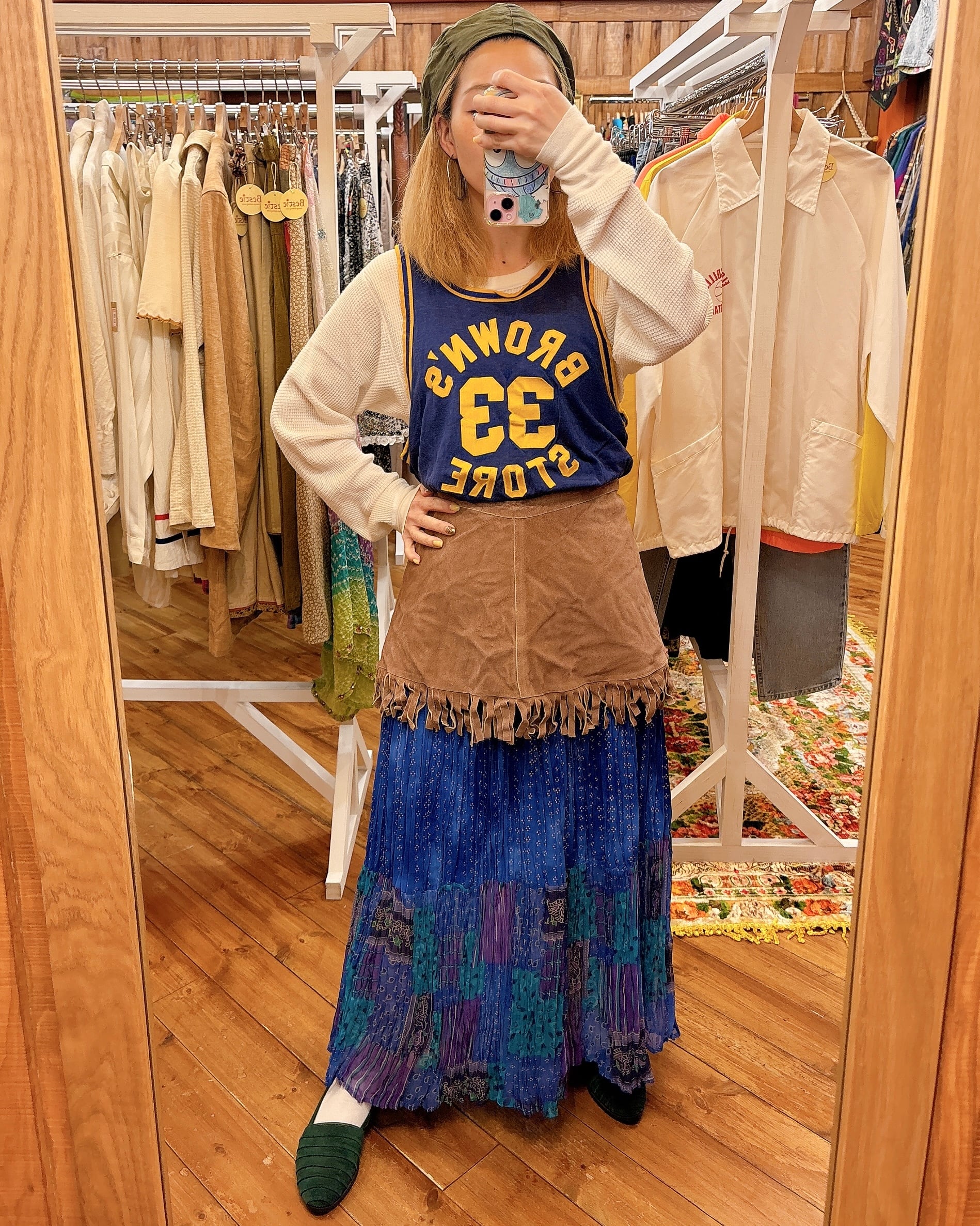 紐まで同じ素材のエプロンタイプのラップスカートです。もともと腰回り全体を包むデザインではありません。デニムパンツ、スカート、ワンピースなどメインのお洋服とレイヤードして楽しむスカートです!!カラーは茶系でちょっとグレーがかったくすみのある色に見えます。