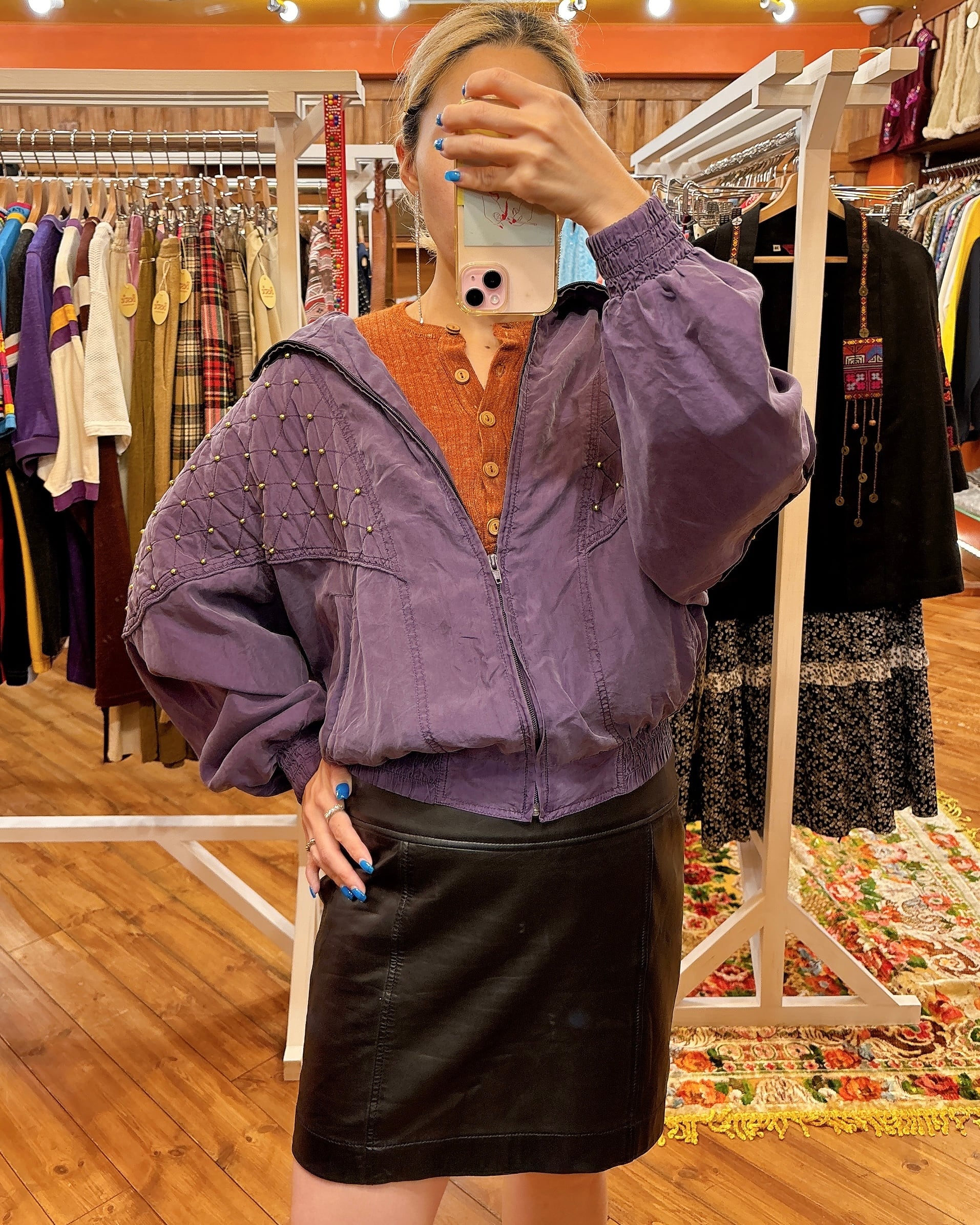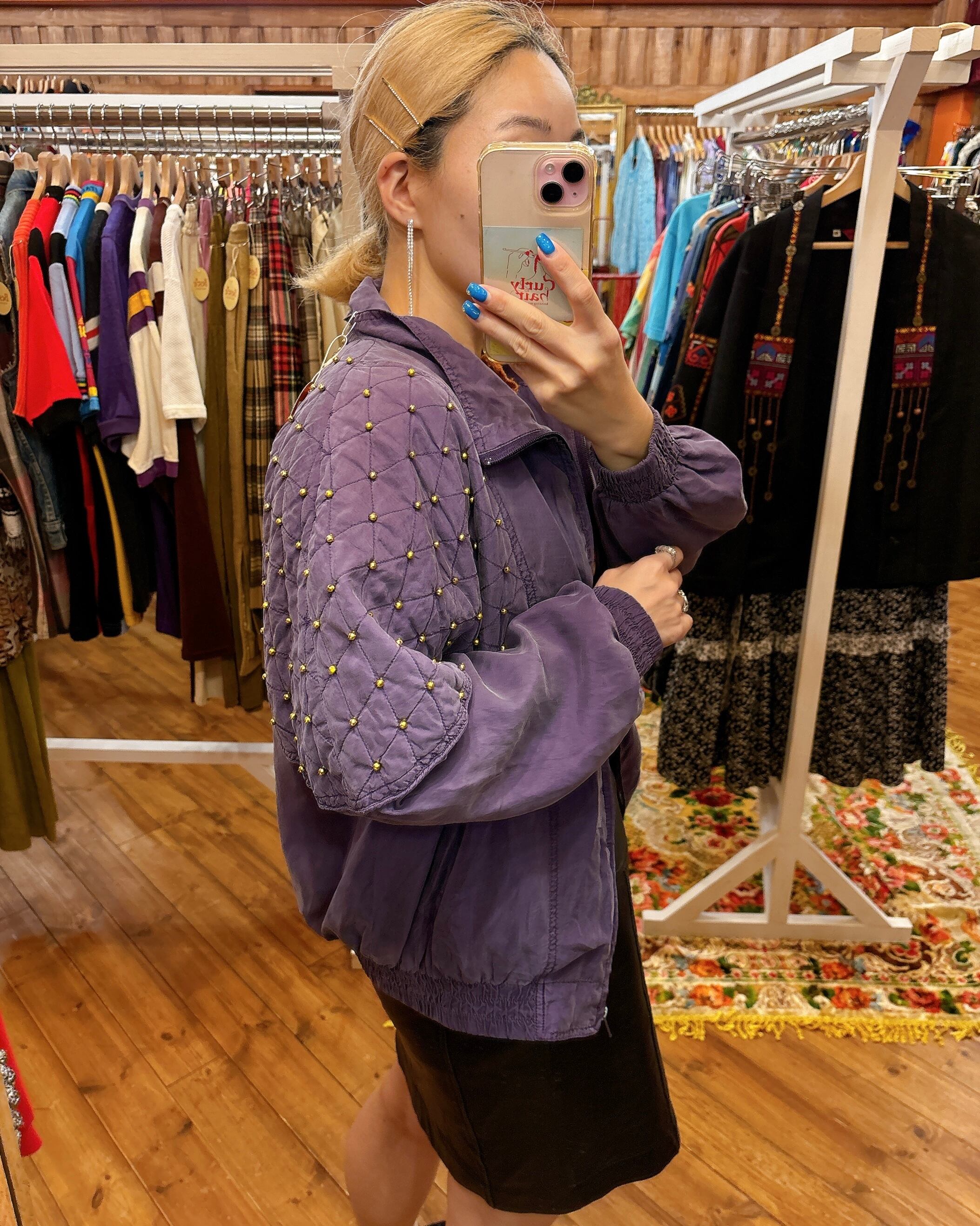 小ぶりなゴールドのビーズがキルティング部分に縫い付けてあってかわいいシルクブルゾンです。マットなカラーの紫で馴染みやすいと思います。
