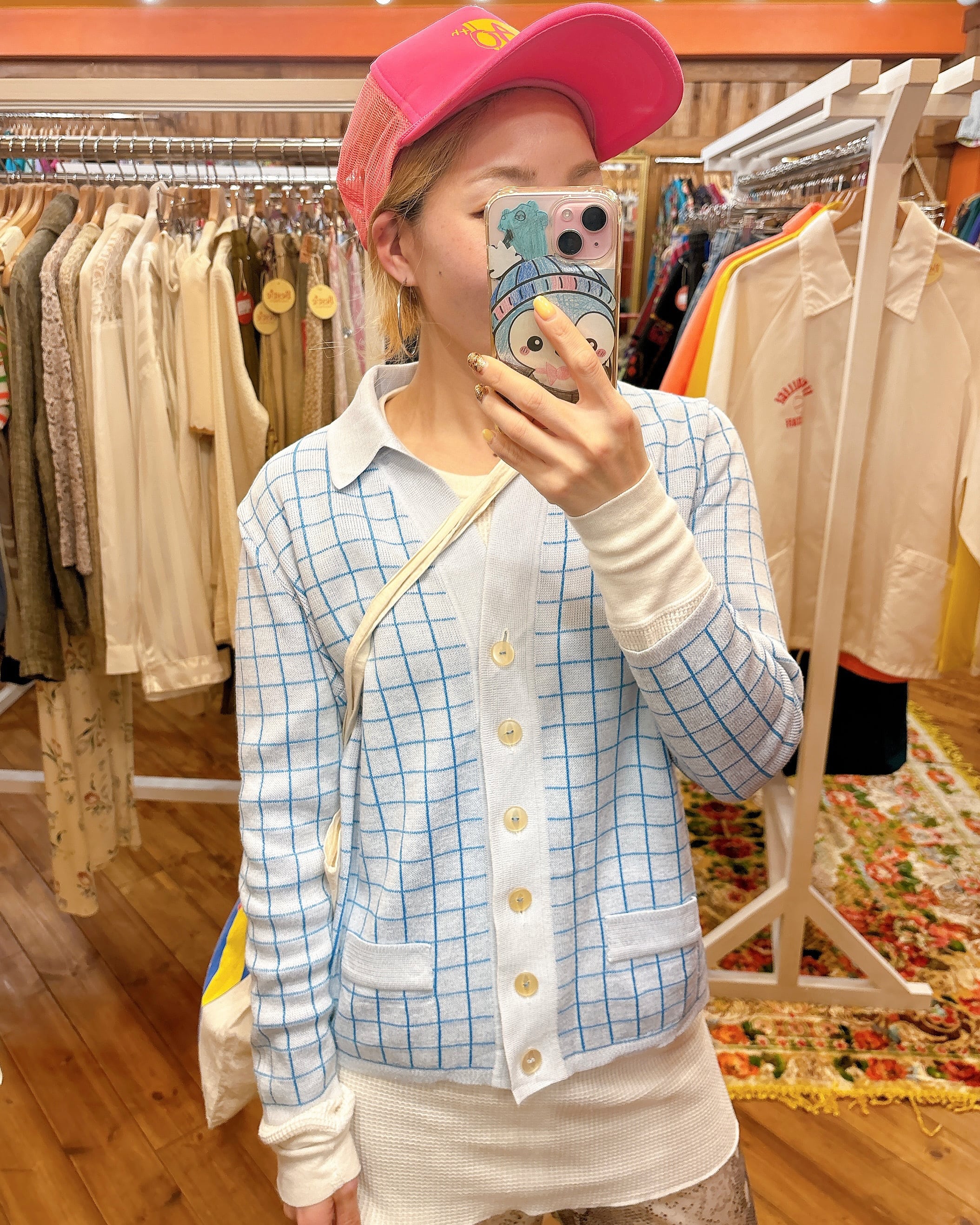 襟のついたデザインで柄もカラーも爽やかでレトロなカーディガン。かわいいです。