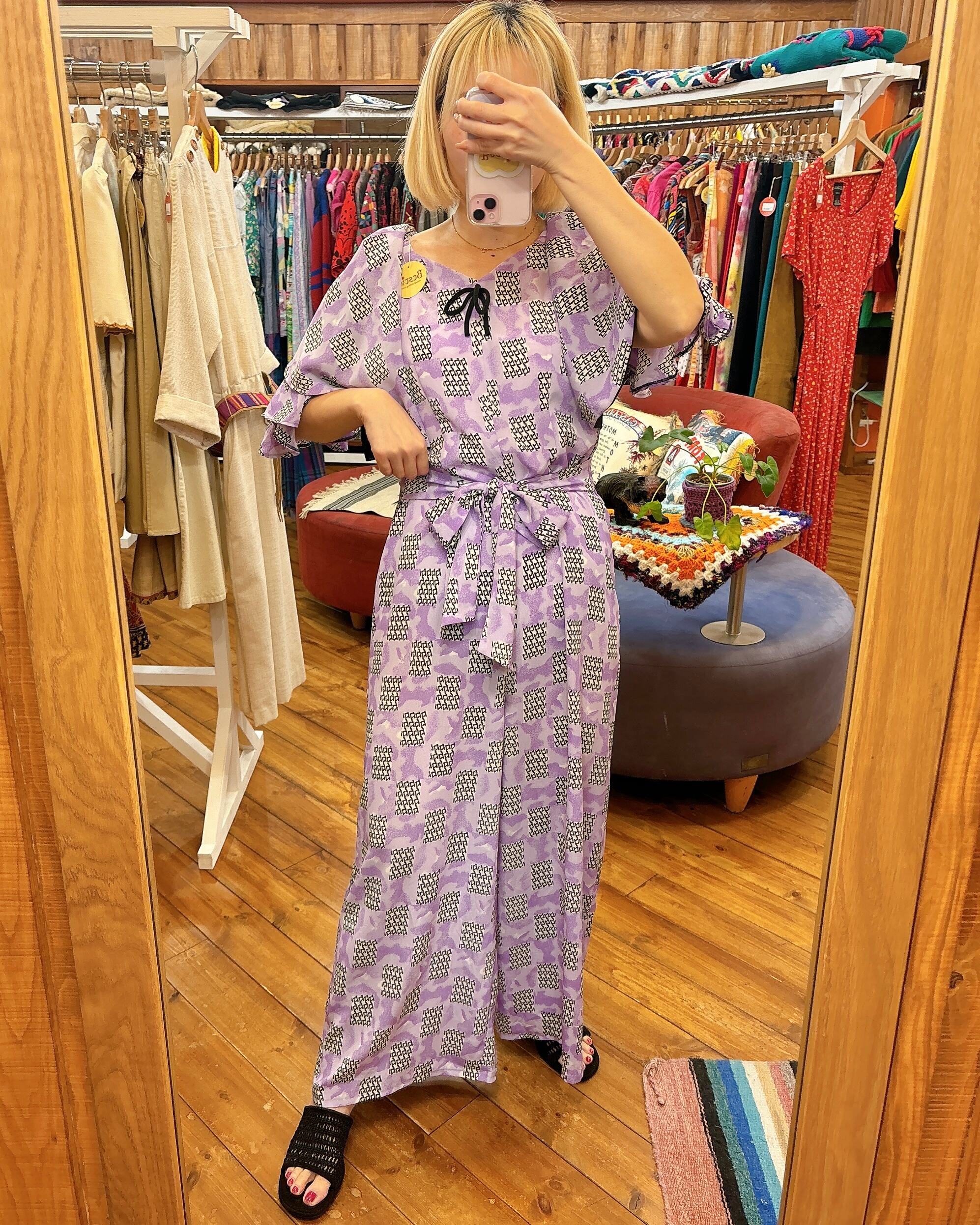 裏地無しですが透け感は特に気になりませんでした。ポケットなし。ウエストのリボンは縫い付けてあるので外せません。背中ジップで着脱するタイプです。ボトムス部分はワイドパンツで、レングス短めなので小柄な方も裾直しせず着やすいと思います。