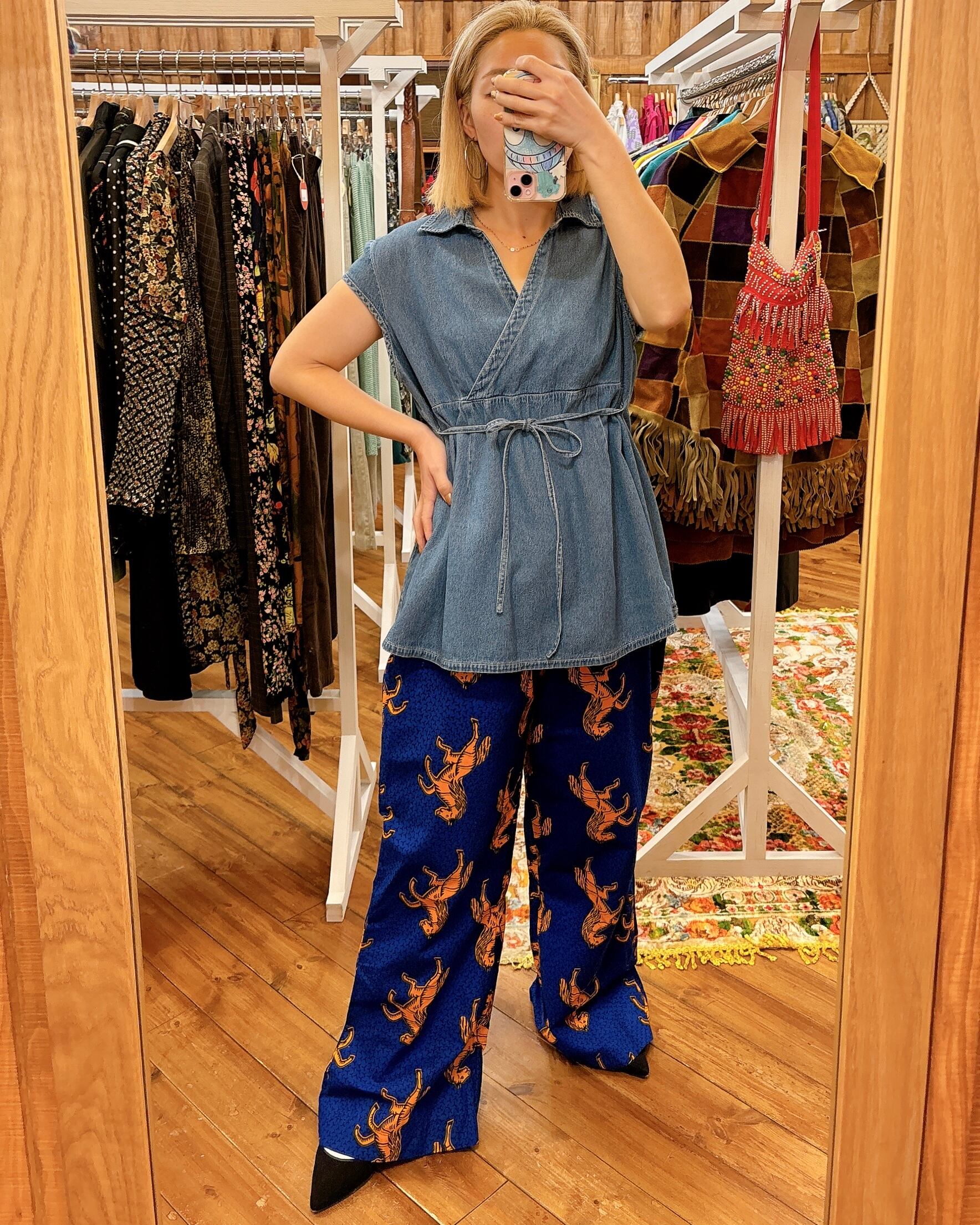 S/S フレンチスリーブ カシュクール ウエストリボン デニム トップス