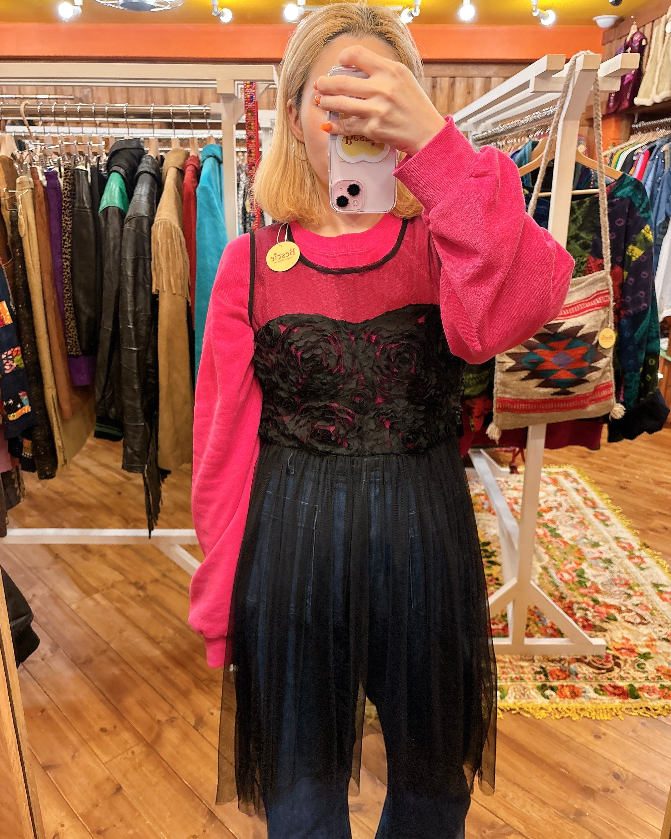 胸元にバラをあしらったようなデザインあるノースリーブチュールワンピースです。黒の透け感は重たくなくコーデがしまるのでちょっと物足りない気分の時にレイヤードでおすすめです。