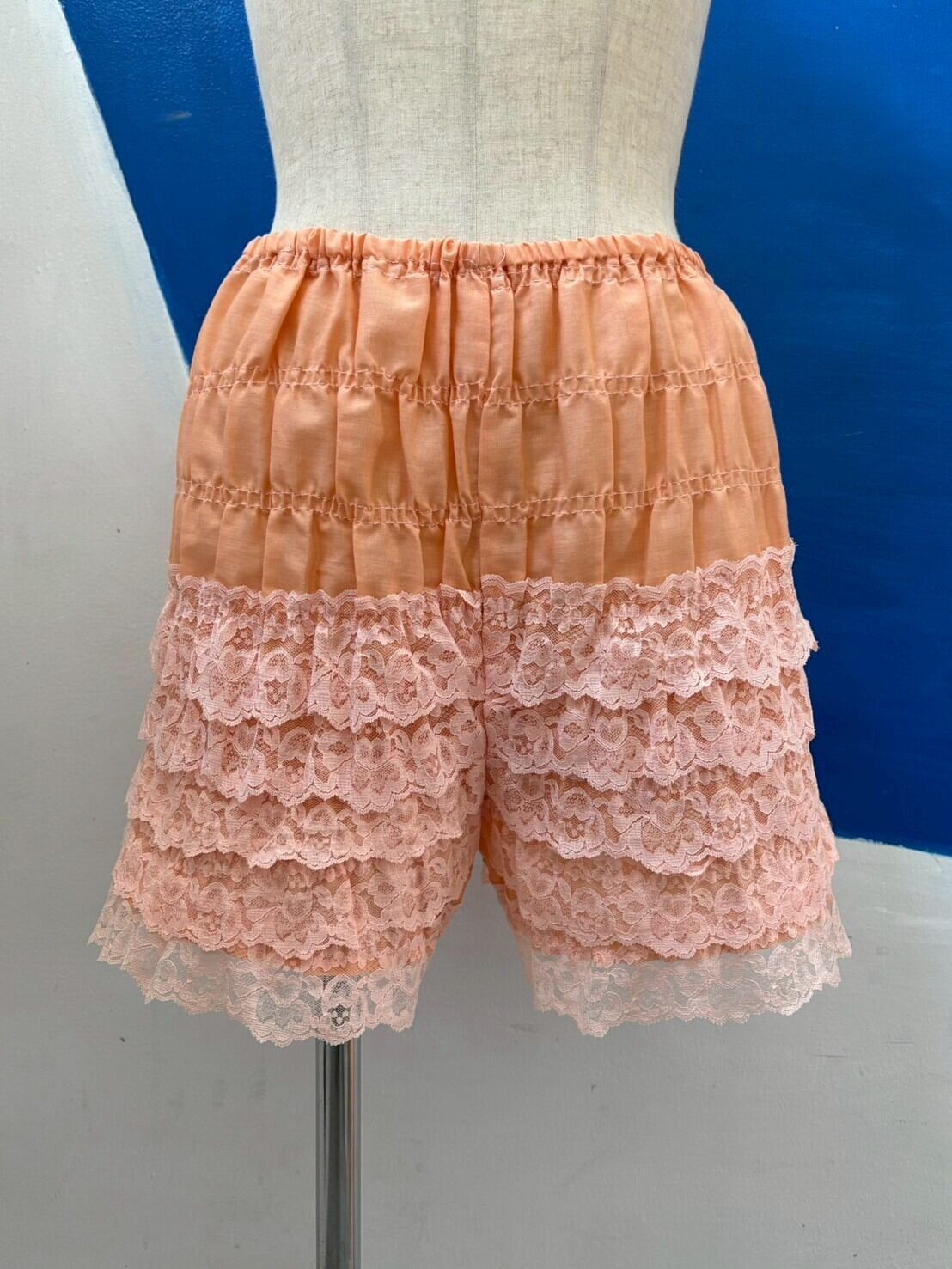 ペールオレンジの薄手の生地に薄いピンクのレースフリルが縫い付けてあるペチコートショーツです。