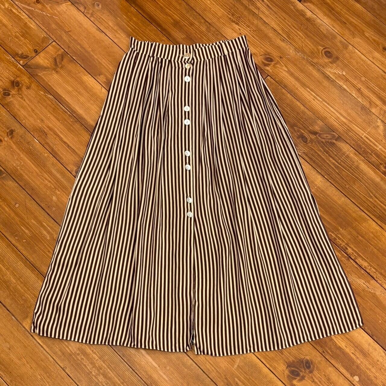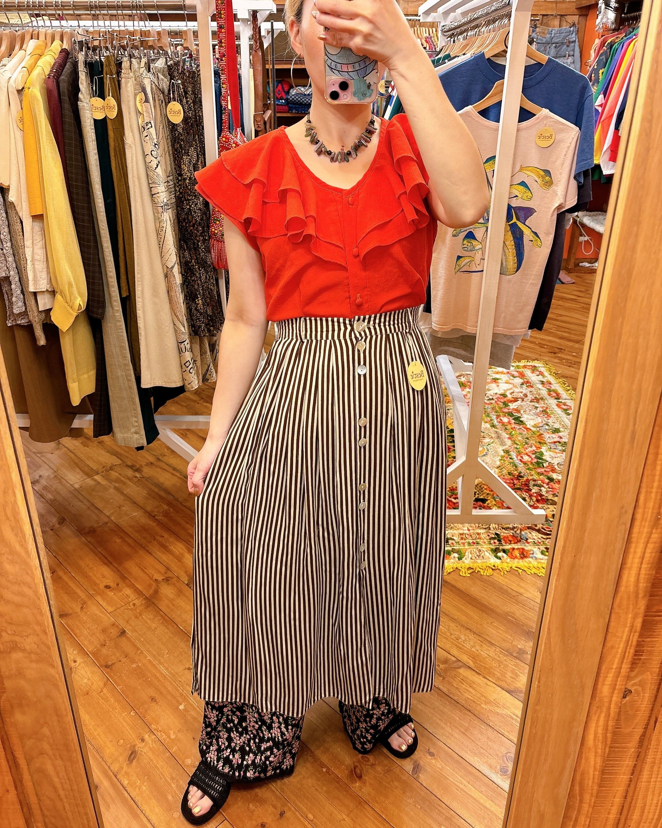 シェルボタンが爽やかでナチュラルな印象のストライプフレアスカートです。裏地なし、ベルトループ、ポケットあり。デニムとのレイヤードでも一枚でも使いやすい足首見えるくらいの着丈です。