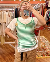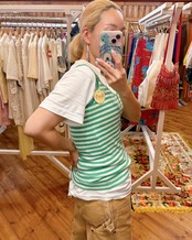 伸縮性があって着やすく、かわいいシェルボタンのデザインが付いたボーダーキャミです。