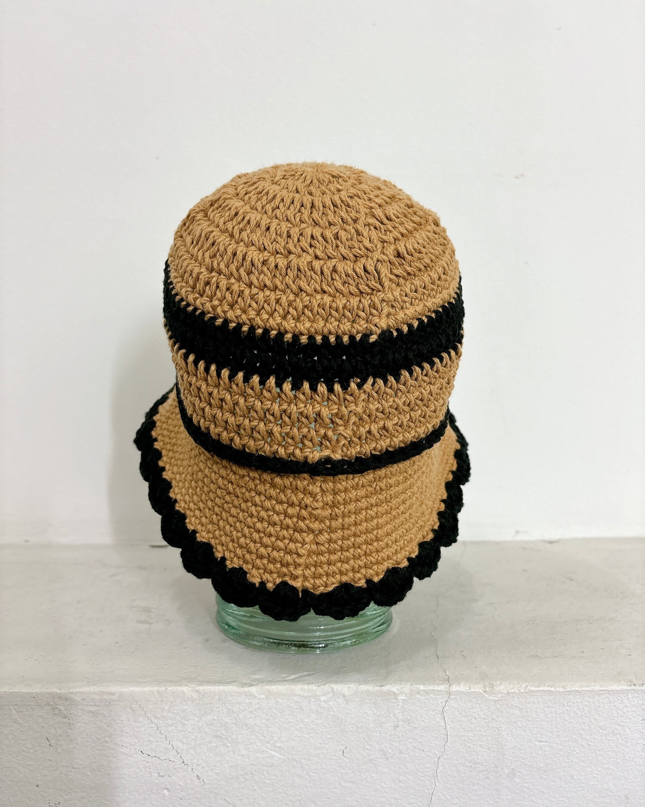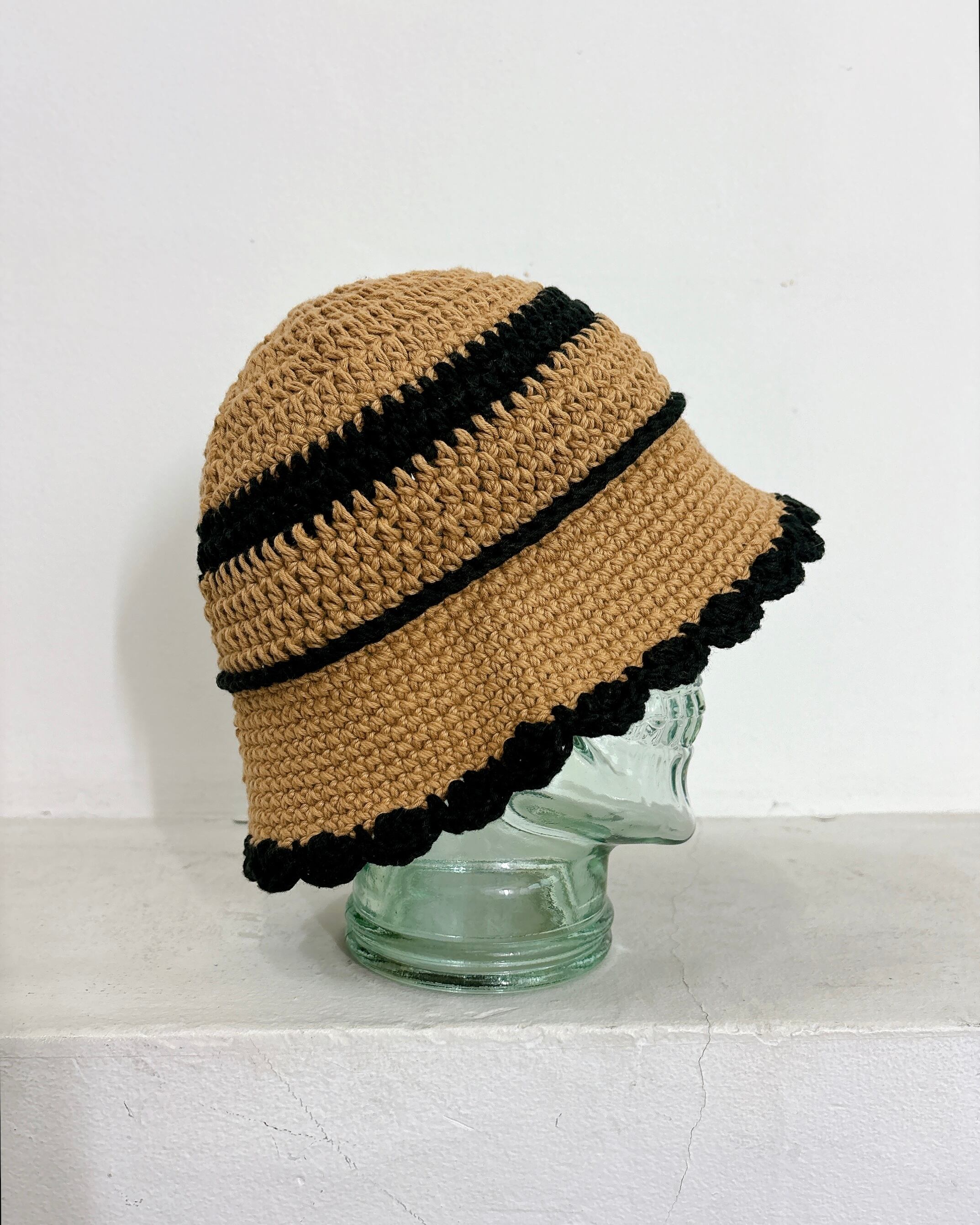 少し深めのかぶりになるボーダーラインのバケットハットです。細めのラインは立体感ある編み込みになっていてシンプルな印象ですがデザインとしてさりげないアクセントがあって素敵です。