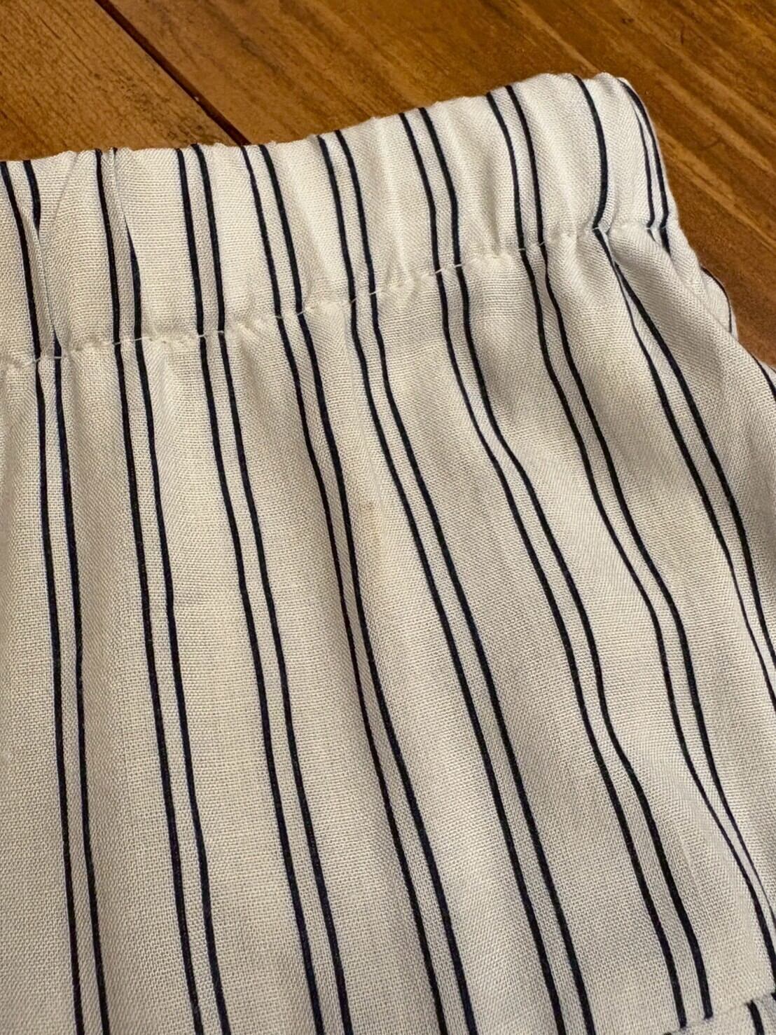 白に爽やかなネイビーのストライプがかわいいプリーツフレアシルエットのロングスカート。