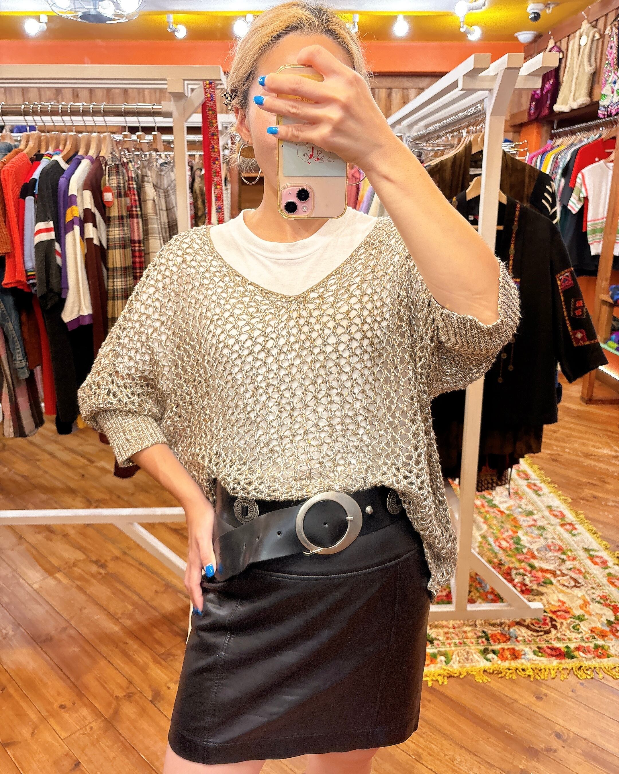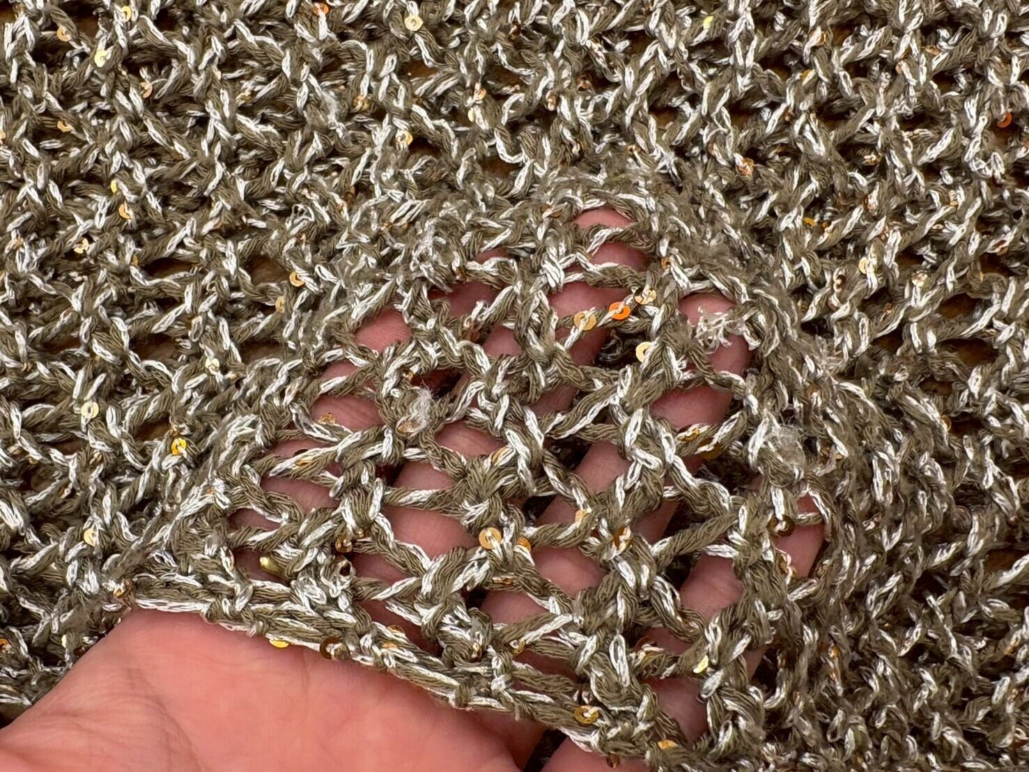 ローゲージのニットにスパンコールが編み込まれていてキラキラと光の動きがあってかわいいトップスです。