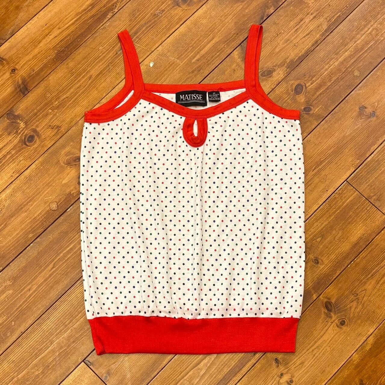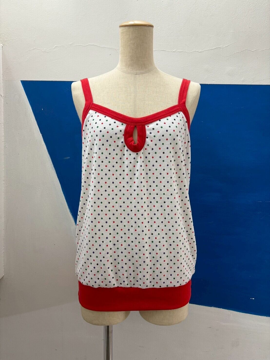 カラフルなドット柄と赤のパイピングデザインがかわいいキャミソールです。