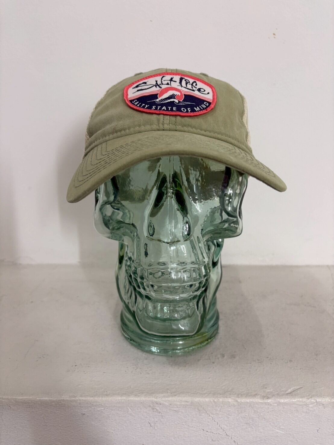 セージグリーンとベージュのナチュラルなアースカラーが魅力のワッペン付きメッシュキャップです。