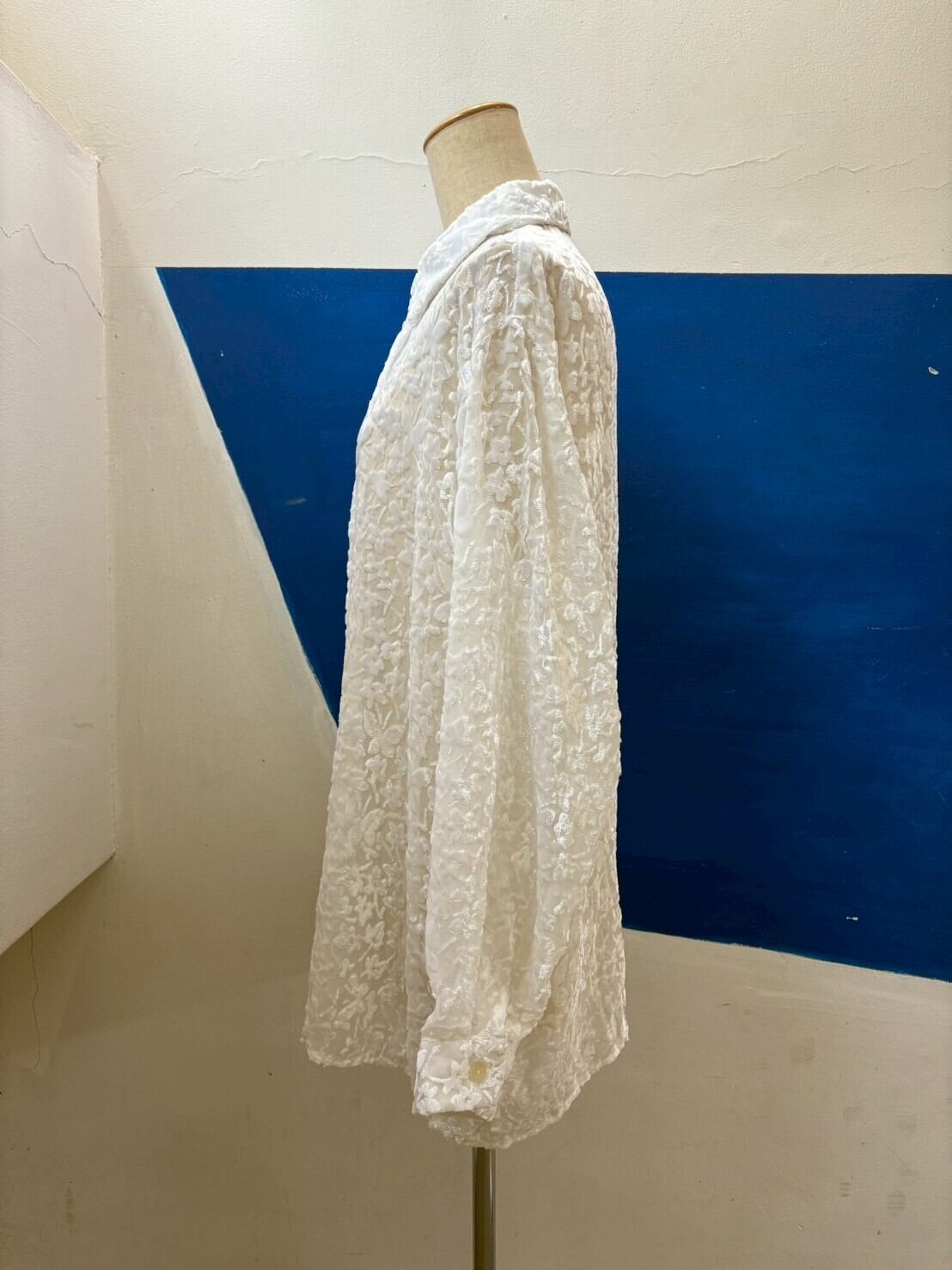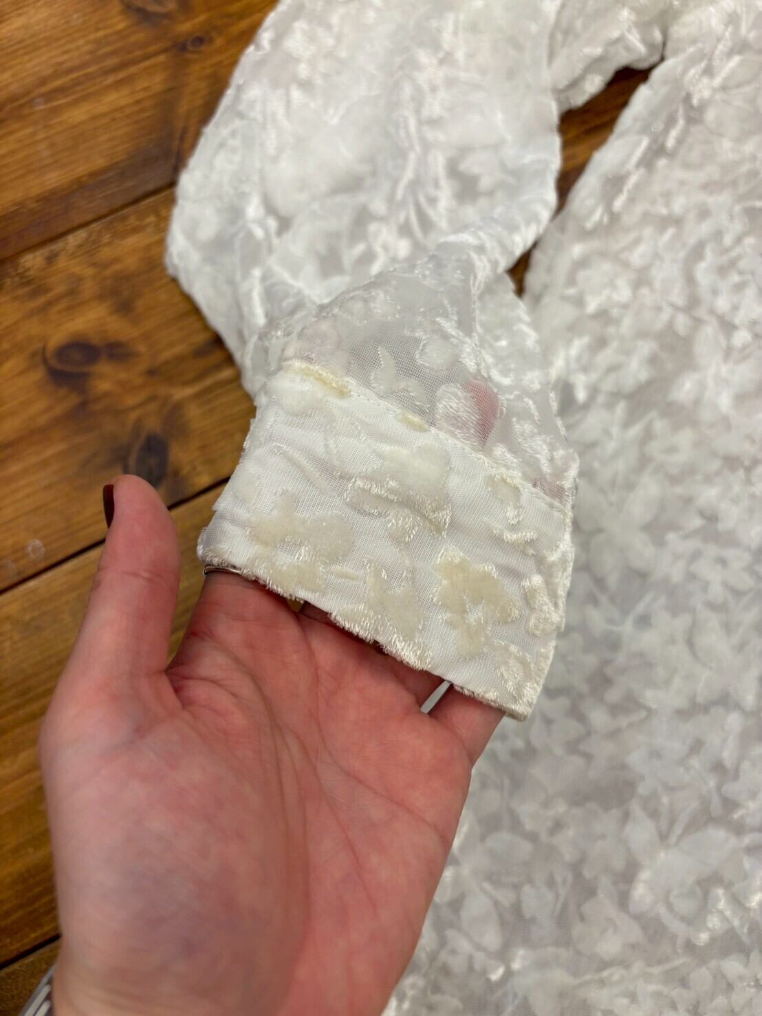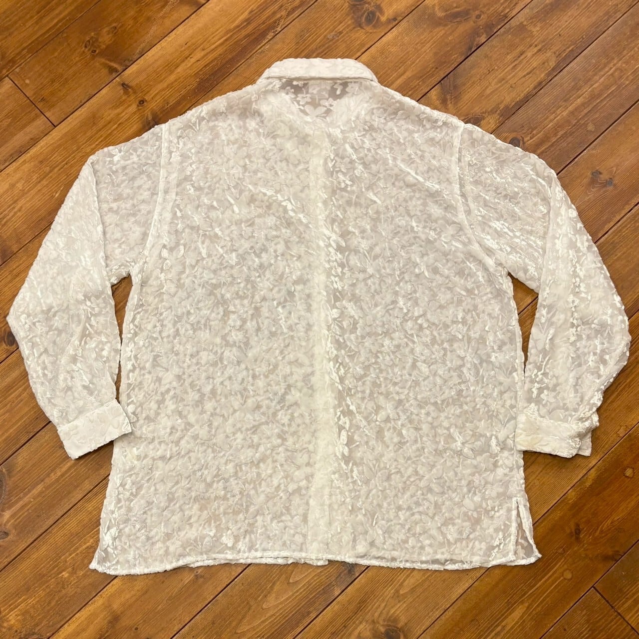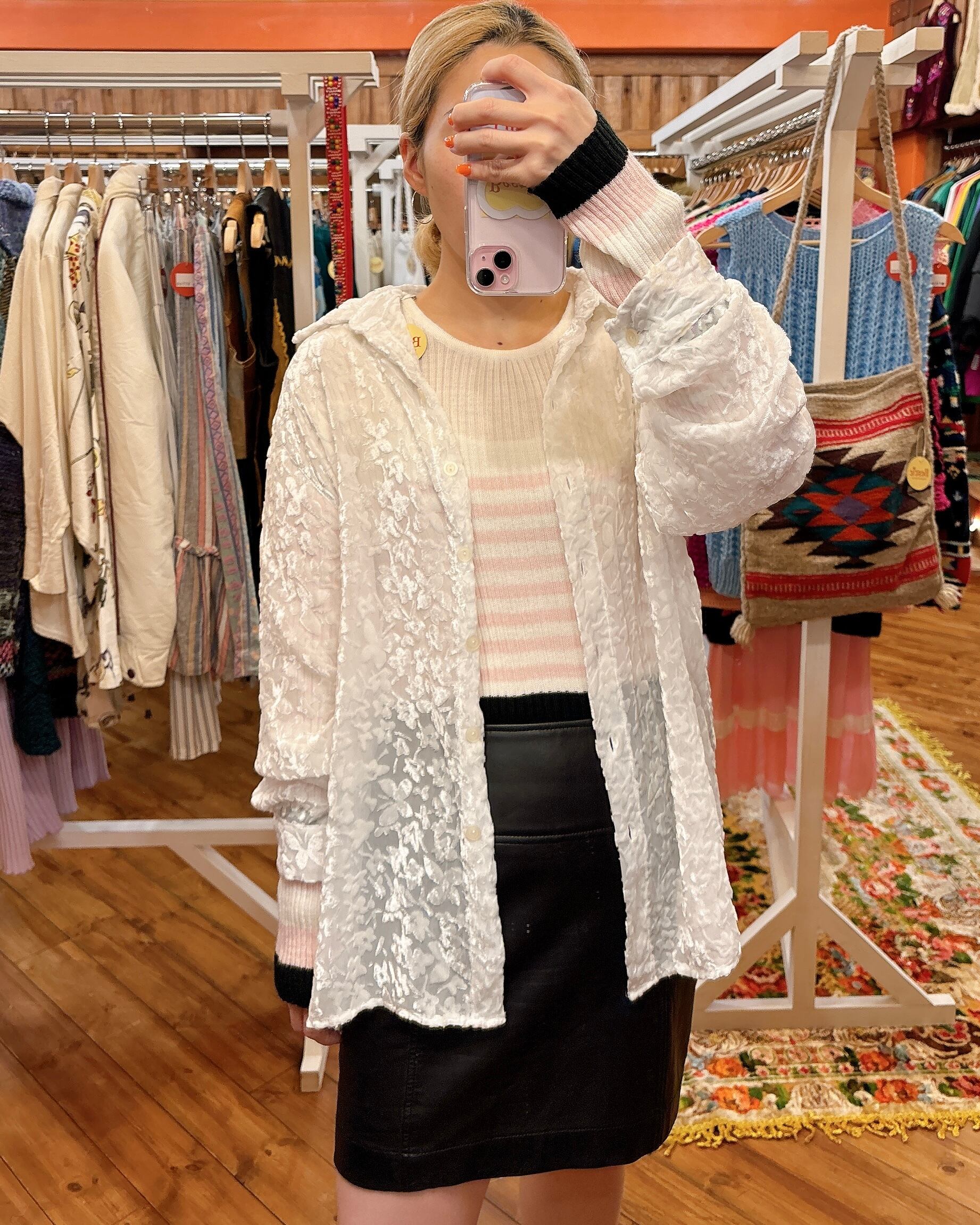 白いベロアでお花や蝶々の総柄が入ったシャツです。