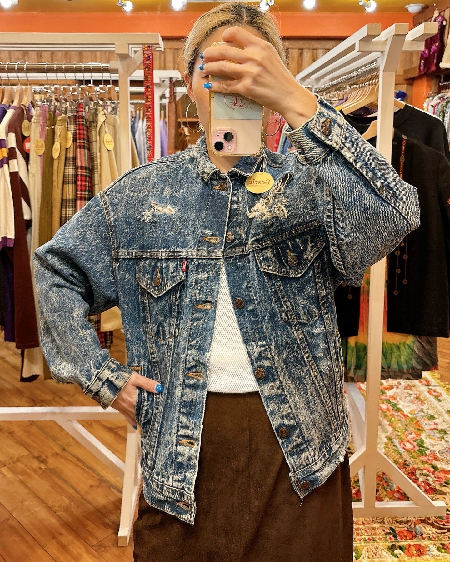 ケミカルウォッシュにクラッシュダメージが入ったリーバイス のデニムジャケットです。