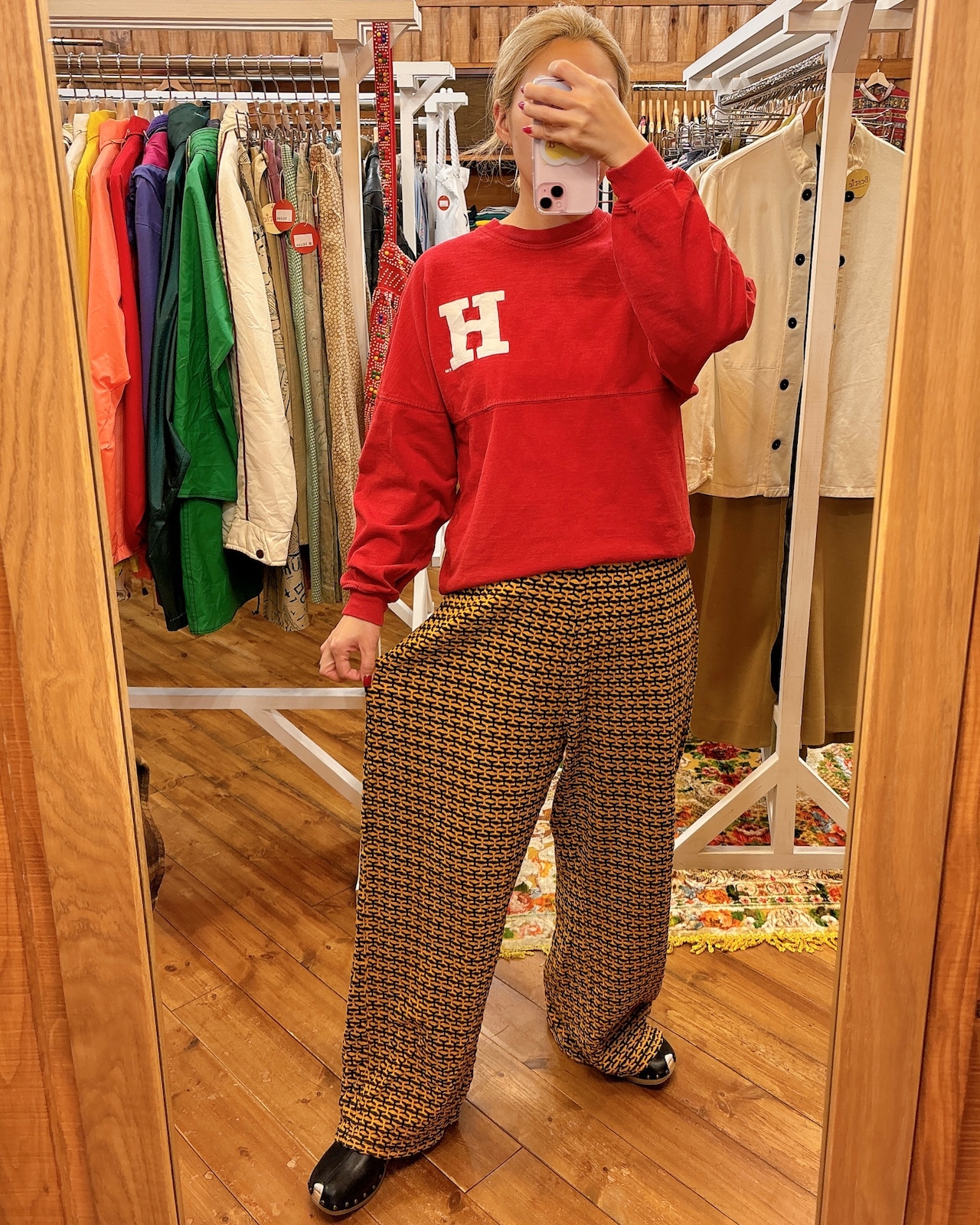ウエスト部分の平ゴムは安定感あって履きやすいです。ワイドなシルエットで股下も長すぎないので使いやすそう。