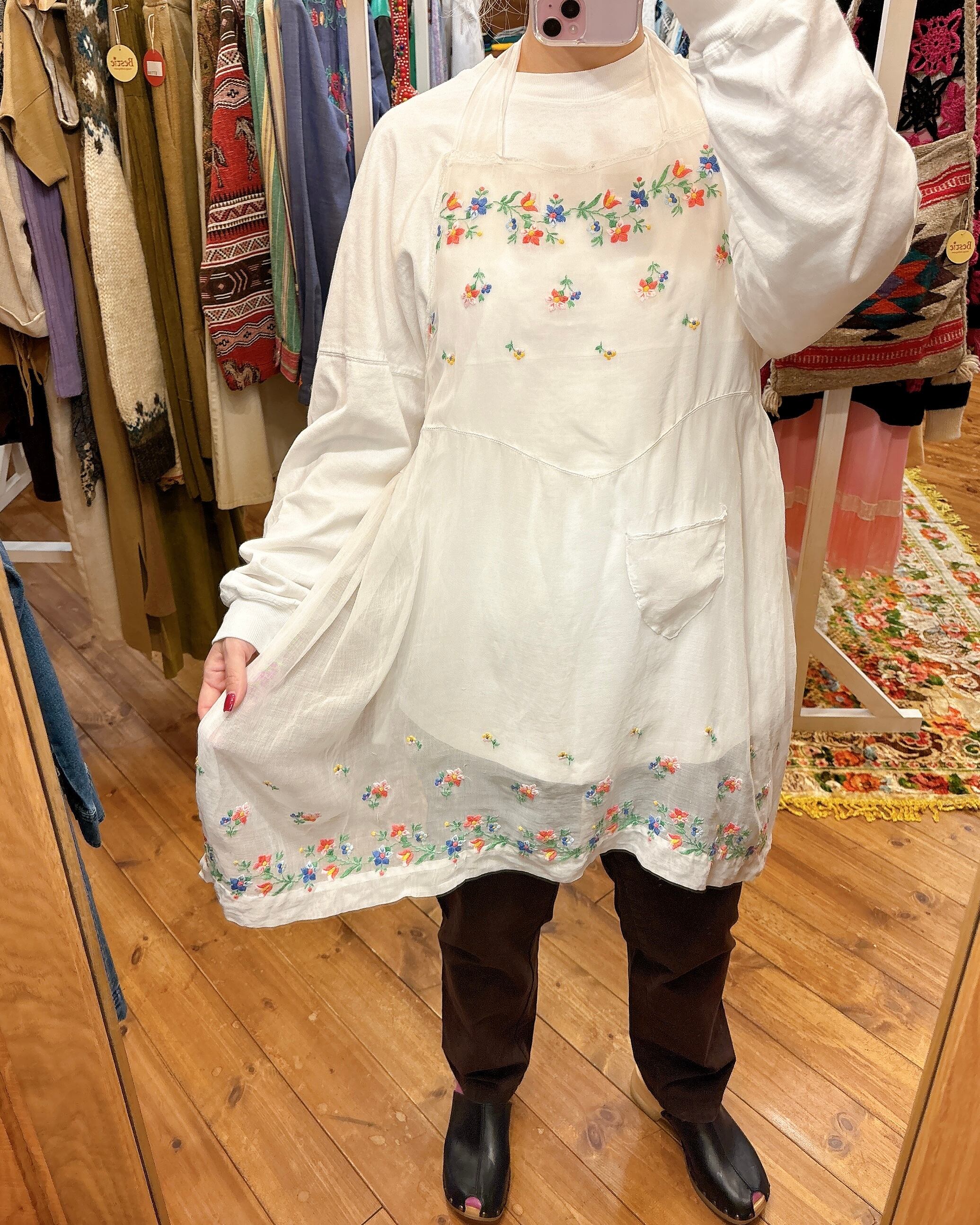 お花の刺繍と透けている素材感がとてもかわいいエプロンです!
