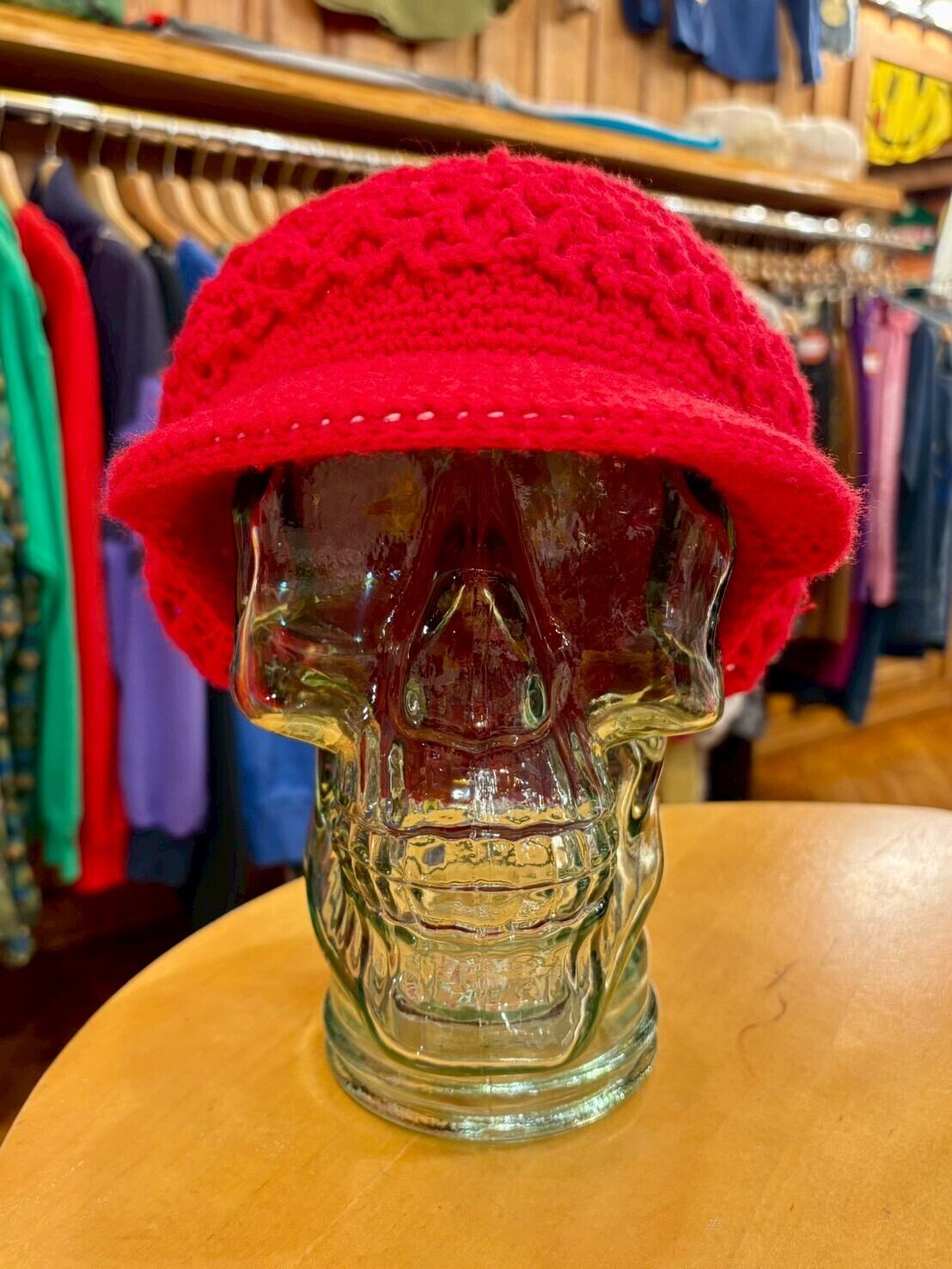 ややボリュームあるシルエットがかわいい手編みのキャスケット帽子!こちらはUSEDのものです。鮮やかな赤も古着らしくてかわいいですね!!いい雰囲気です◎