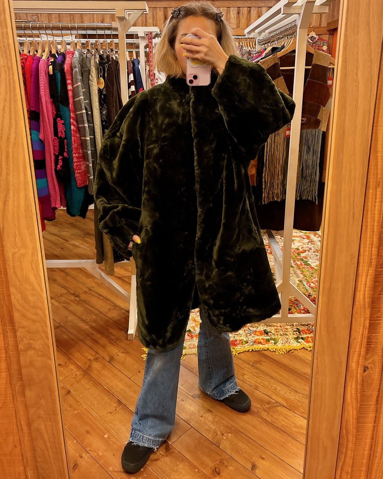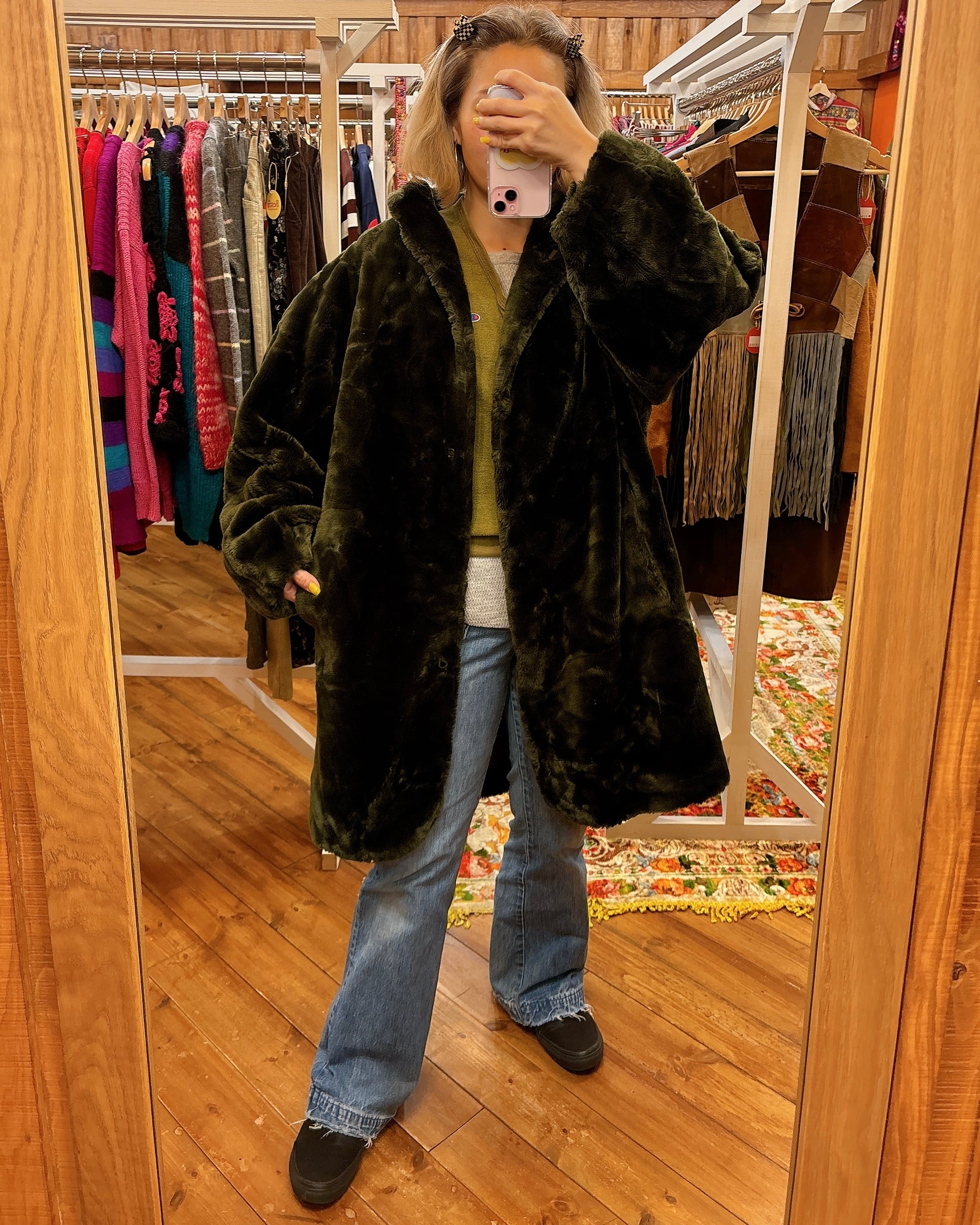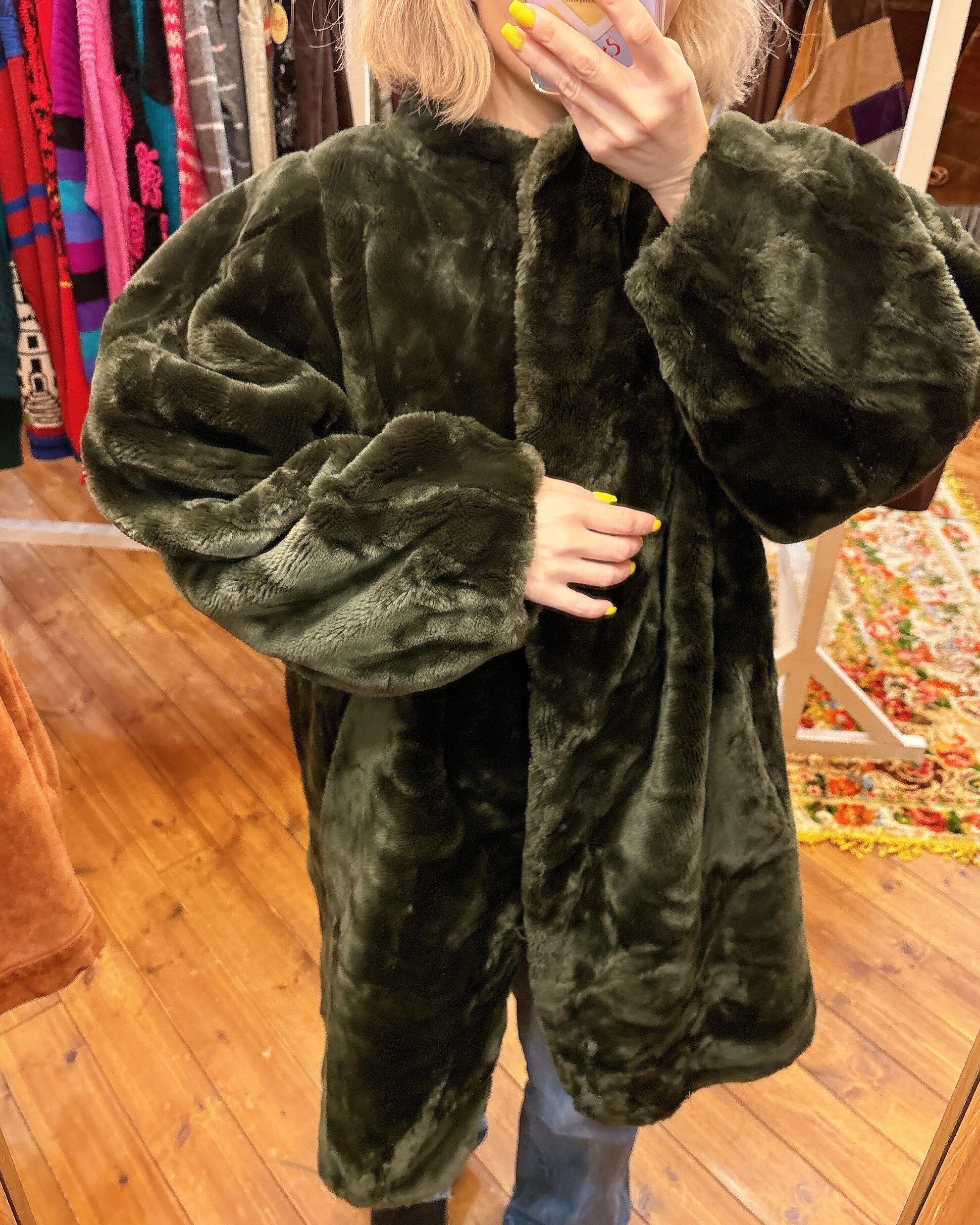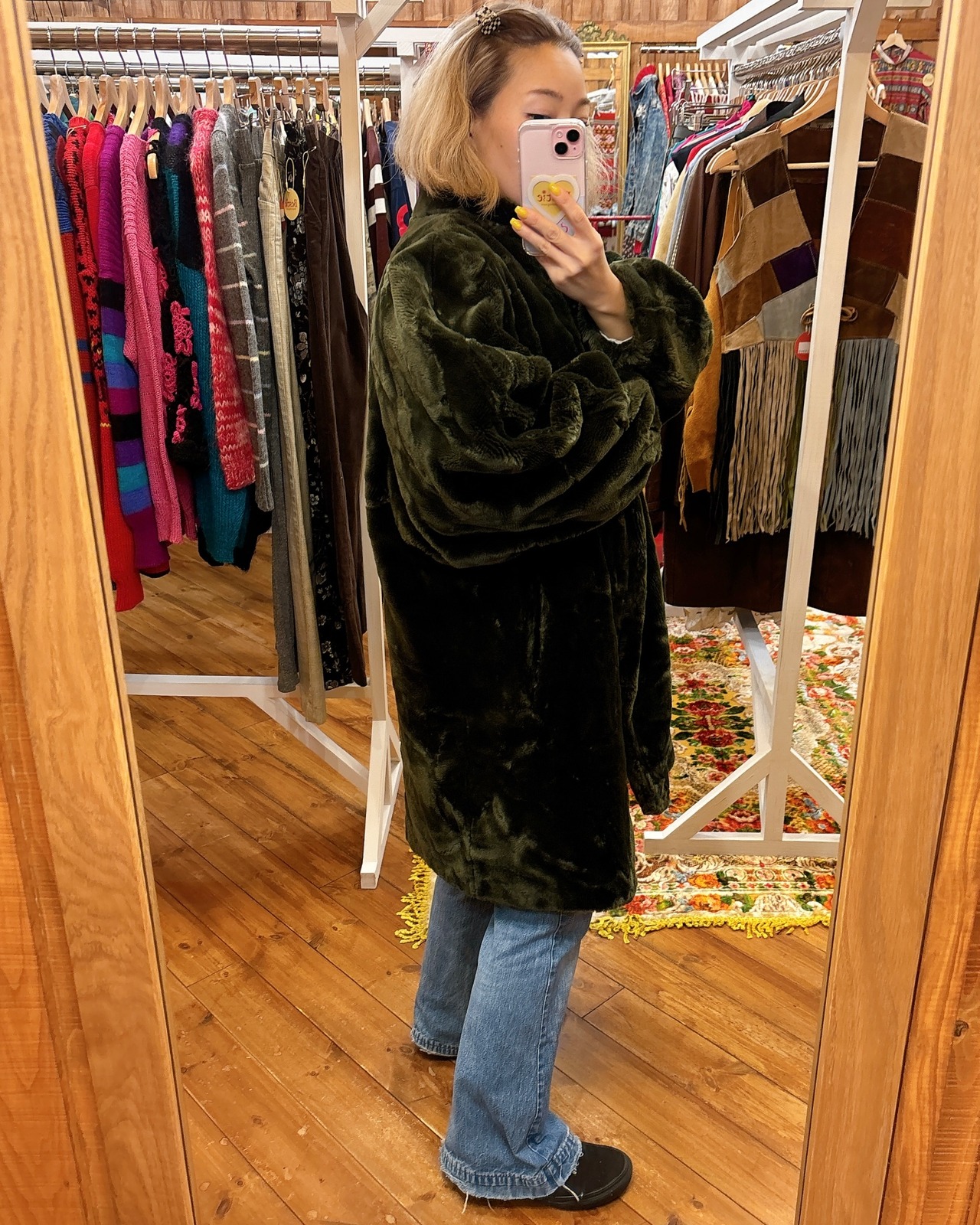 艶のあるモスグリーンのむっちりエコファーがとてもかわいいコート!!ボリュームある袖のシルエットも最高です◎