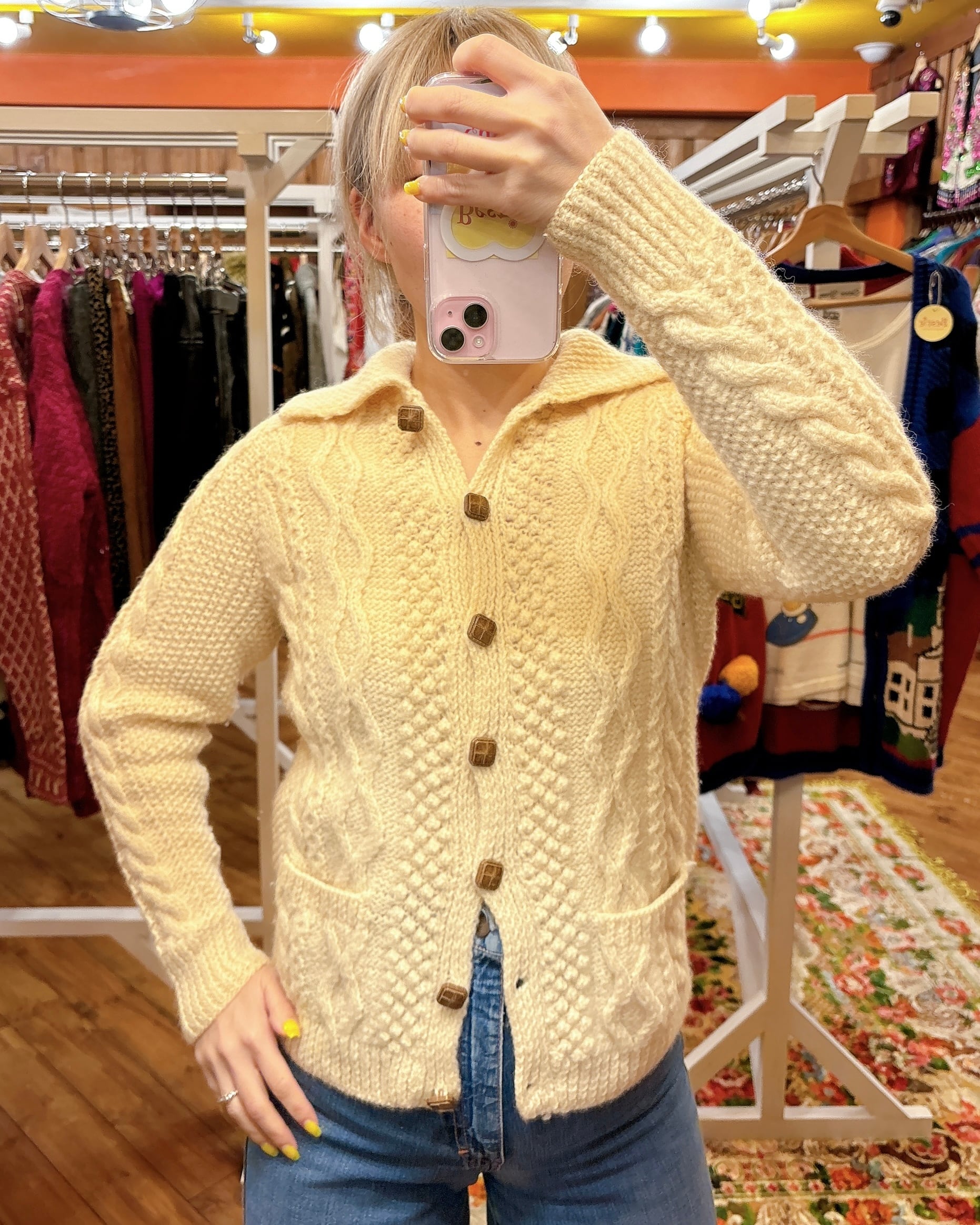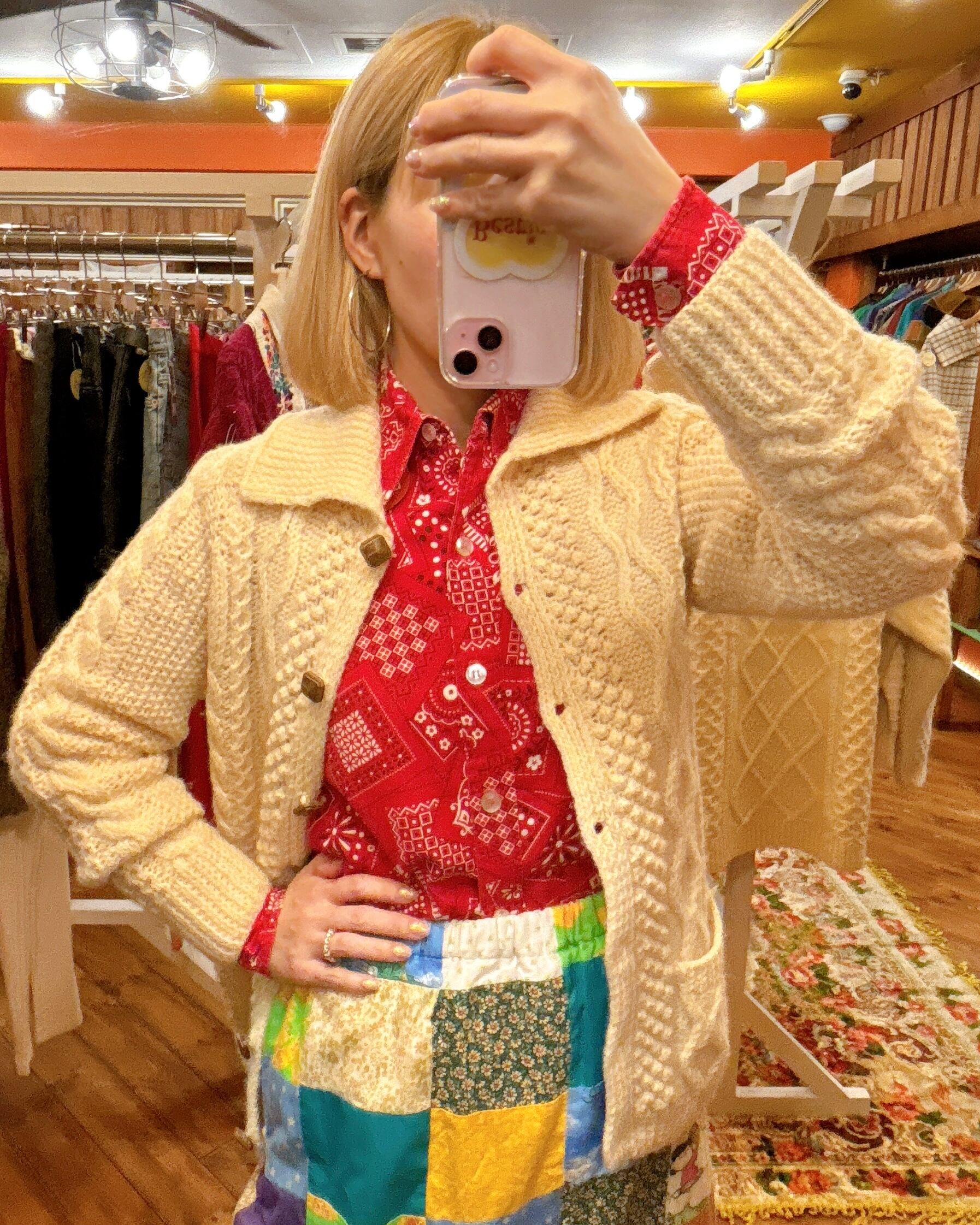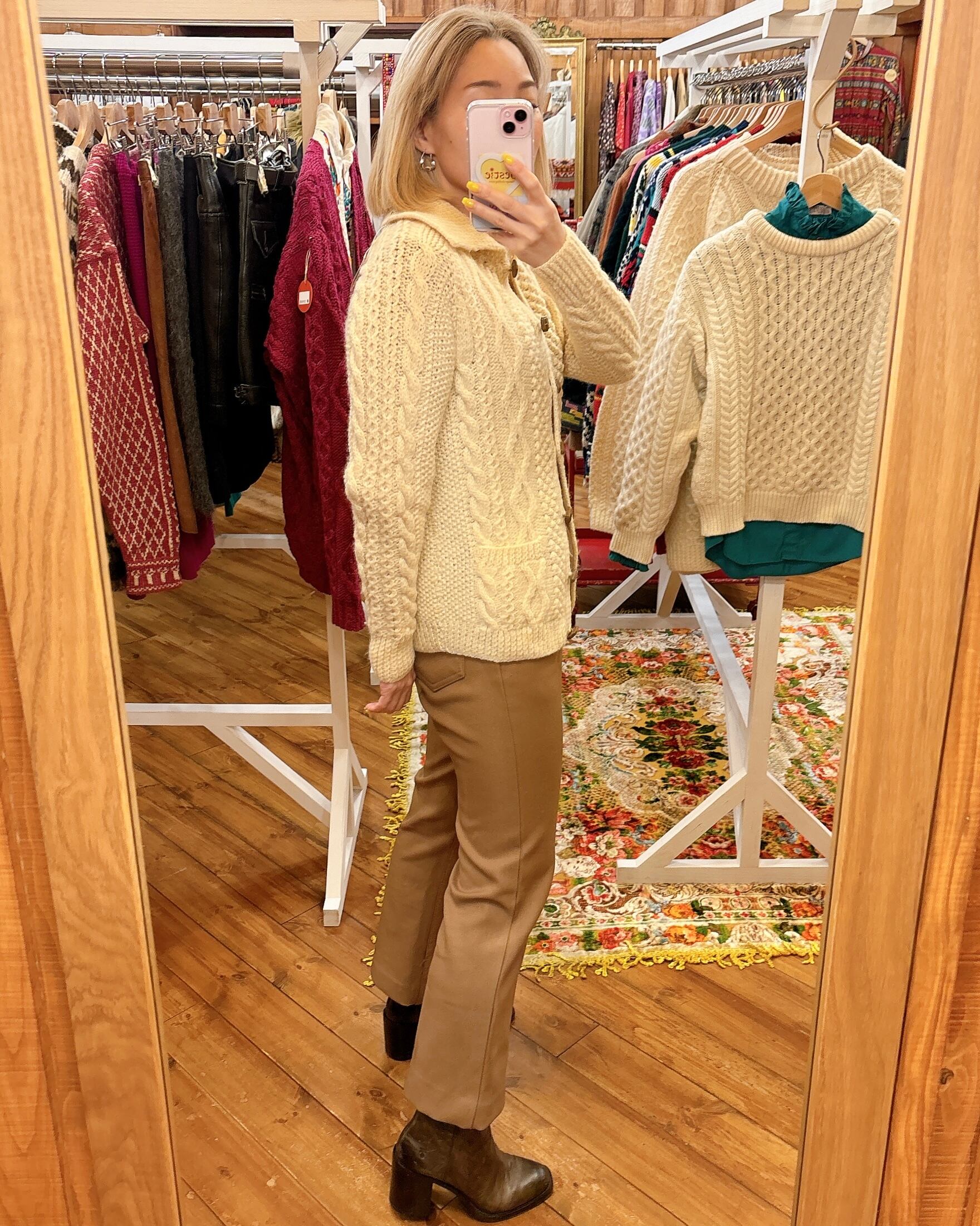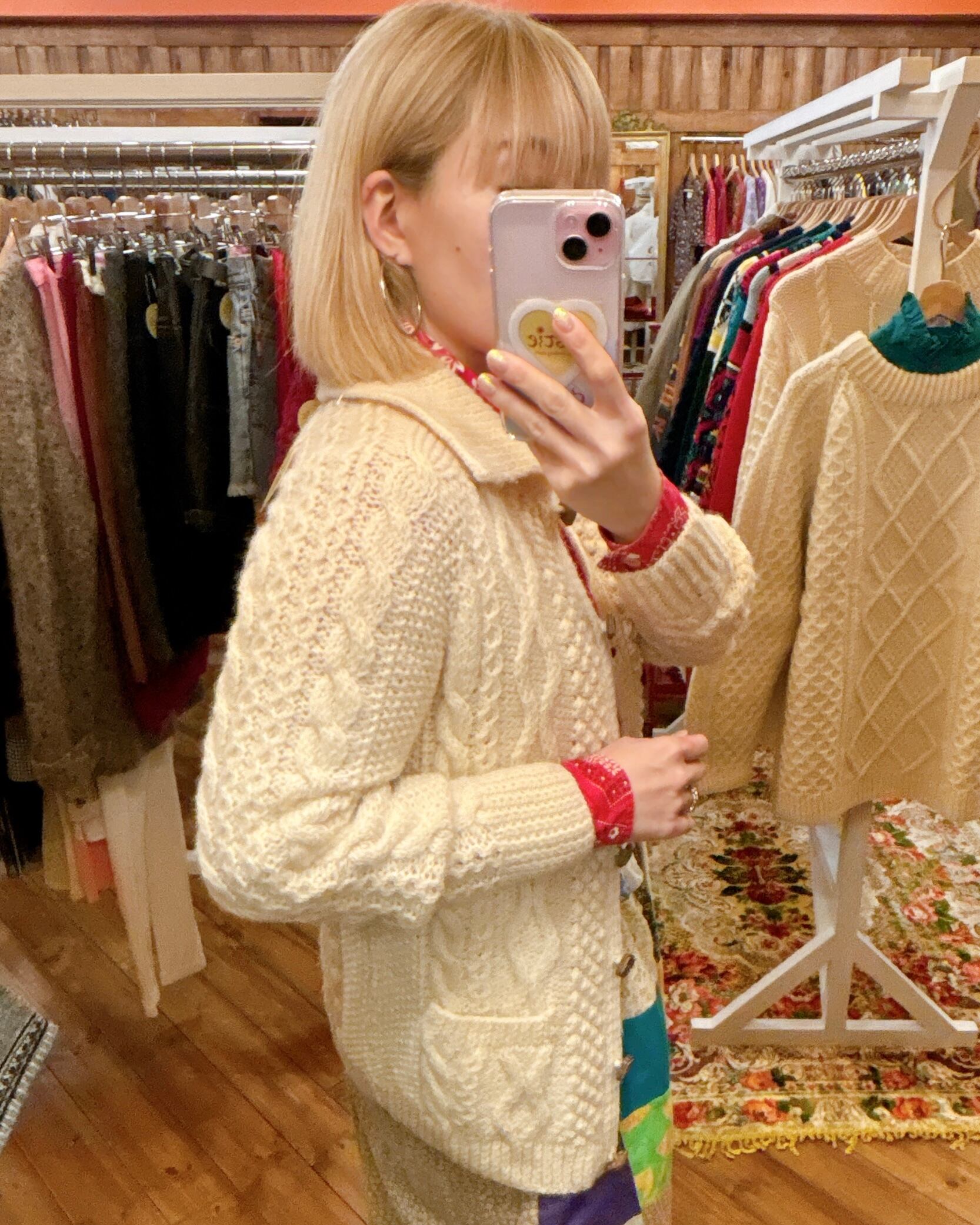 前閉じしてトップスとしての着用も羽織でも使いやすです。襟があるので暖かさもアップする感じがします。定番のケーブルニットはシルエット違いで持ってると何気に着こなしのバリエーションが増えてうれしいです!!