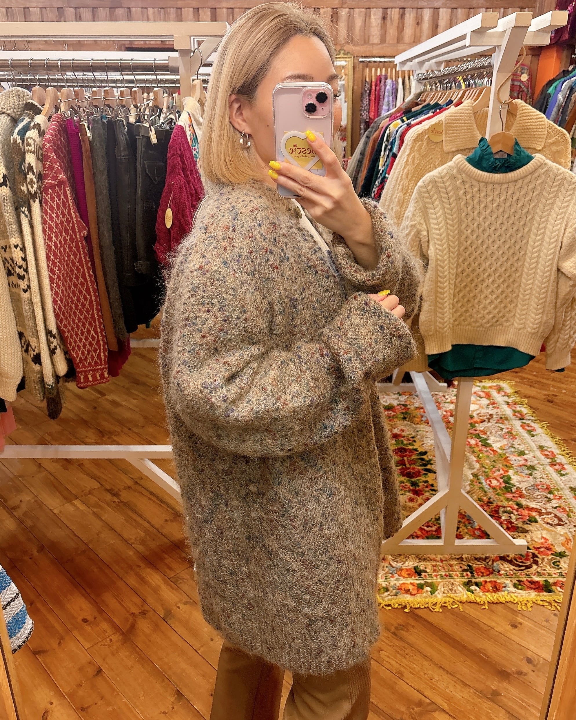 USEDの手編みで作られたニットカーディガンです!!おそらくモヘアニットも含まれていそうなふんわり毛足が長くて薄手のタイプ。くすみカラーの丸いカラーネップが入っていてかわいい!!襟元ひとつボタンで前開きなので身幅はゆったりしています。
