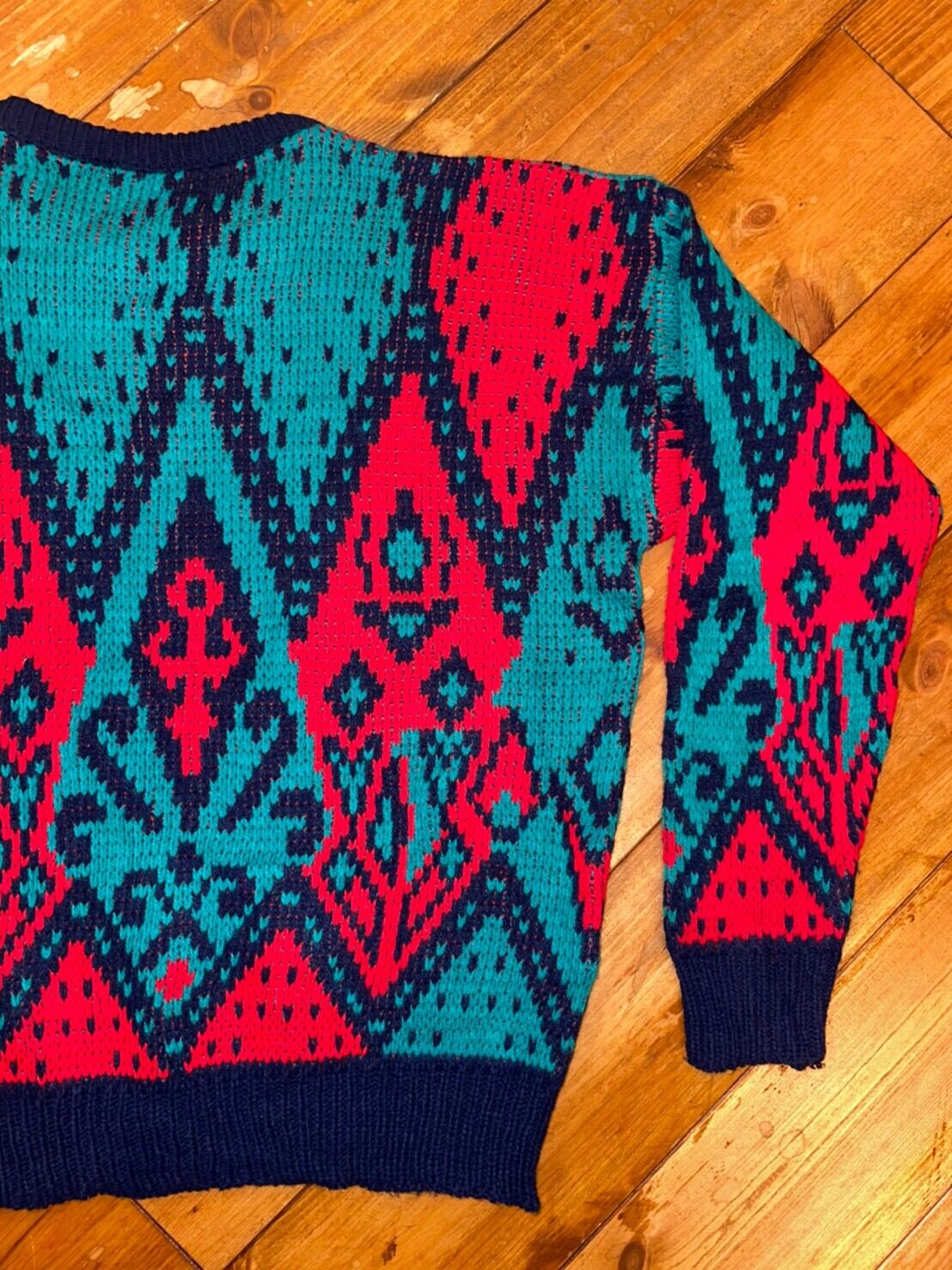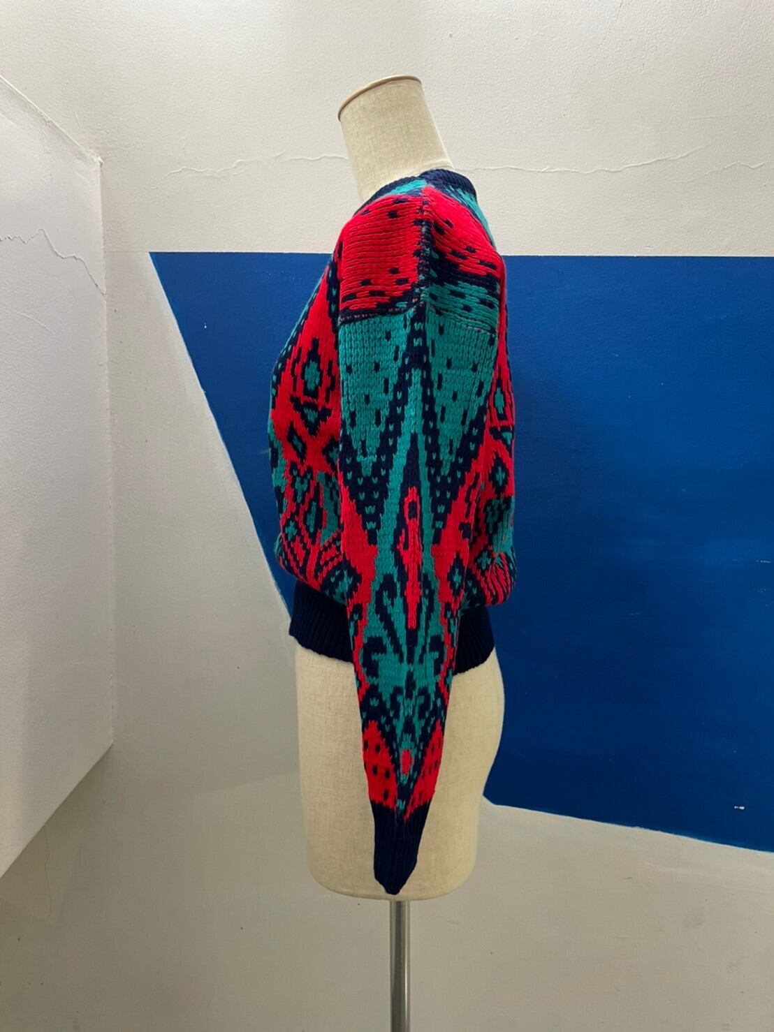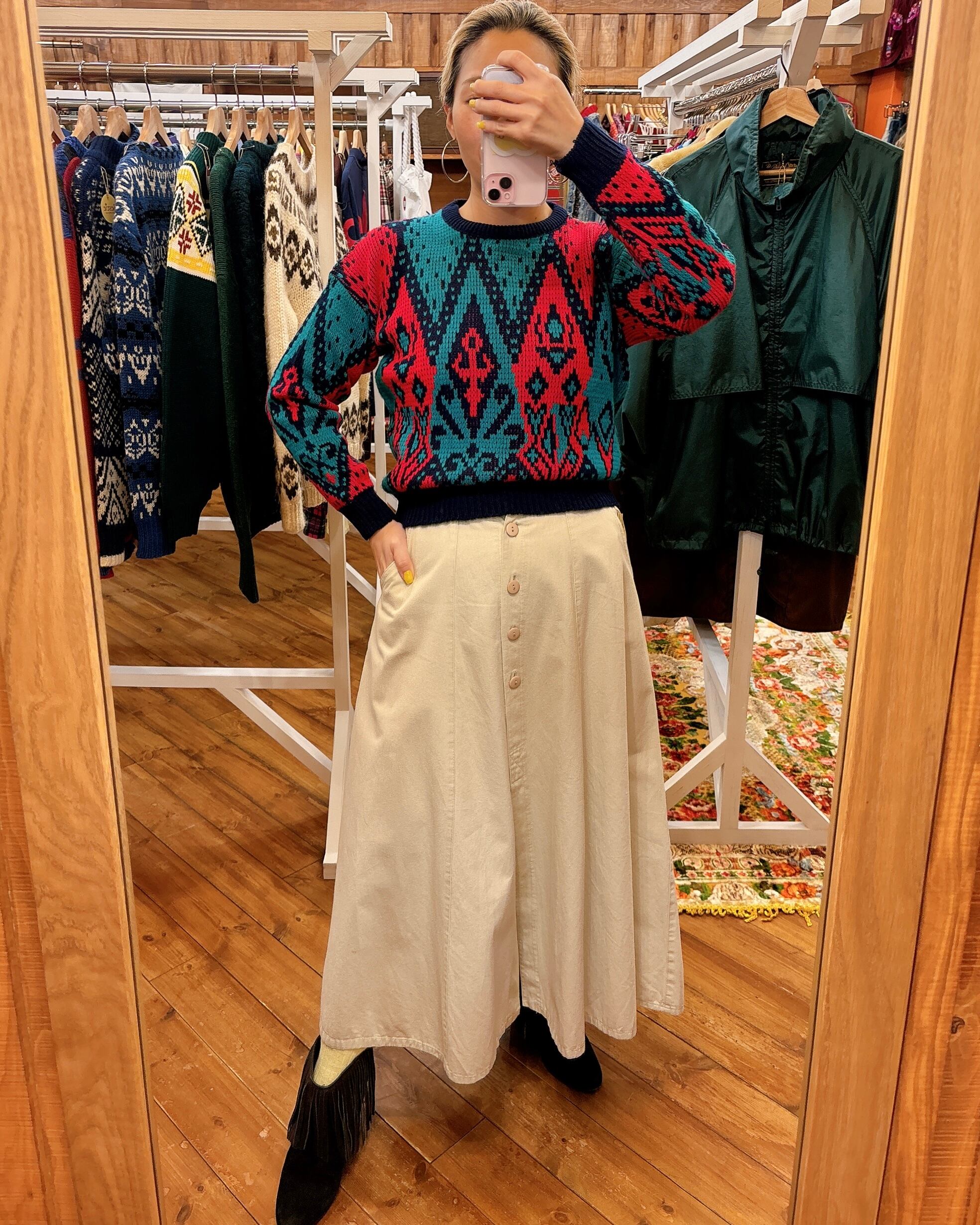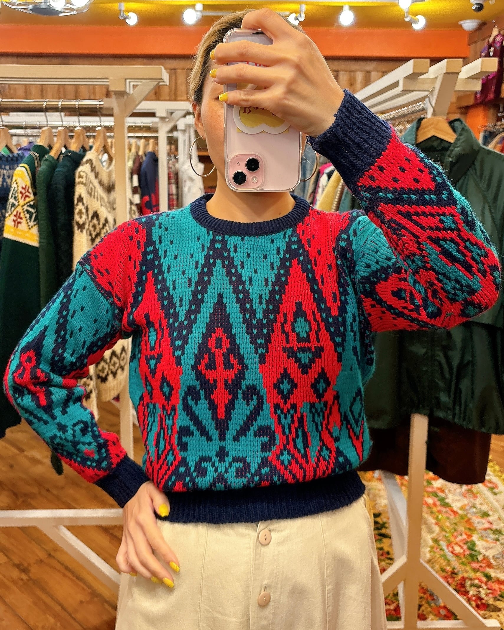 サイズ感もすっきりとしていて、フレアパンツに合いそうです!こんなカラフルセーターで寒い季節も楽しく過ごしてほしいです!!