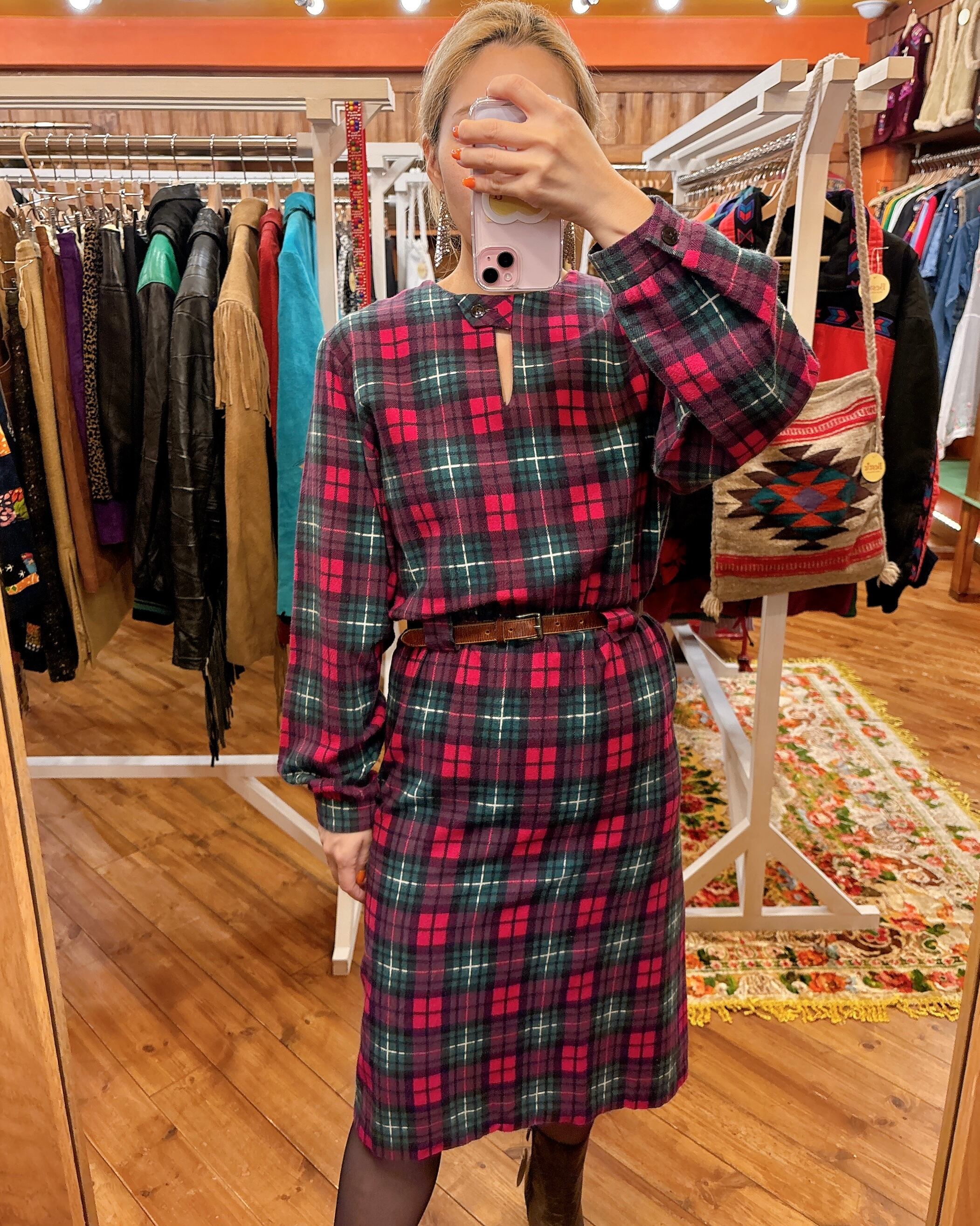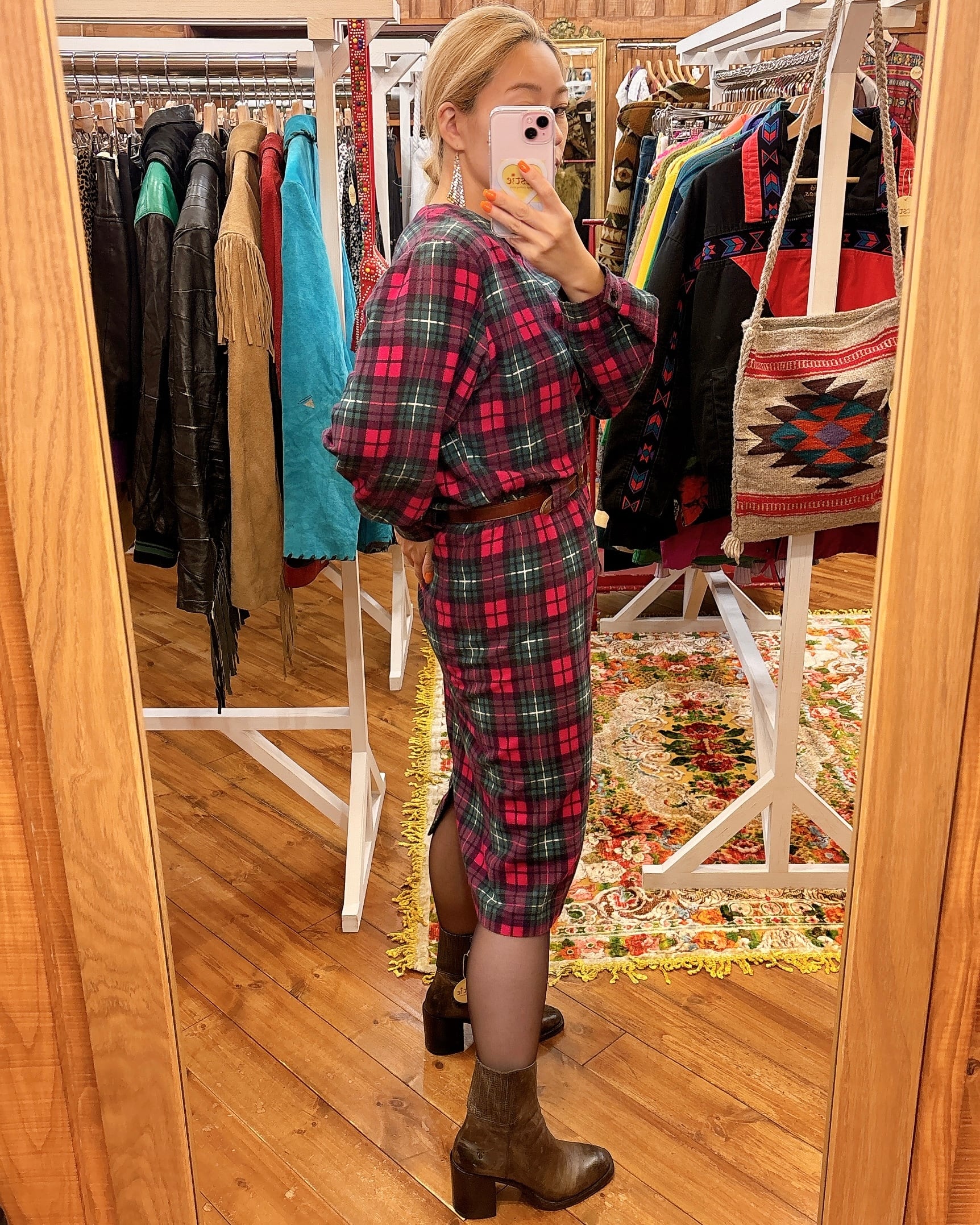 チェックものはガーリーになりがちですが、襟元のデザインと、広がりの少ないタイトめなスカートが大人っぽい印象です。