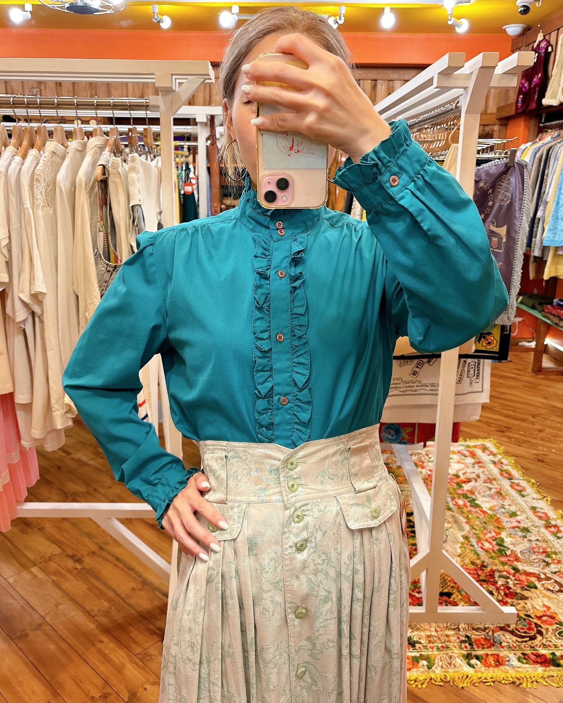鮮やかなグリーンが程よく華やかで、襟元も高さがあり上品な雰囲気のブラウスです。
