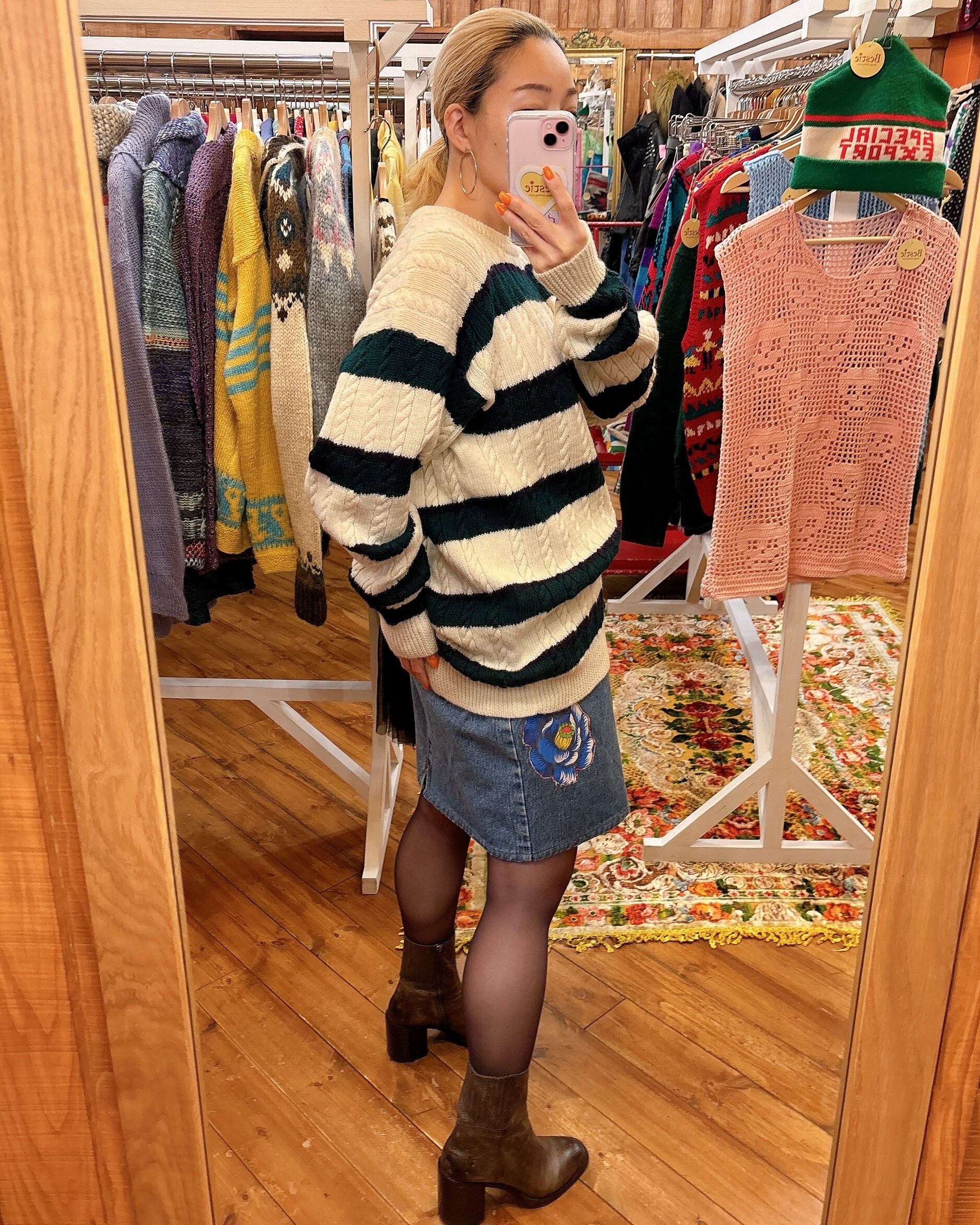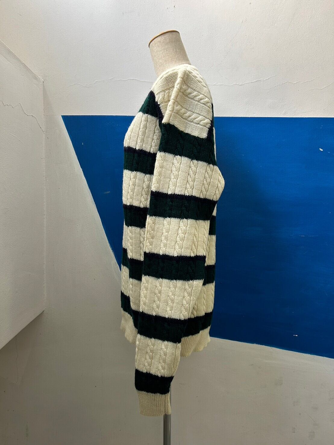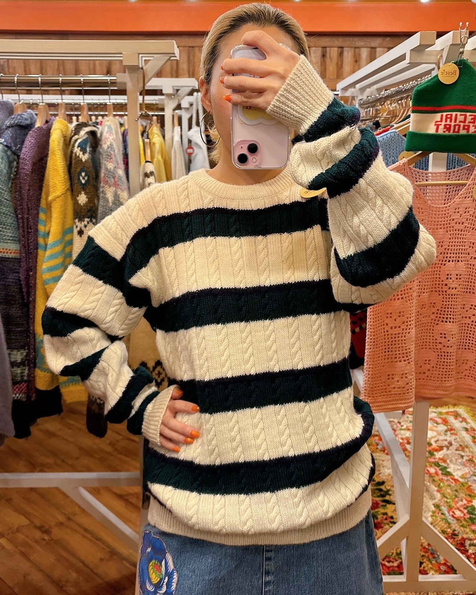 ケーブル編み/太ボーダーがスポーティーでかわいいクルーネックのセーターです。