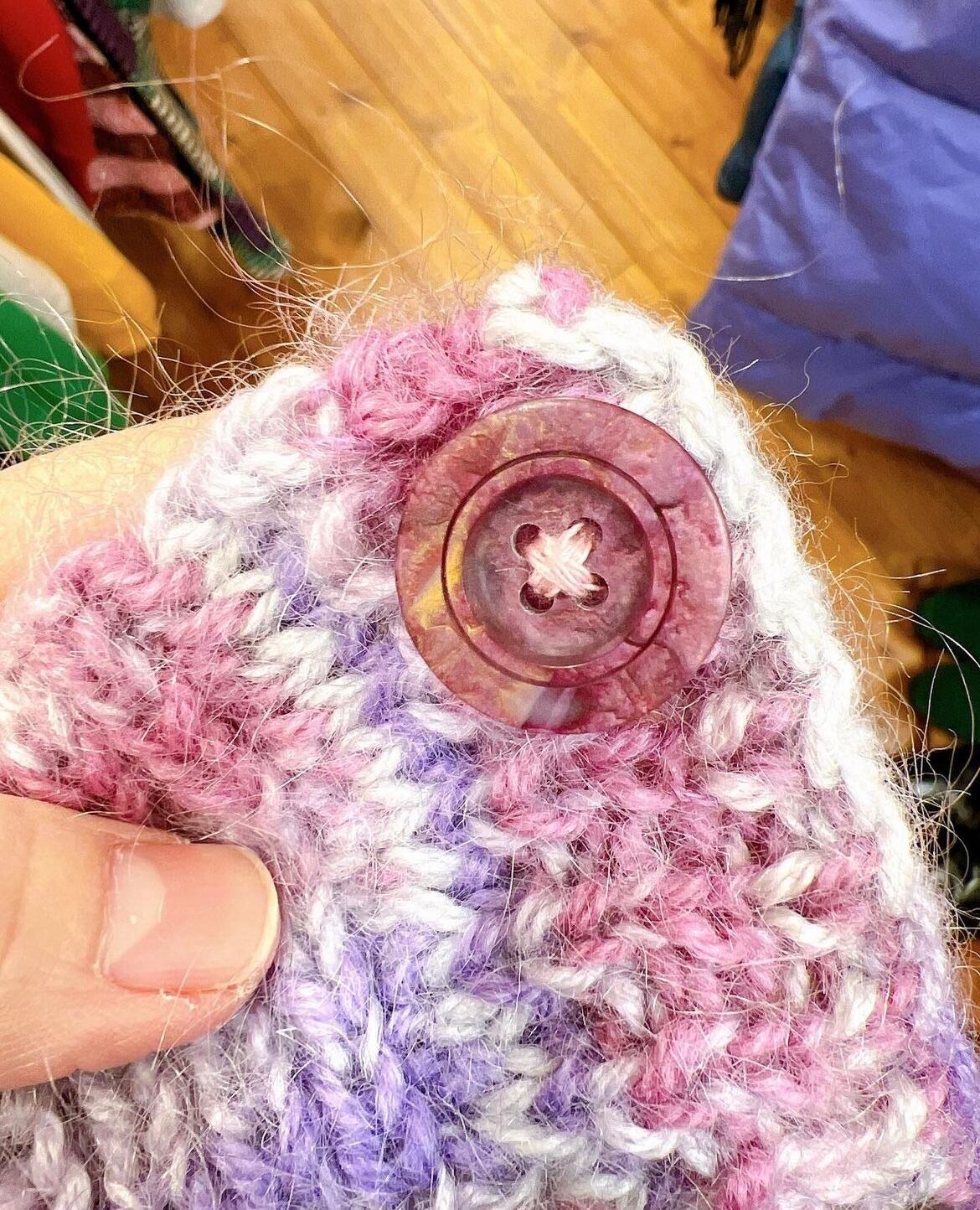 さまざまな編み方が組み合わされてとてもユニークな作りのカーディガンです。手編みらしい柔らかい風合いと、艶のあるボタンも可愛らしいです。