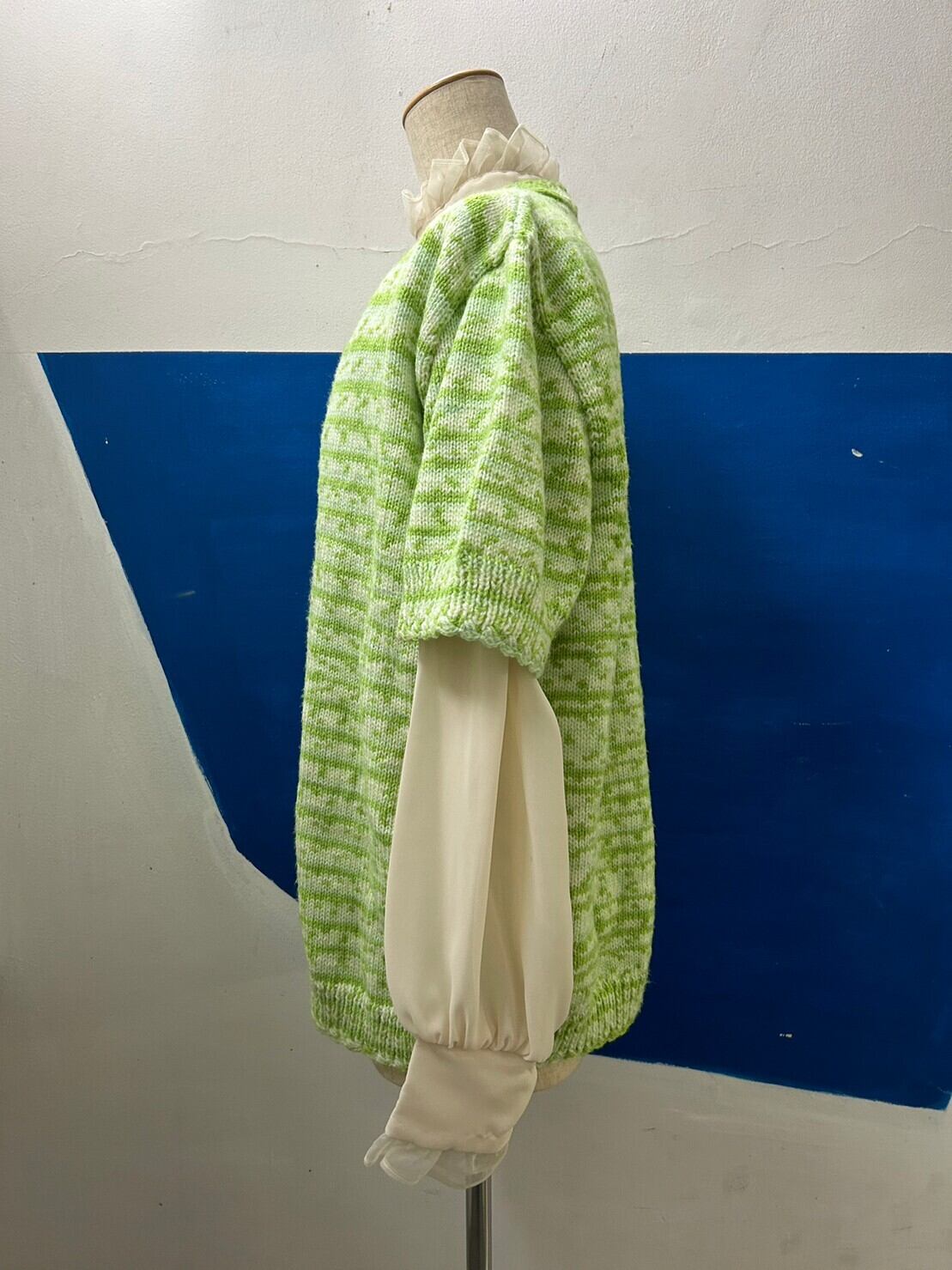 古着の手編みカーディガンです。ワイドな身幅に、半袖のデザインがとってもかわいいです。ブラウスとの重ね着はもちろんですし、パーカーやロンTなどカジュアルなトップスとも相性良さそうです!