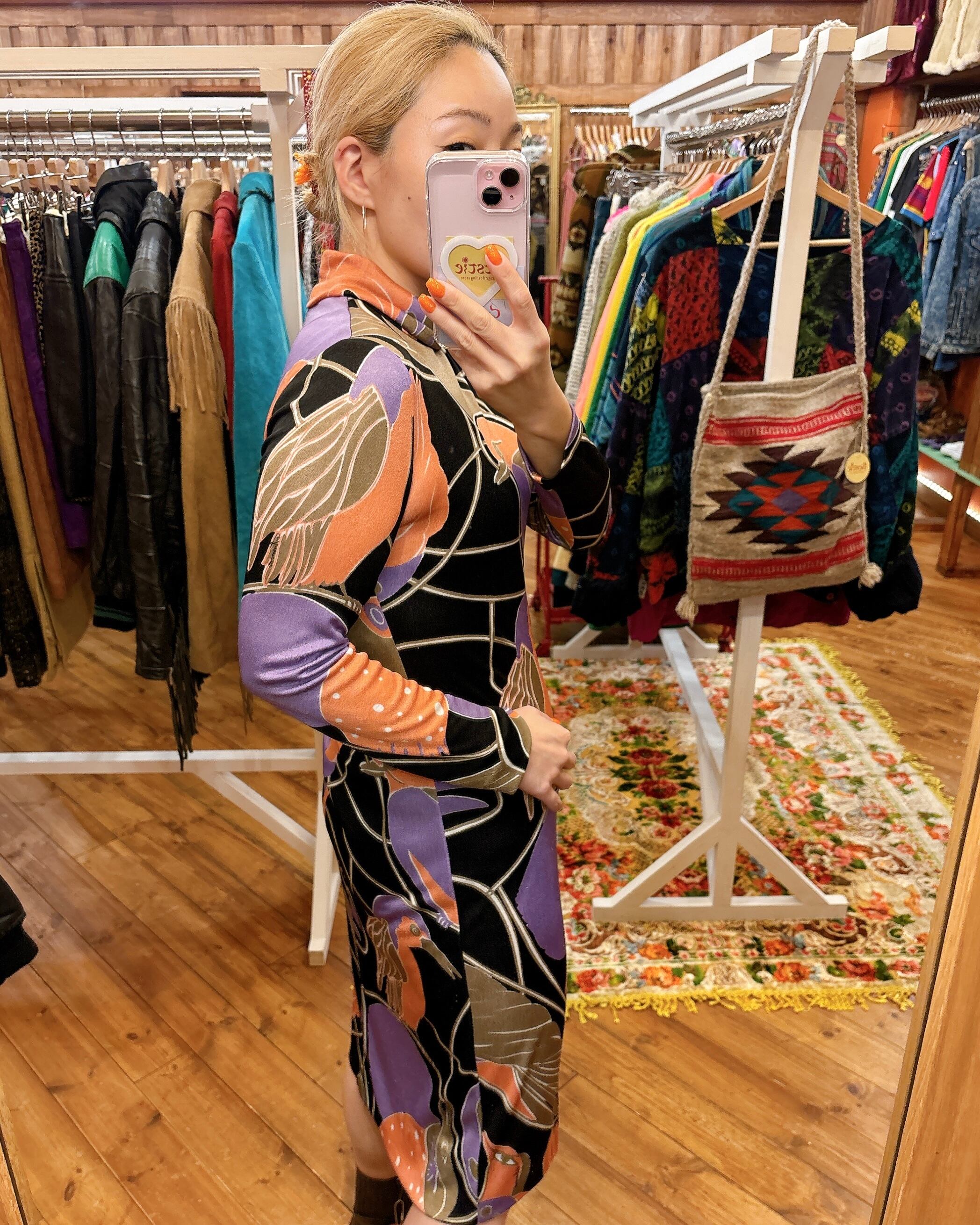 L/S 総柄 鳥柄 後ろジップ ハイネック プルオーバー ワンピースVintage