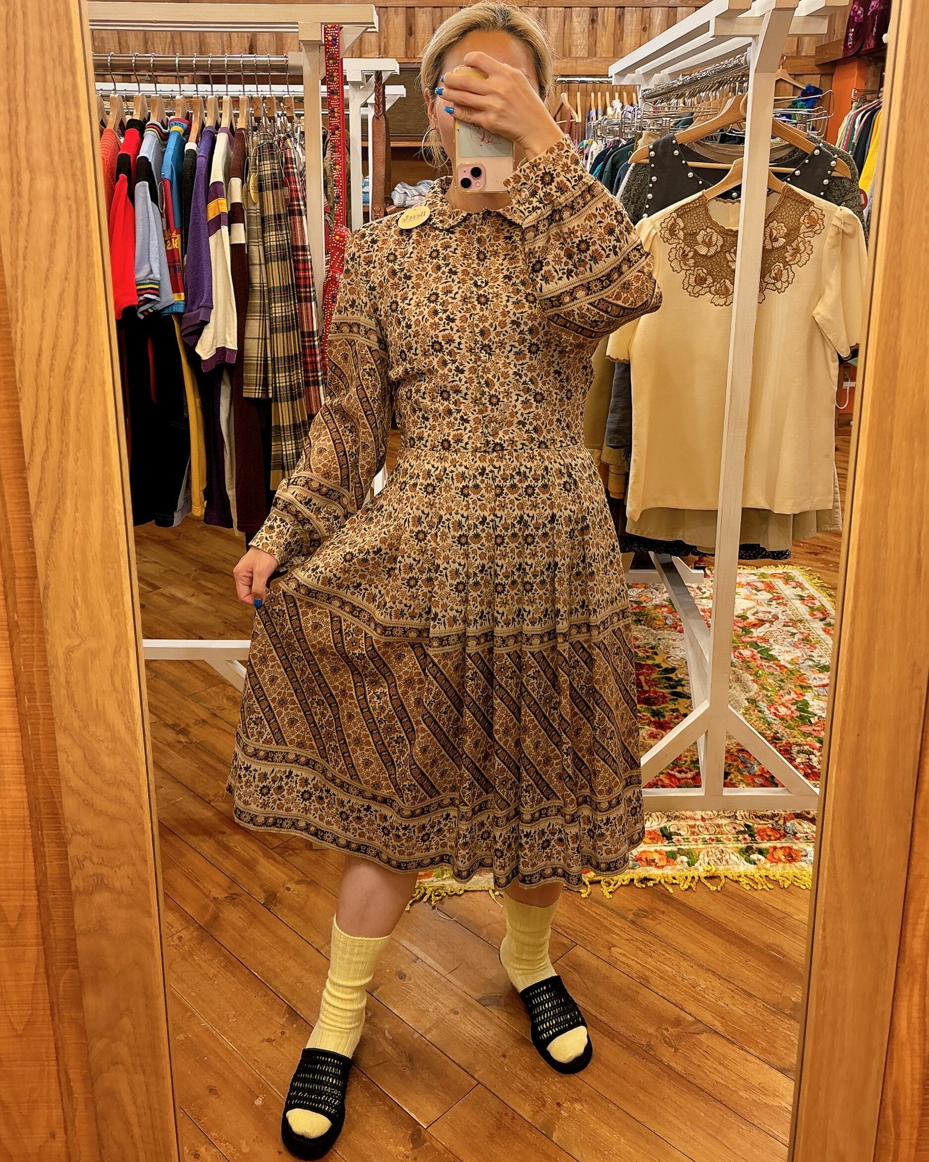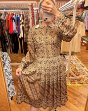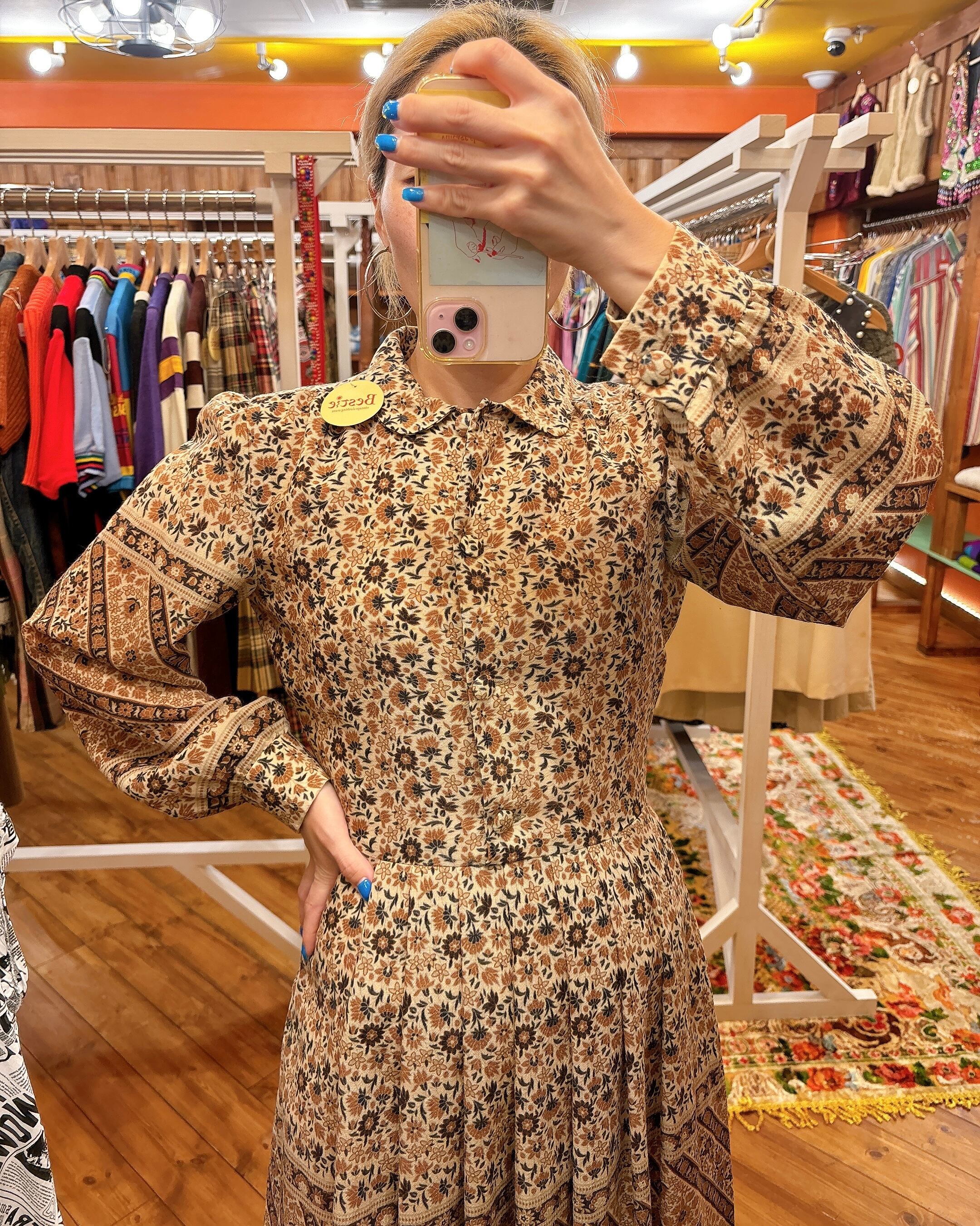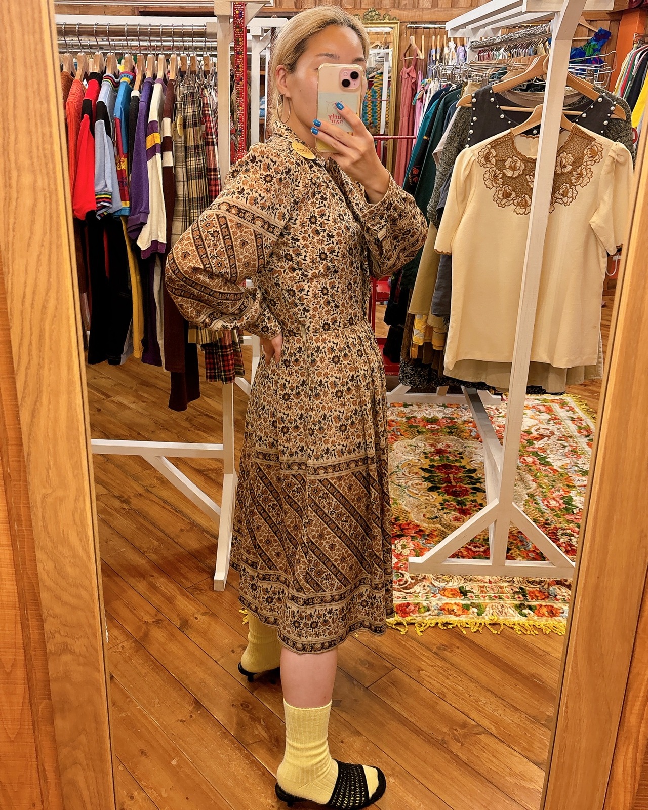 前ボタン、サイドジップありのプルオーバーで着用するタイプのビンテージワンピースです。インド綿ドレスのような総柄が素敵です。