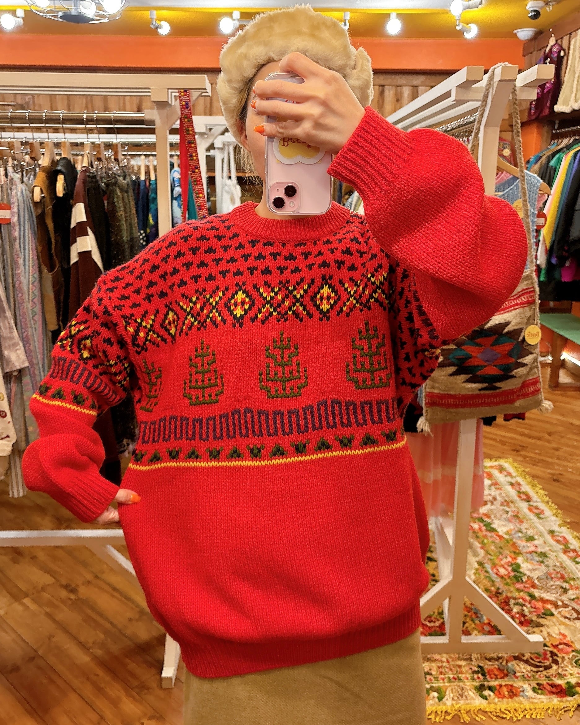 元気の出る赤色のセーターです。毛糸の質感もふわっとして軽くて着心地も◎!!たっぷりしたサイズ感なので女性の方が着てもかわいいです。男女問わずおすすめ!