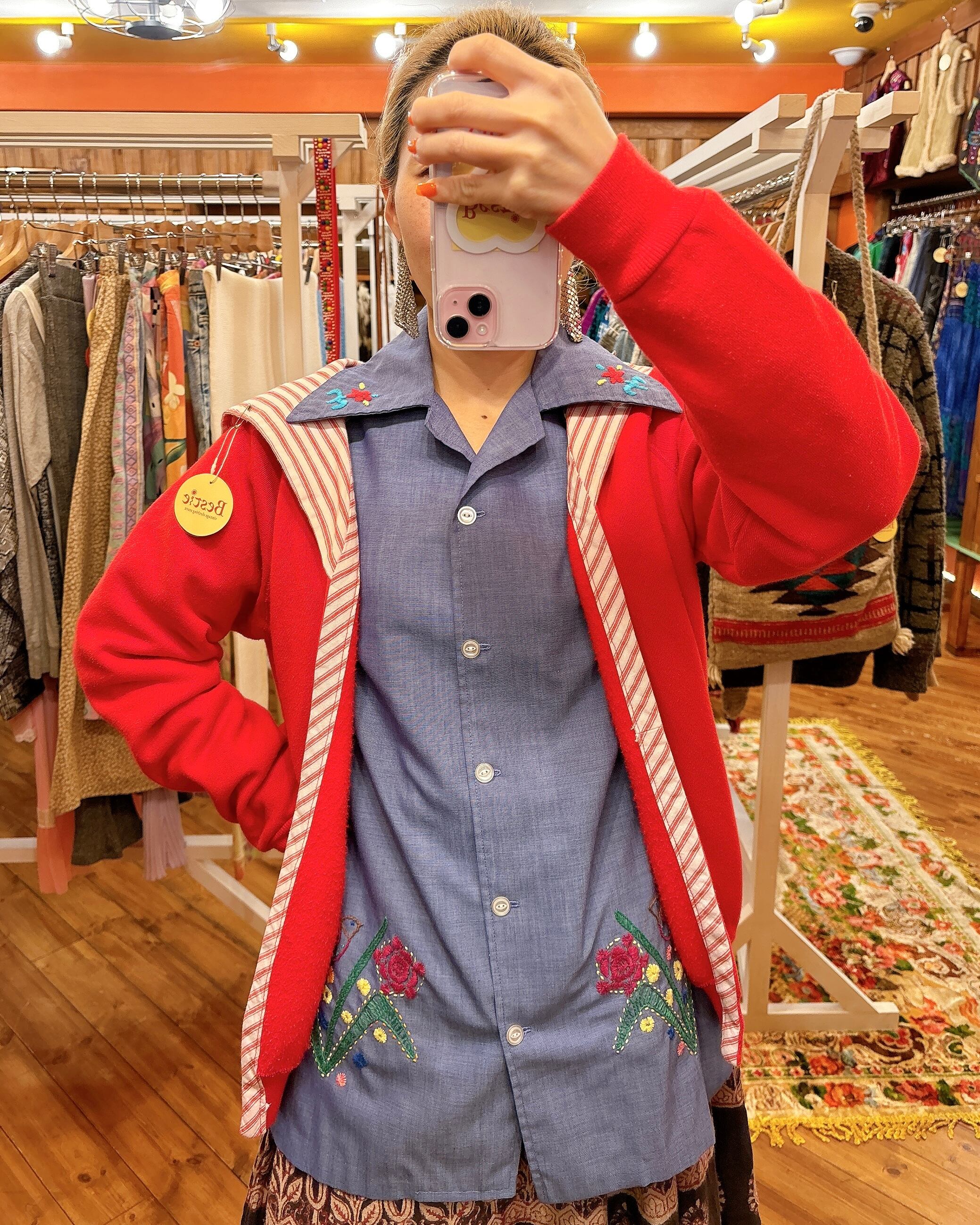 たっぷりと手刺繍の入ったオープンカラーシャツです。ハンドメイドらしい味わいある古着です。前開きのシャツですので、羽織としてもトップスとしても着回しが効きますし、ぜひ刺繍が見える様に着ていただきたいなと思います。