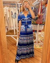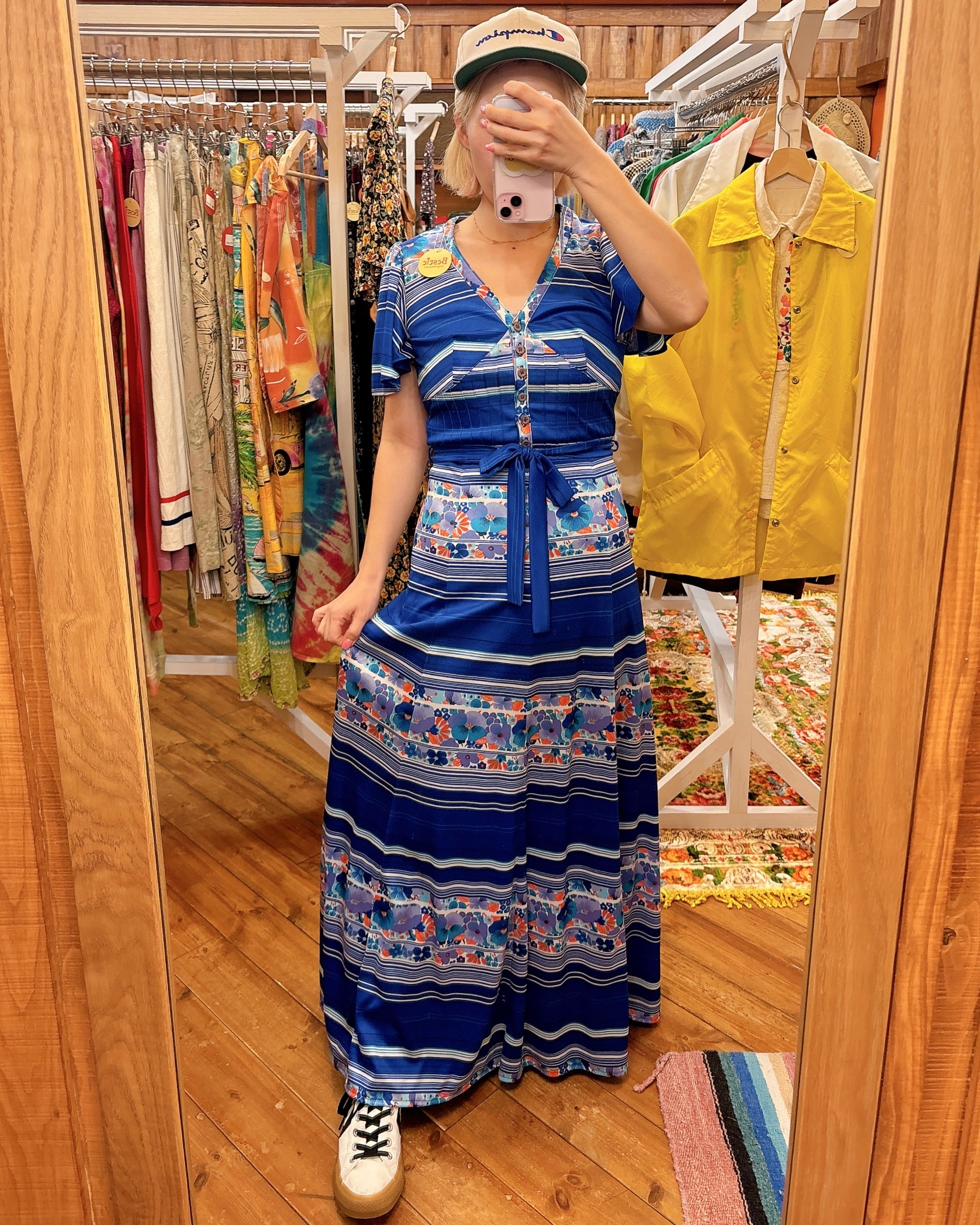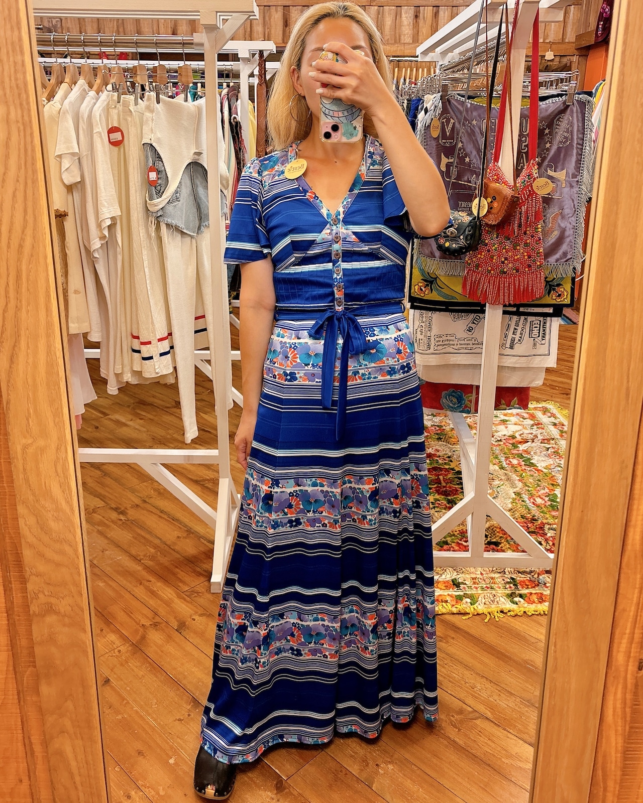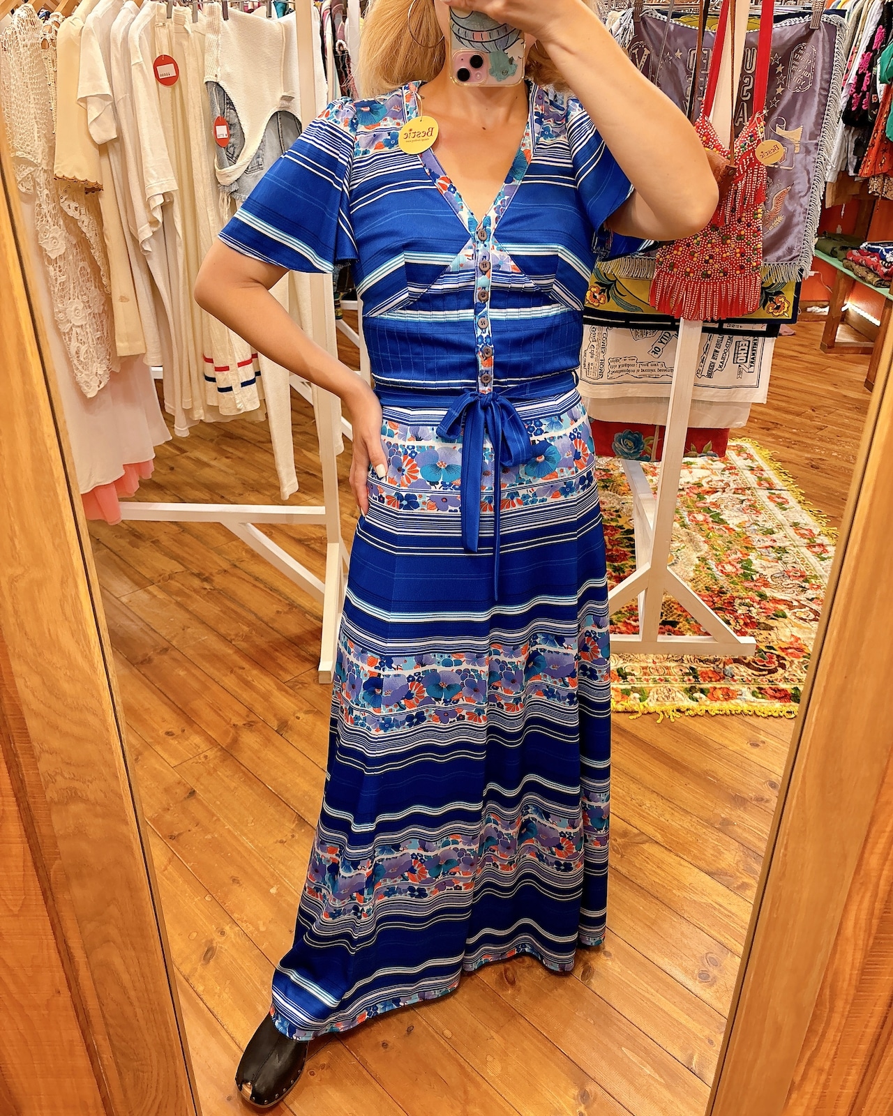 パキッとしたブルーにレトロな花柄とボーダーのコンビがとてもかわいいです。ボディラインを綺麗に見せてくれるシルエットもはなまるです。