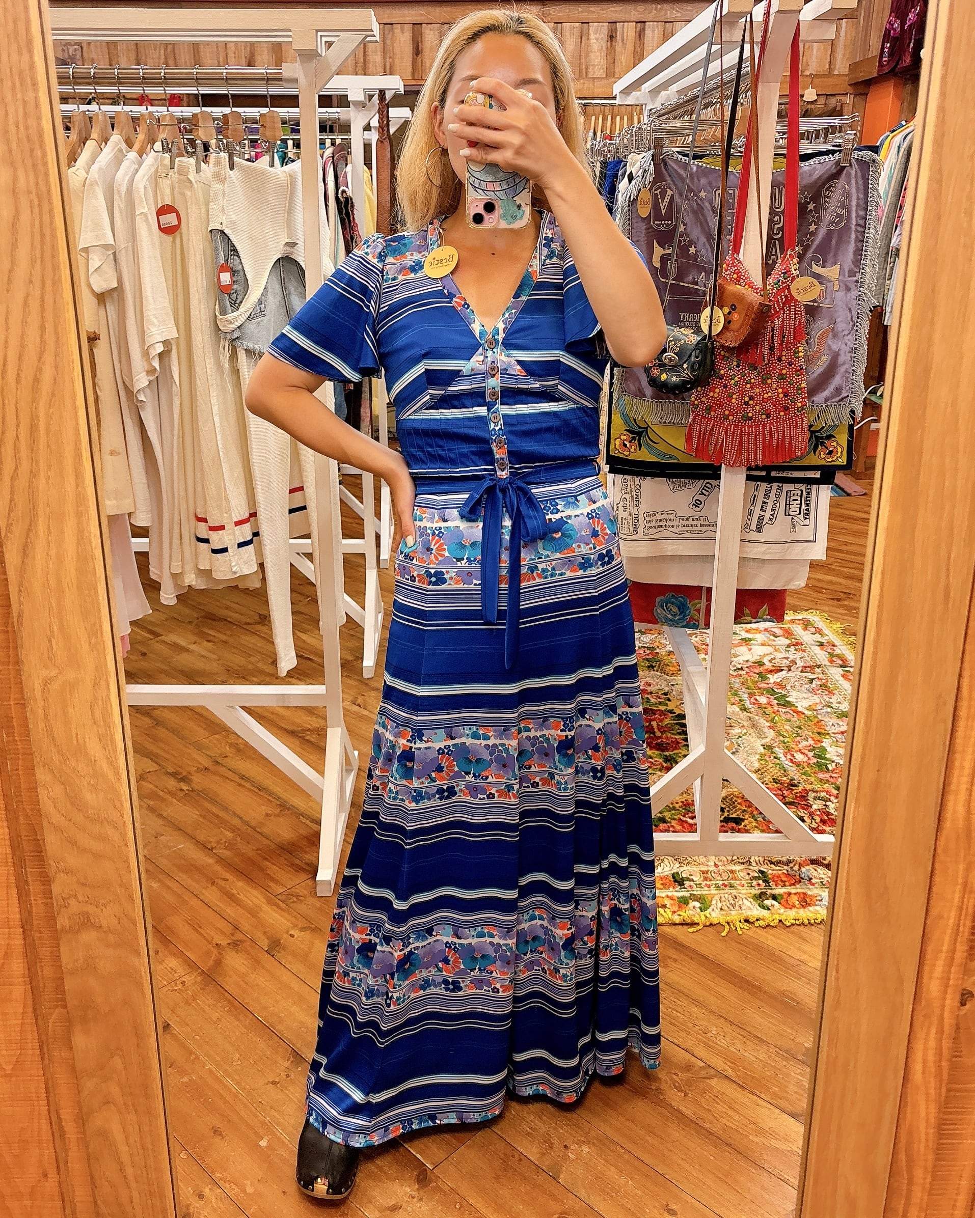 【70s S/S 後ジップワンピース花柄ボーダー柄vintage】
