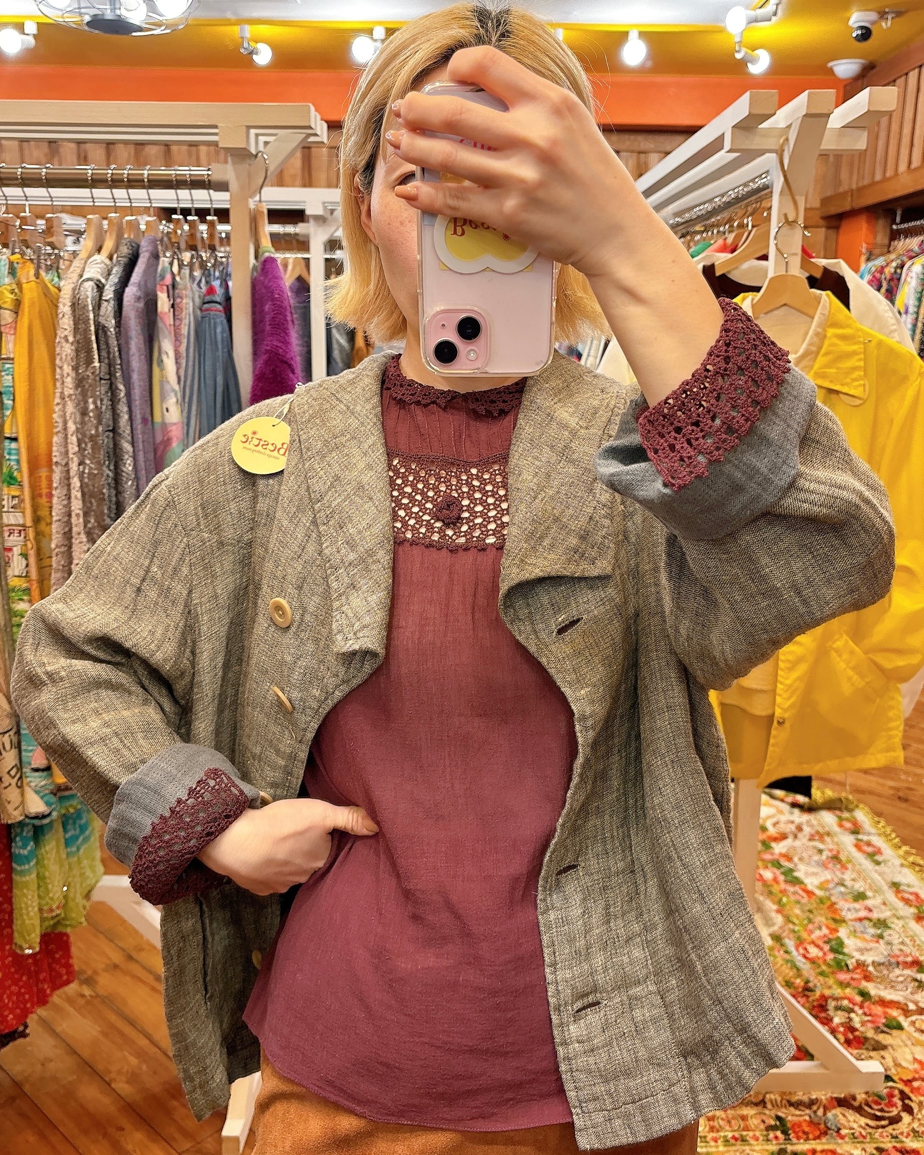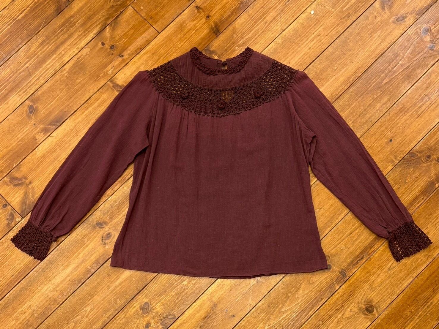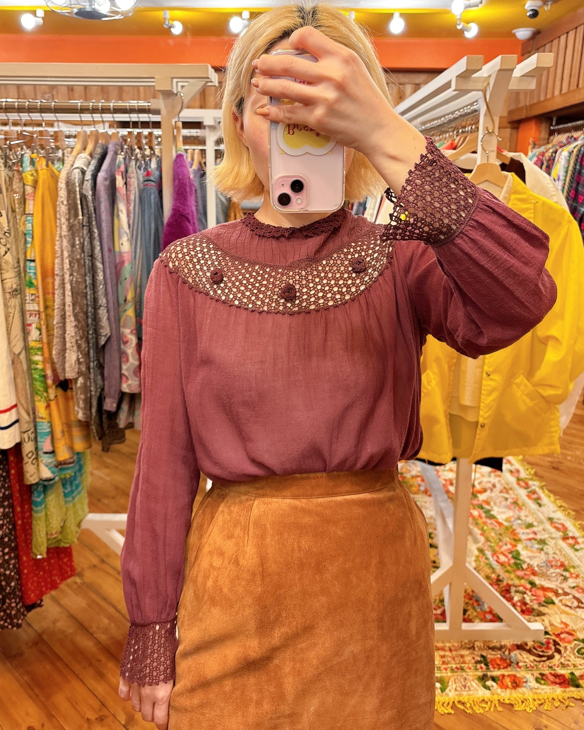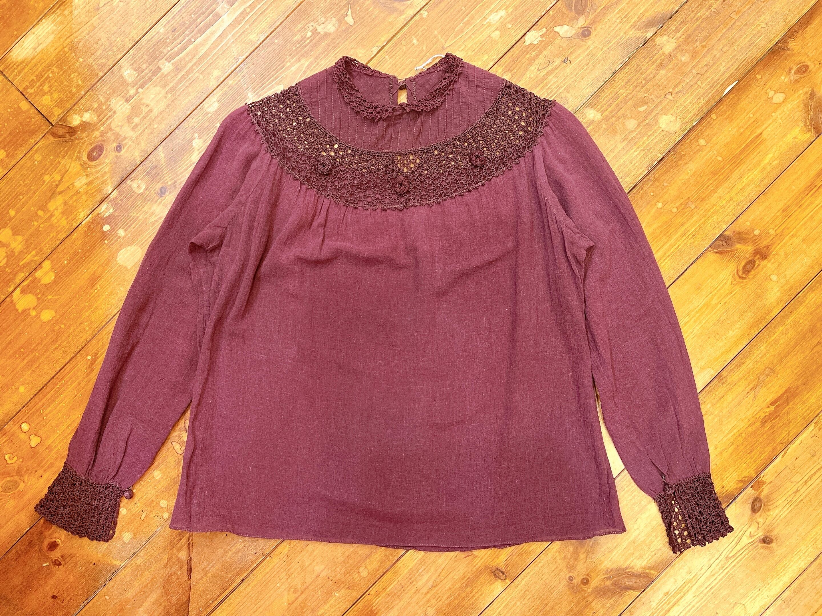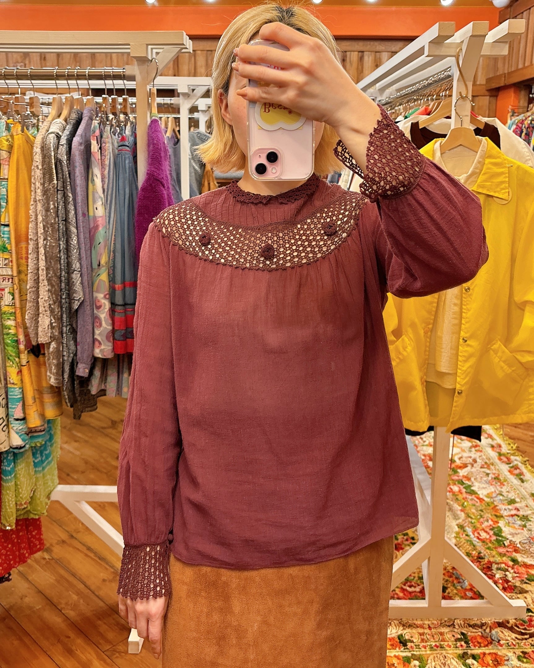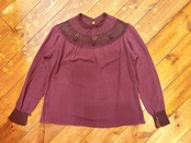 襟、胸元、袖にレース編みの施されたプルオーバーブラウスです。