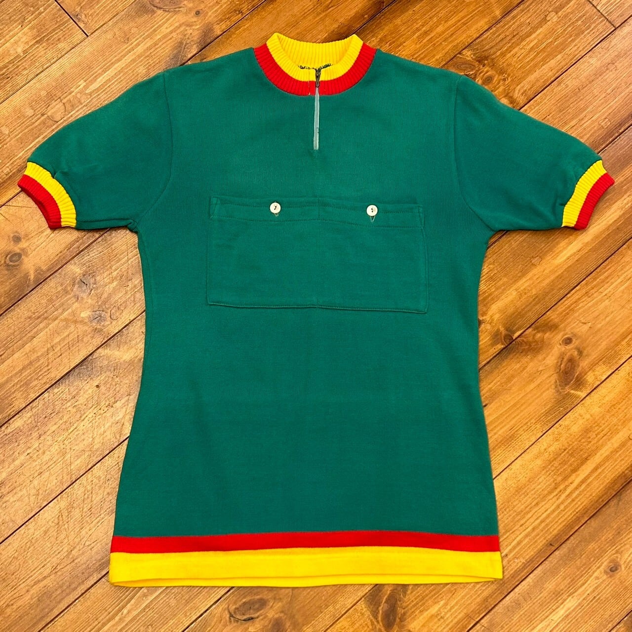 グリーンに赤、黄色のかわいいふちのはいったサイクリングジャージです。各ポッケにボタンがついてるのもいいですね。
