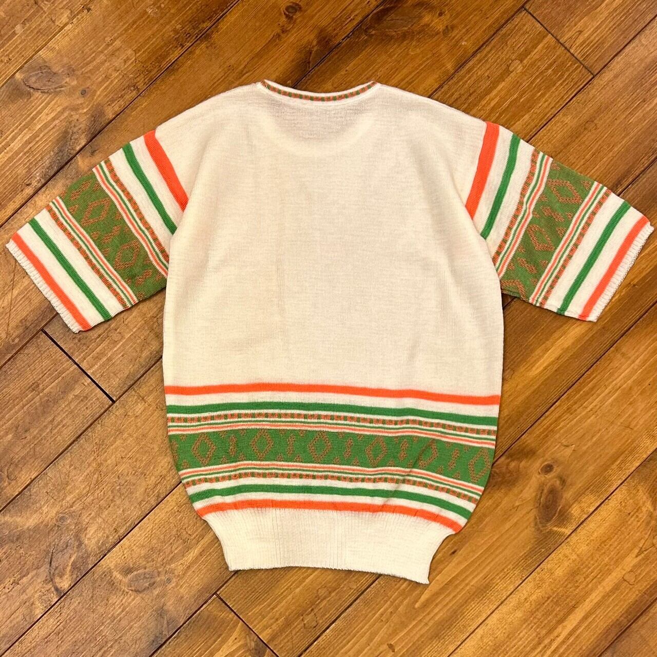 袖と裾のジャガード編みのデザインがかわいい半袖ニットです。ユーロの古着らしいレトロな配色もgood!