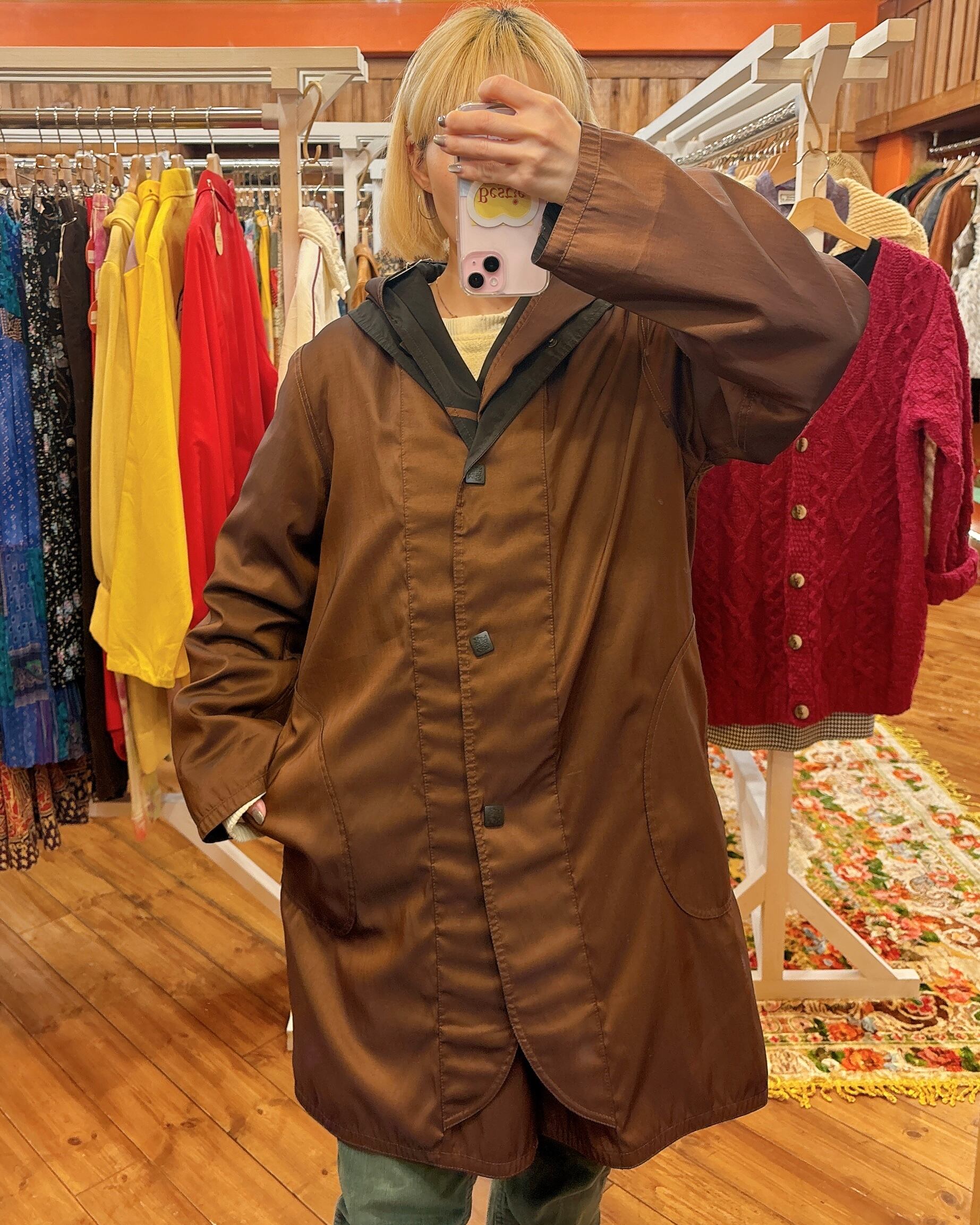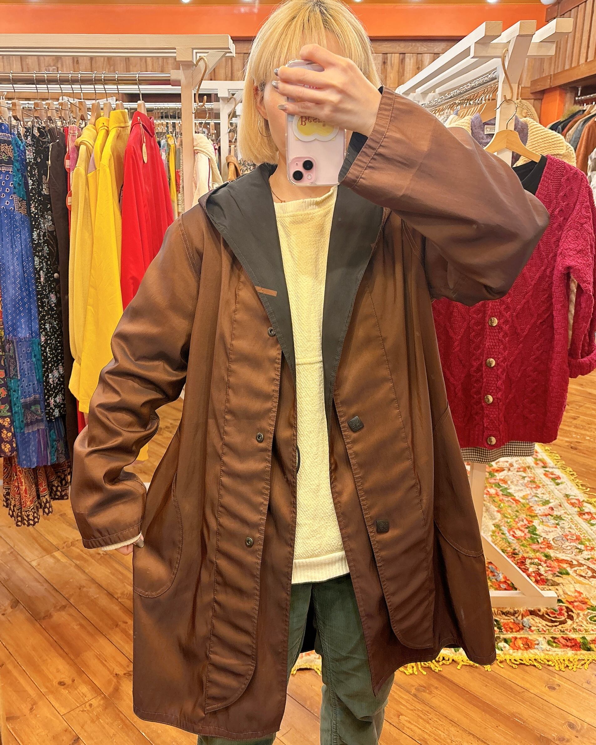 茶と黒のダークカラーのリバーシブルですが、茶色はツヤありでスナップボタン、黒は柄入りでレイヤードするような前合わせのデザインとトグルボタンになっています!