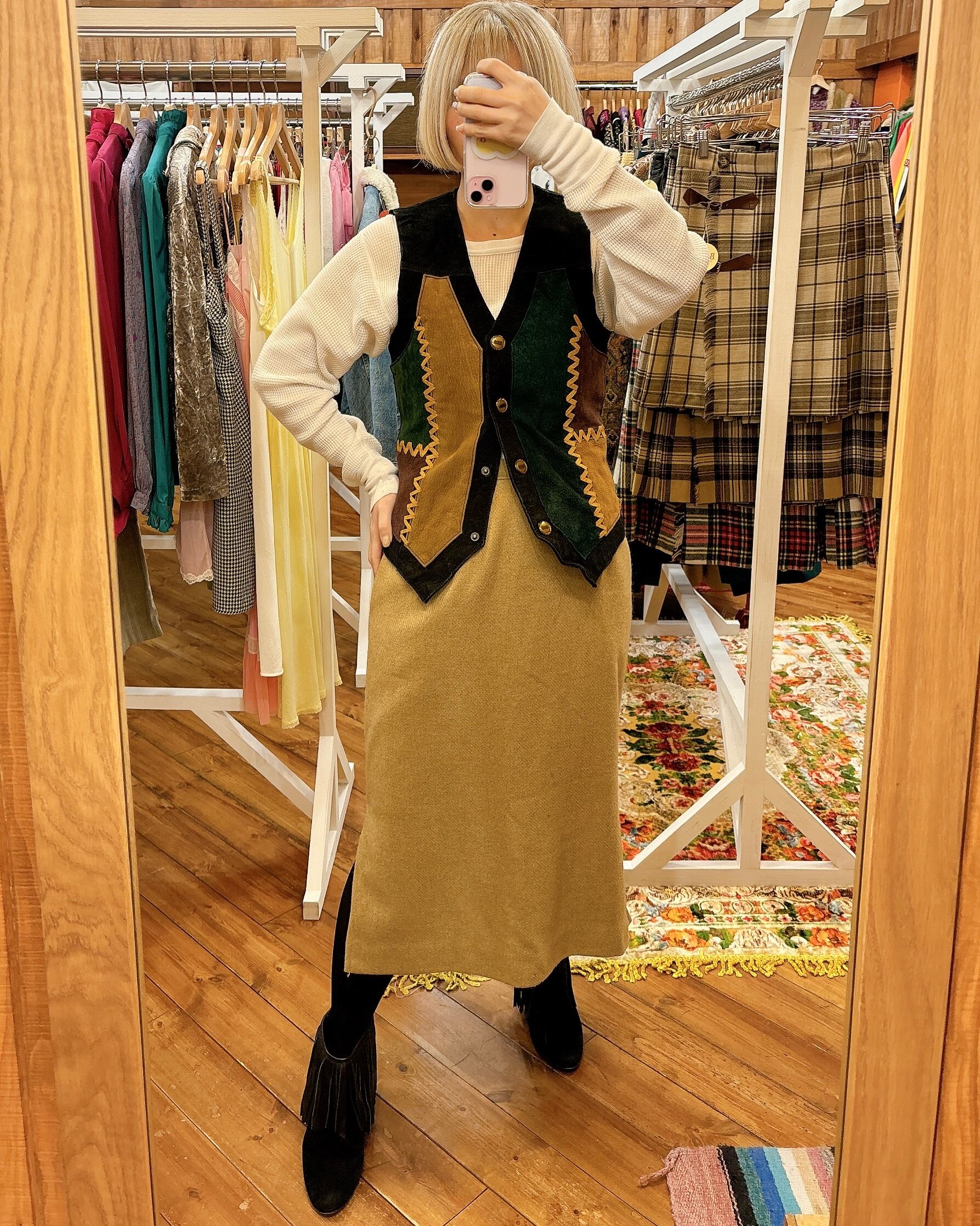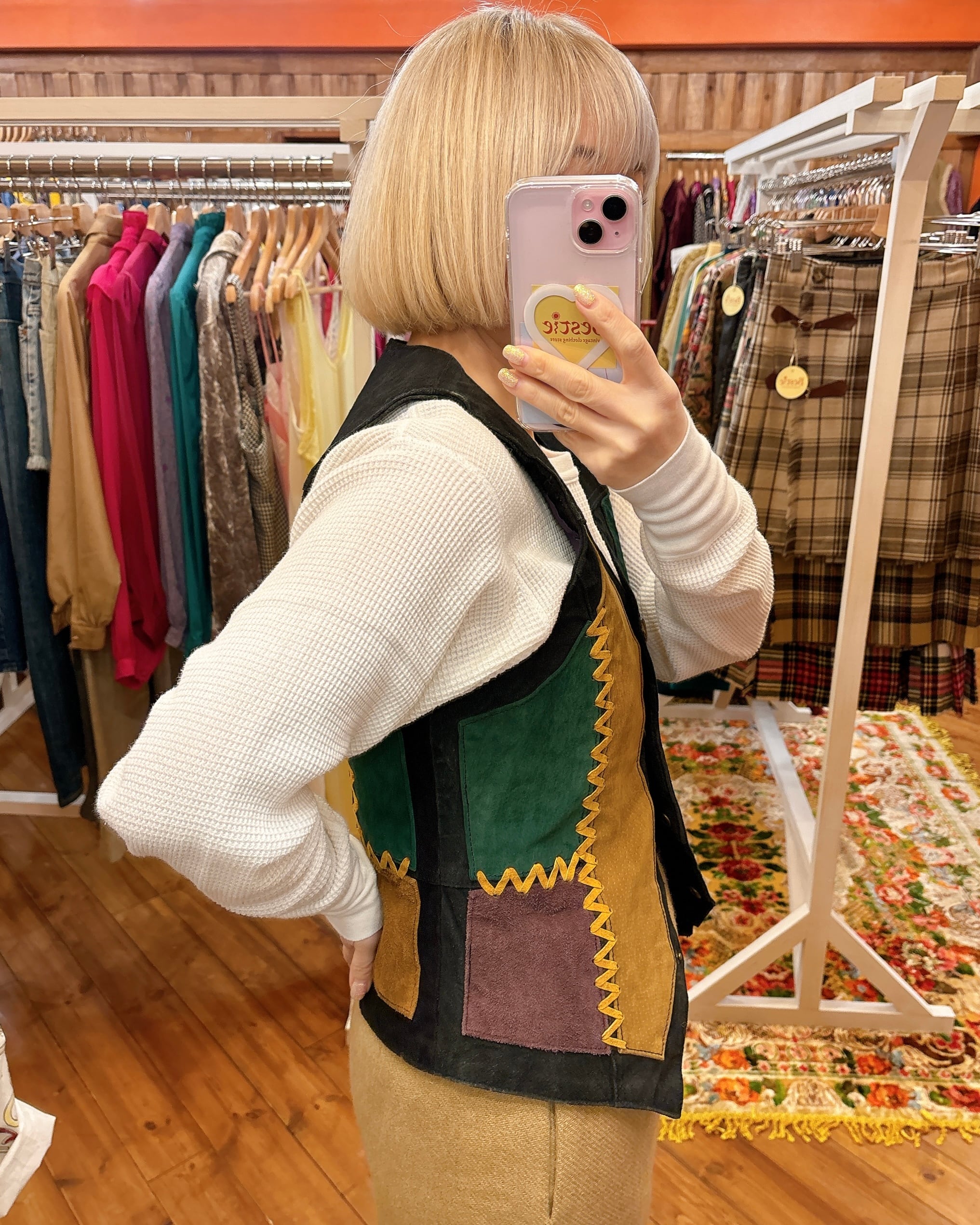 スリムなシルエットとパッチワークのデザインが個性的です。カラースエードの色味がきれいです。