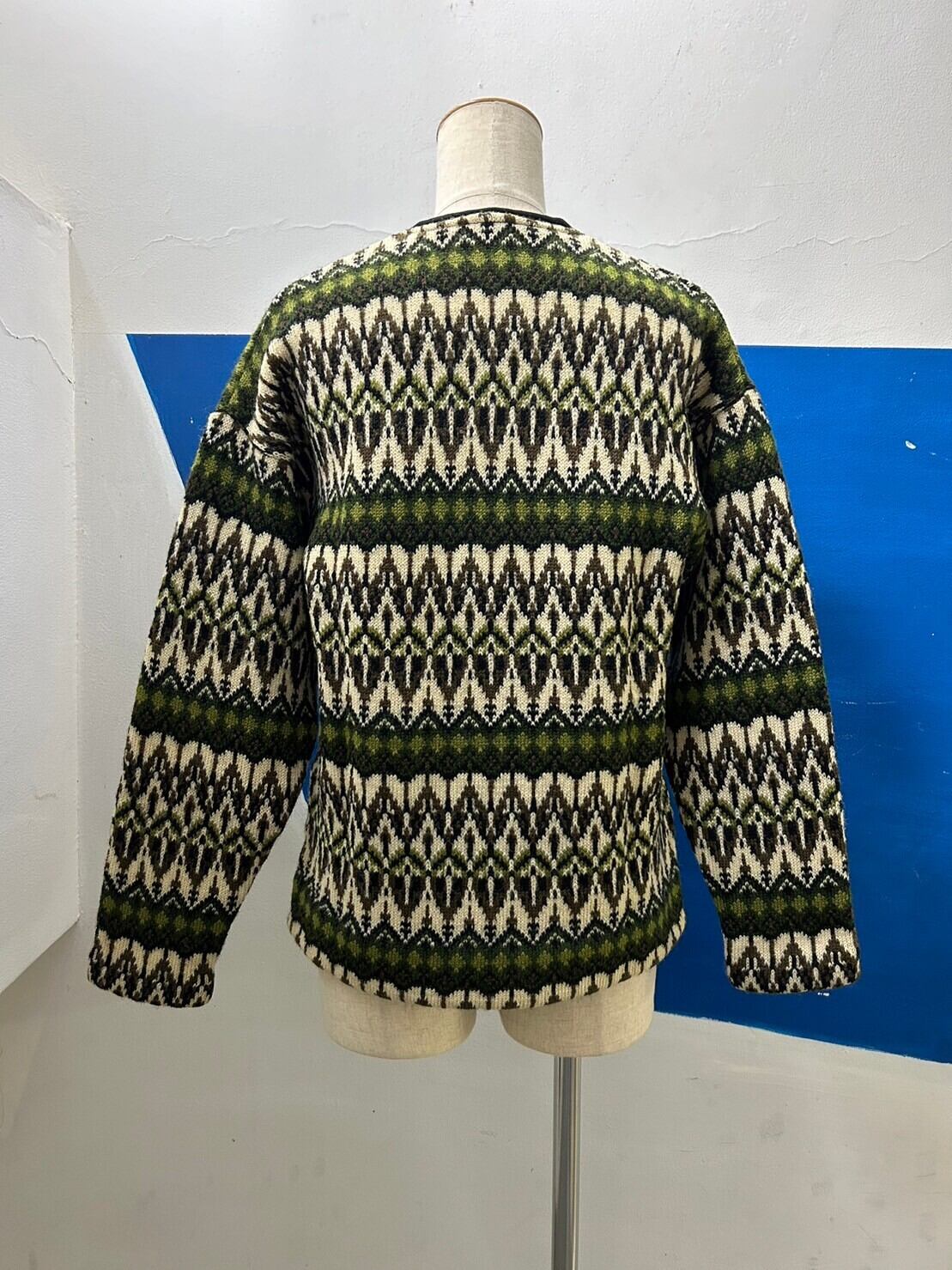 カーキグリーン系のノルディック柄がきれいなジャガードセーターです。北欧の空気感じる一着で、雰囲気あってわくわくします。ボトムスはデニムでシンプルな合わせを楽しんで欲しいです。
