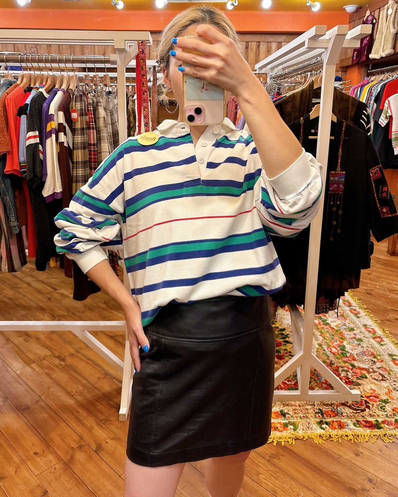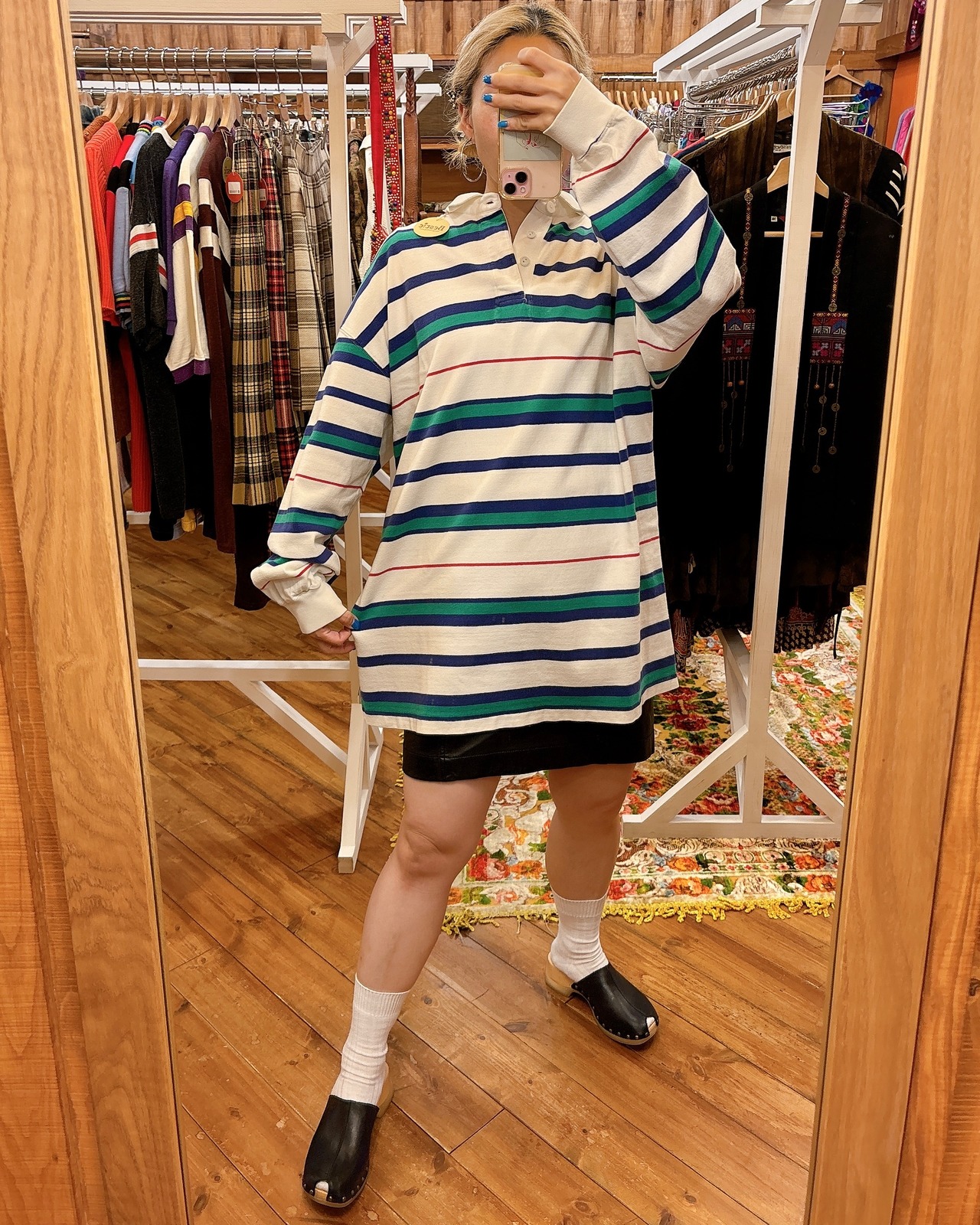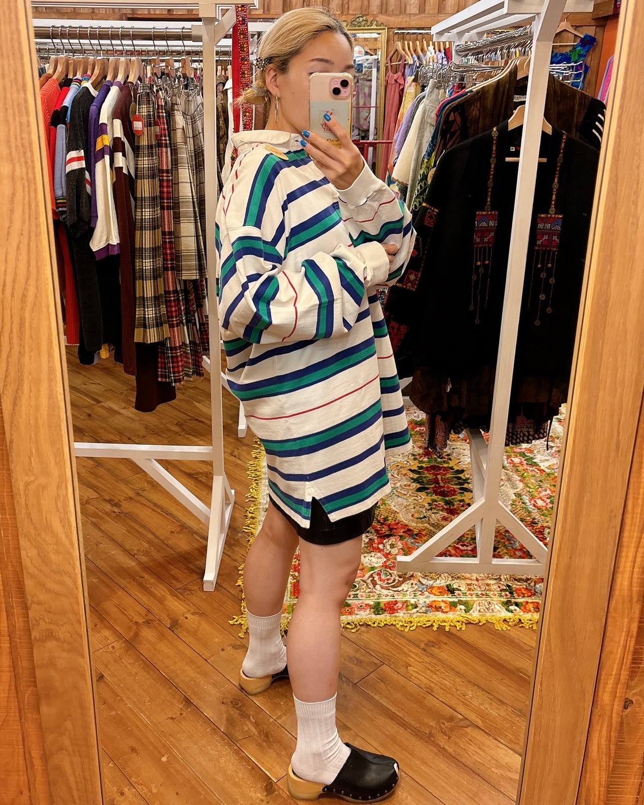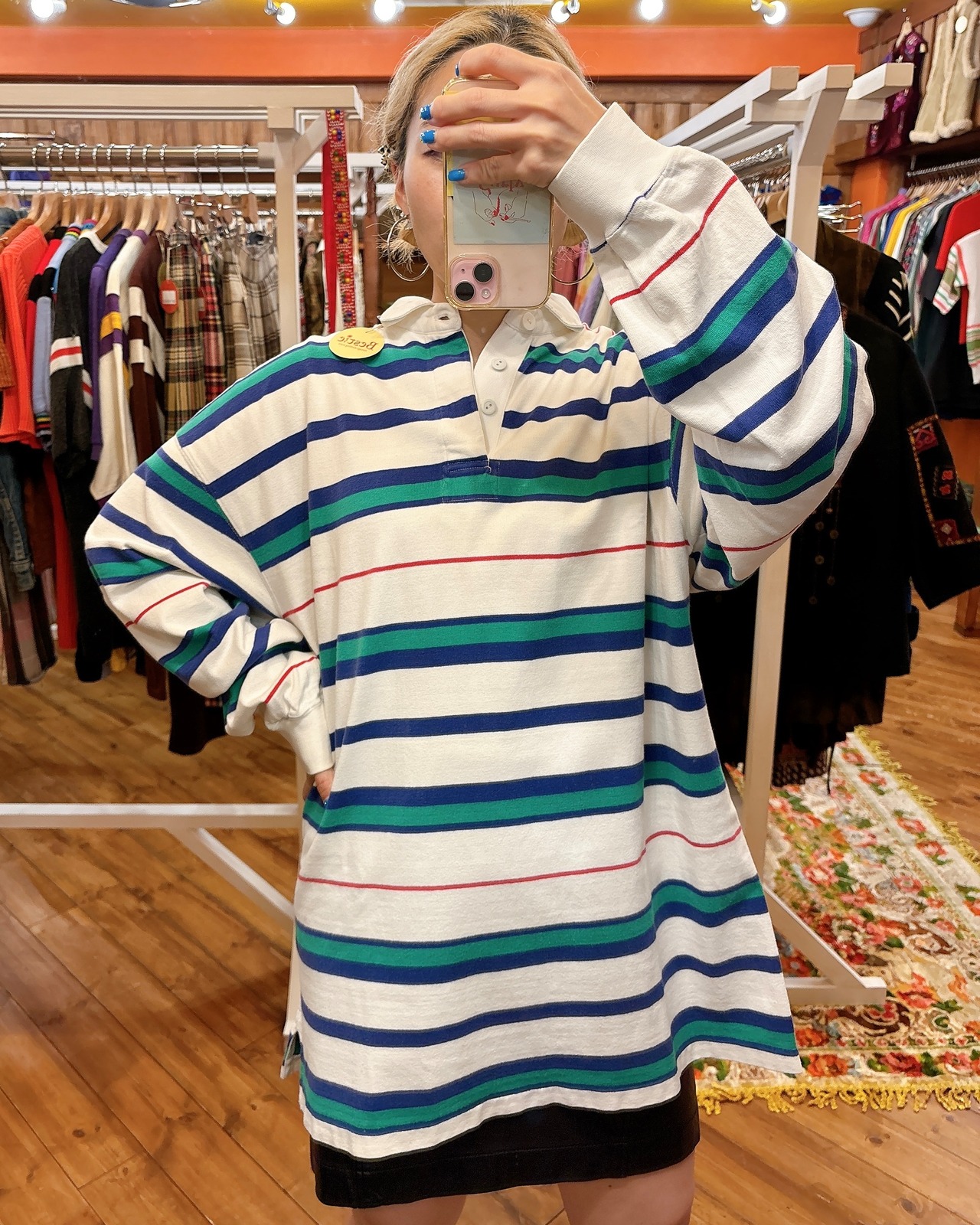 白に爽やかなマルチボーダーがかわいいラガーシャツです。サイズも大きめなので、男女問わずおすすめです♪