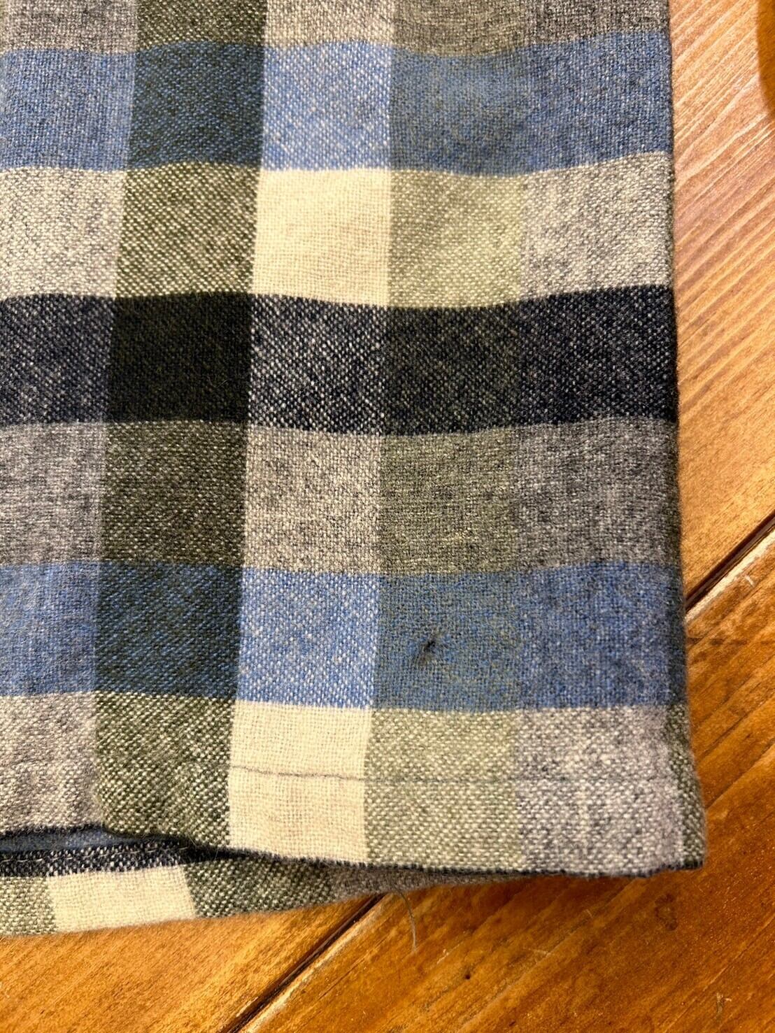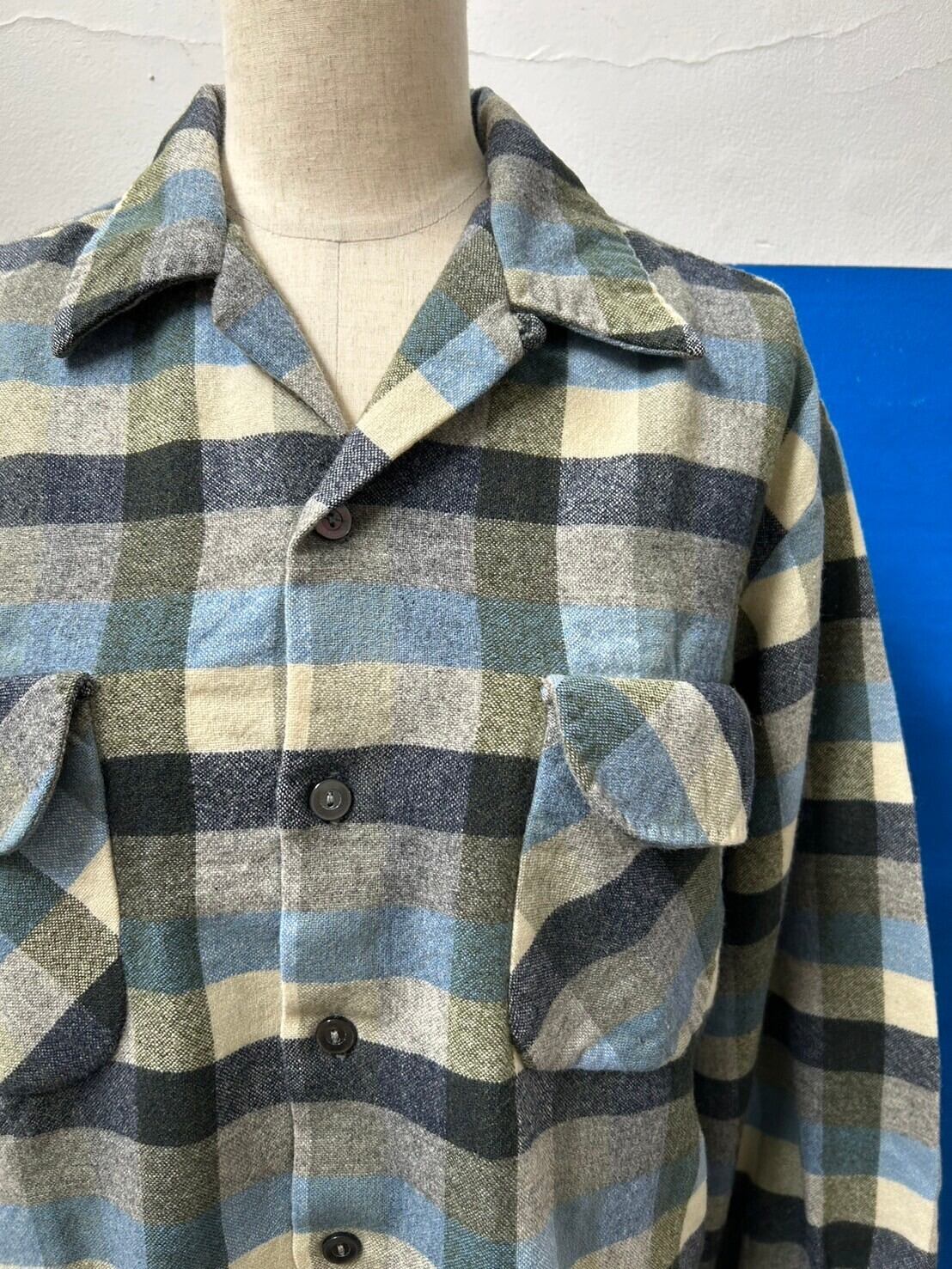 ウォッシャブルウールのオープンカラーチェックシャツです。小穴のある箇所がありますが、古着らしい風合いとして楽しめる範疇と思います。