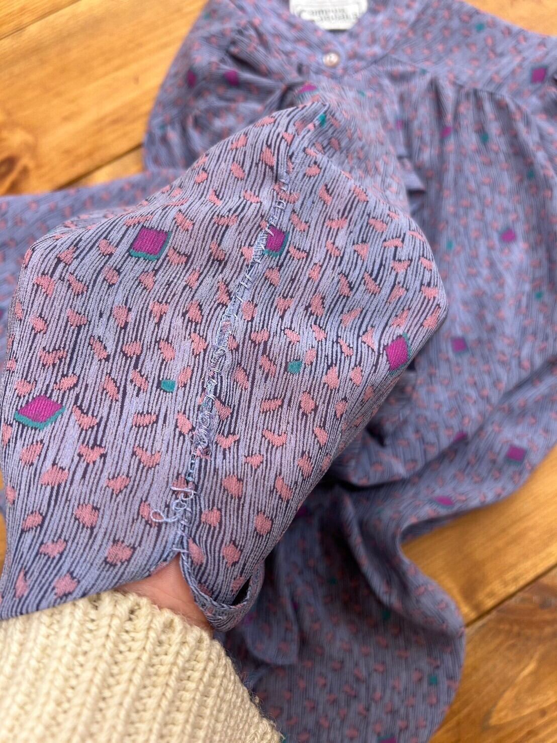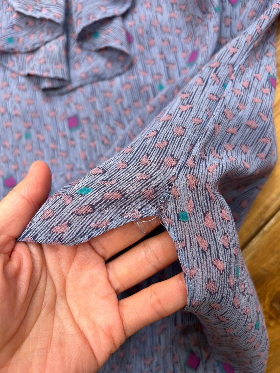 細かい総柄とフリルのデザインがかわいいブラウスです。比較的小さめサイズ。小柄な女性の方にオススメします。