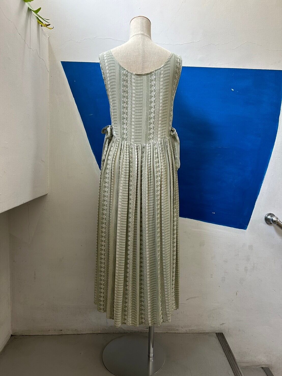 淡い色味の総柄がかわいいノースリーブワンピースです。裏地なし、スカート部分はフロントボタンになっています。やや透け感あり。
