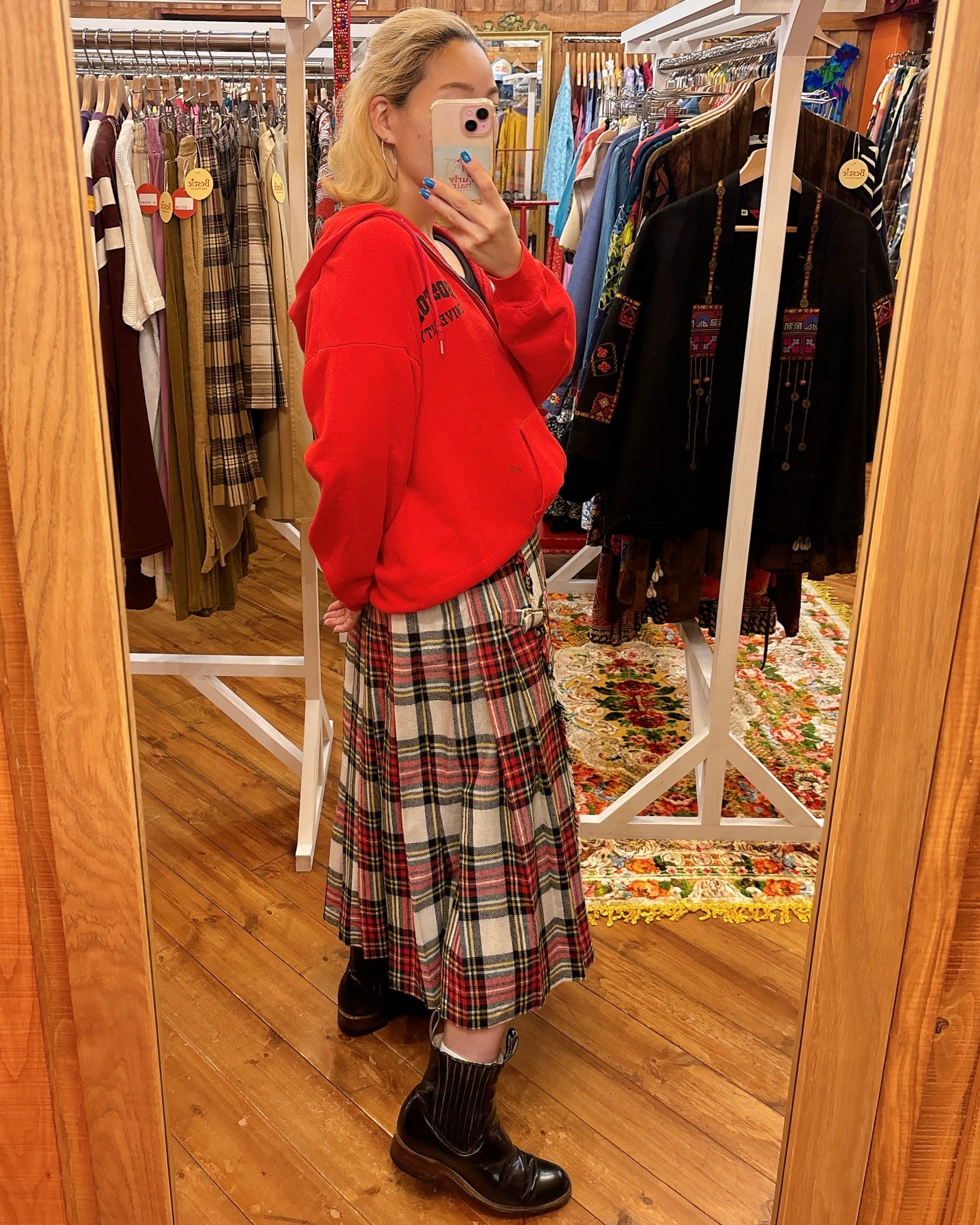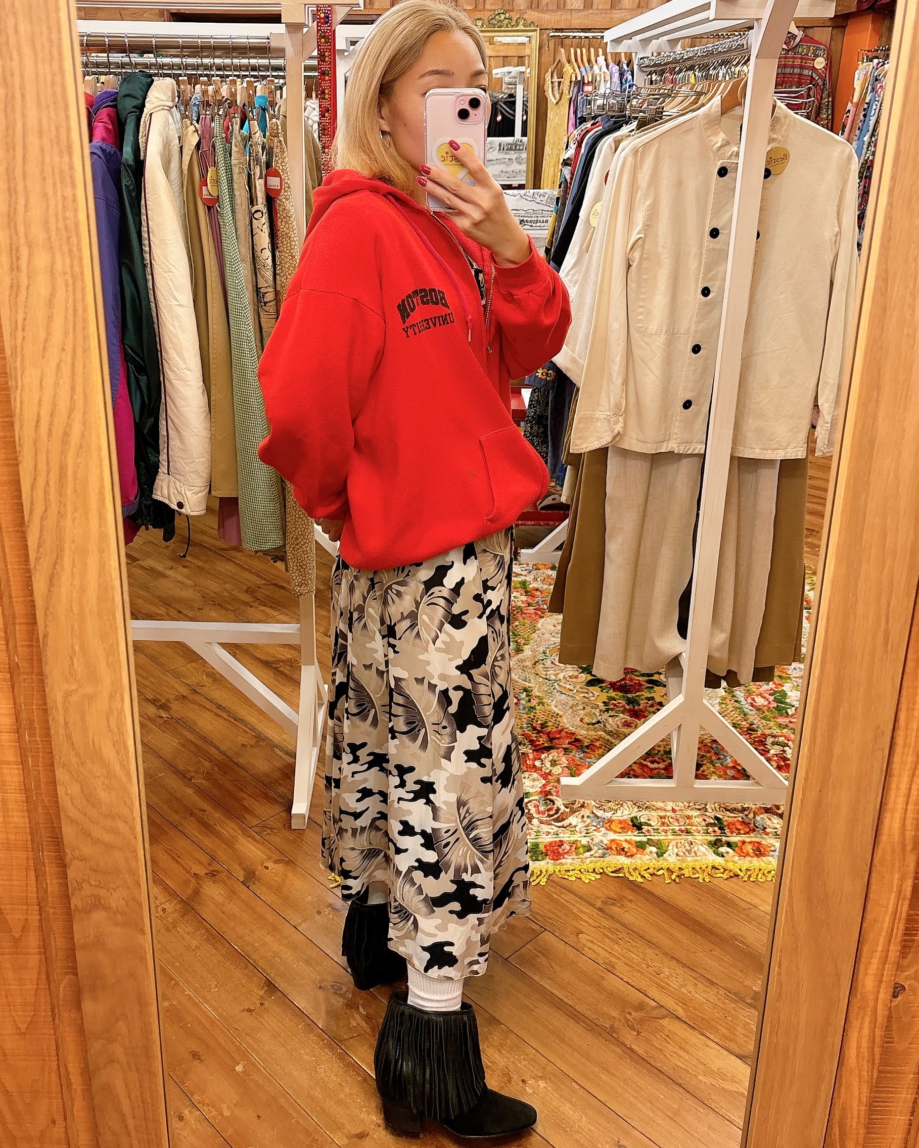 胸元にロゴ、赤いスウェット生地で古着らしい古着でかわいいです。男女問わずおすすめ。デニムに白Tシャツでシンプルに合わせてもかわいいですね。