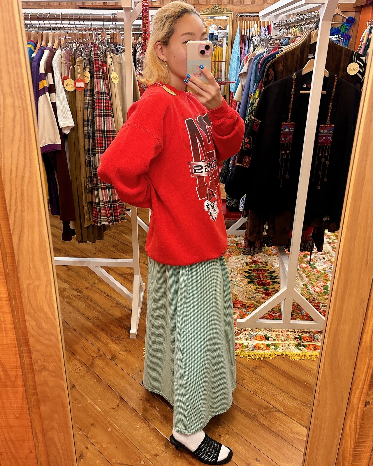 いい具合に着込まれたプリントスウェットシャツです。赤のスウェットは古着らしさが増す気がして、コーディネートの主役にもおすすめです。