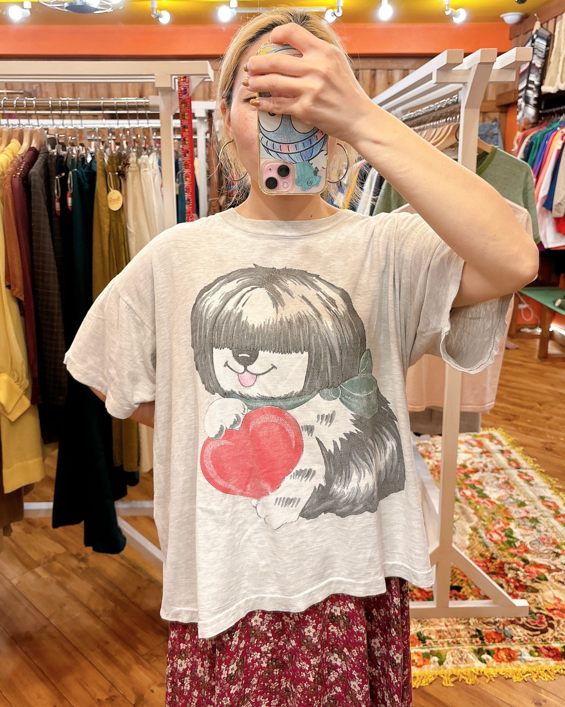 シーズーのような前髪長めのわんちゃんがかわいいTシャツです。ボックスシルエットでなんかいい形のボディなのもポイント高いです。